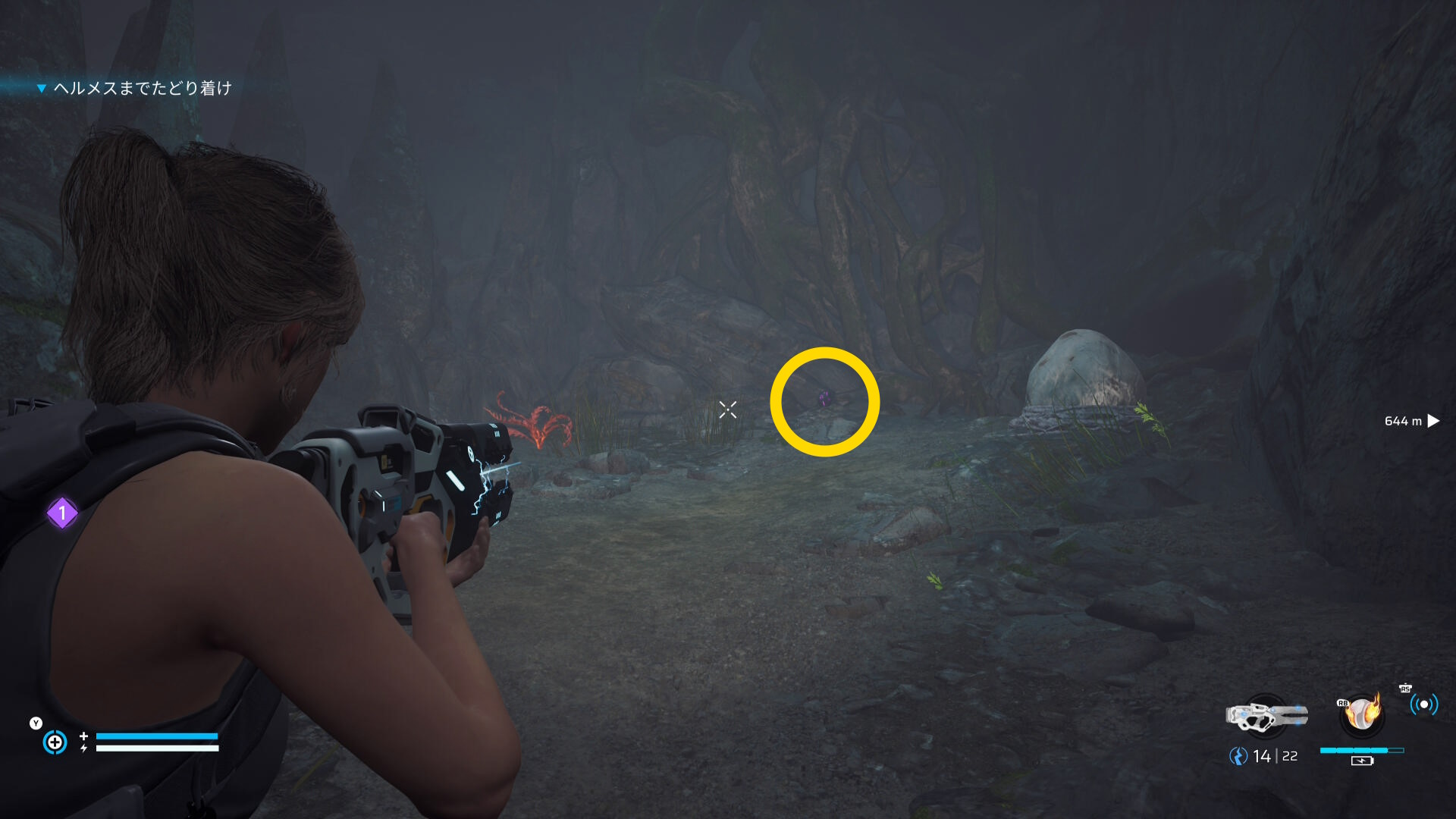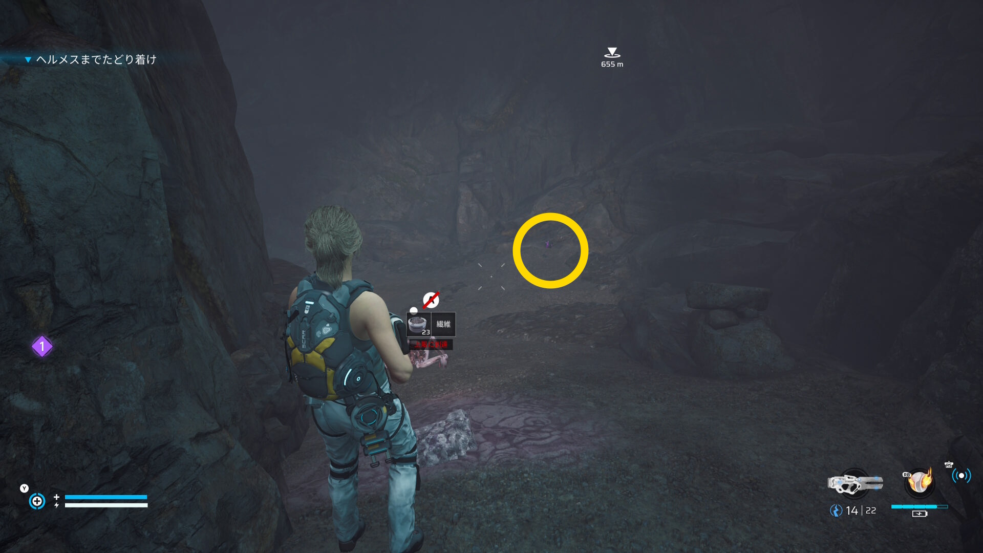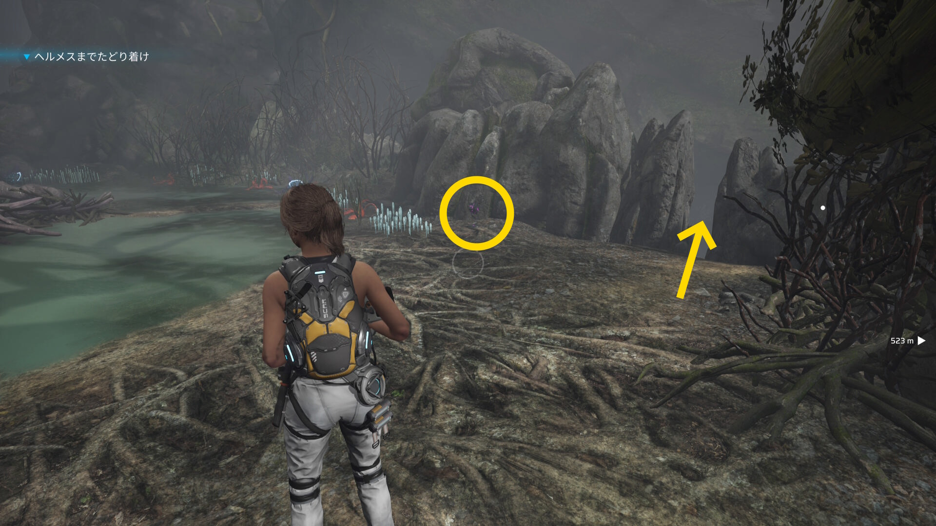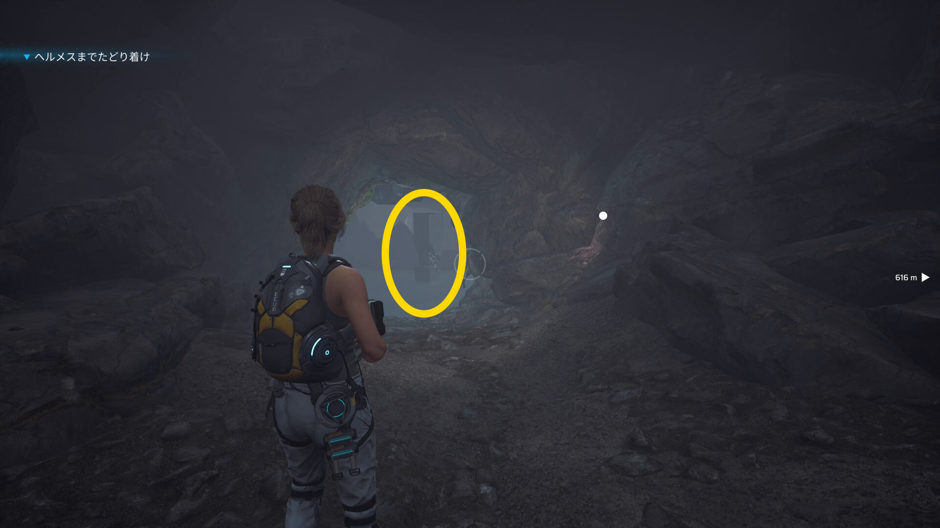 - 洞窟を進むと奥に エイリアンの柱(5/17) が見えてくる。なお、その手前右壁に「フレッシュの死骸」があるが調べても調べなくてもオーケー(下画像、右側の白い◯)