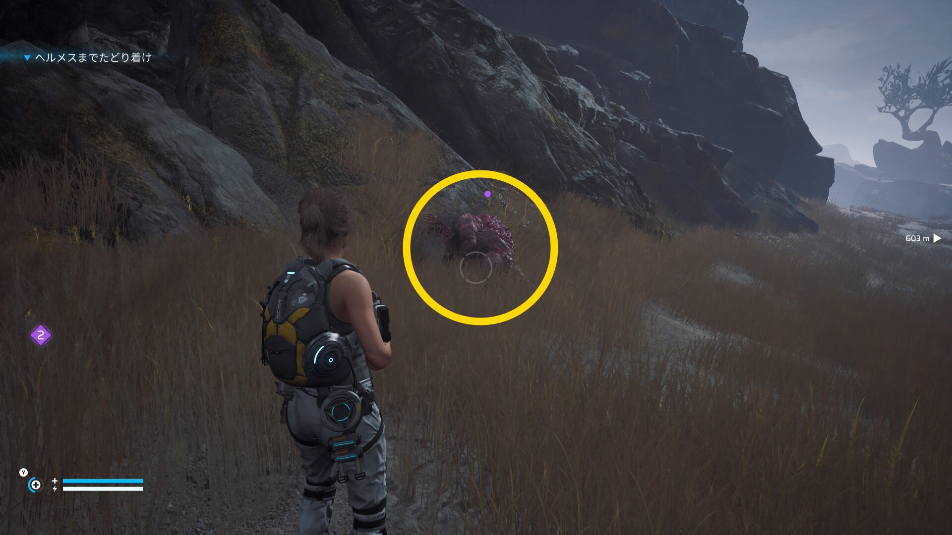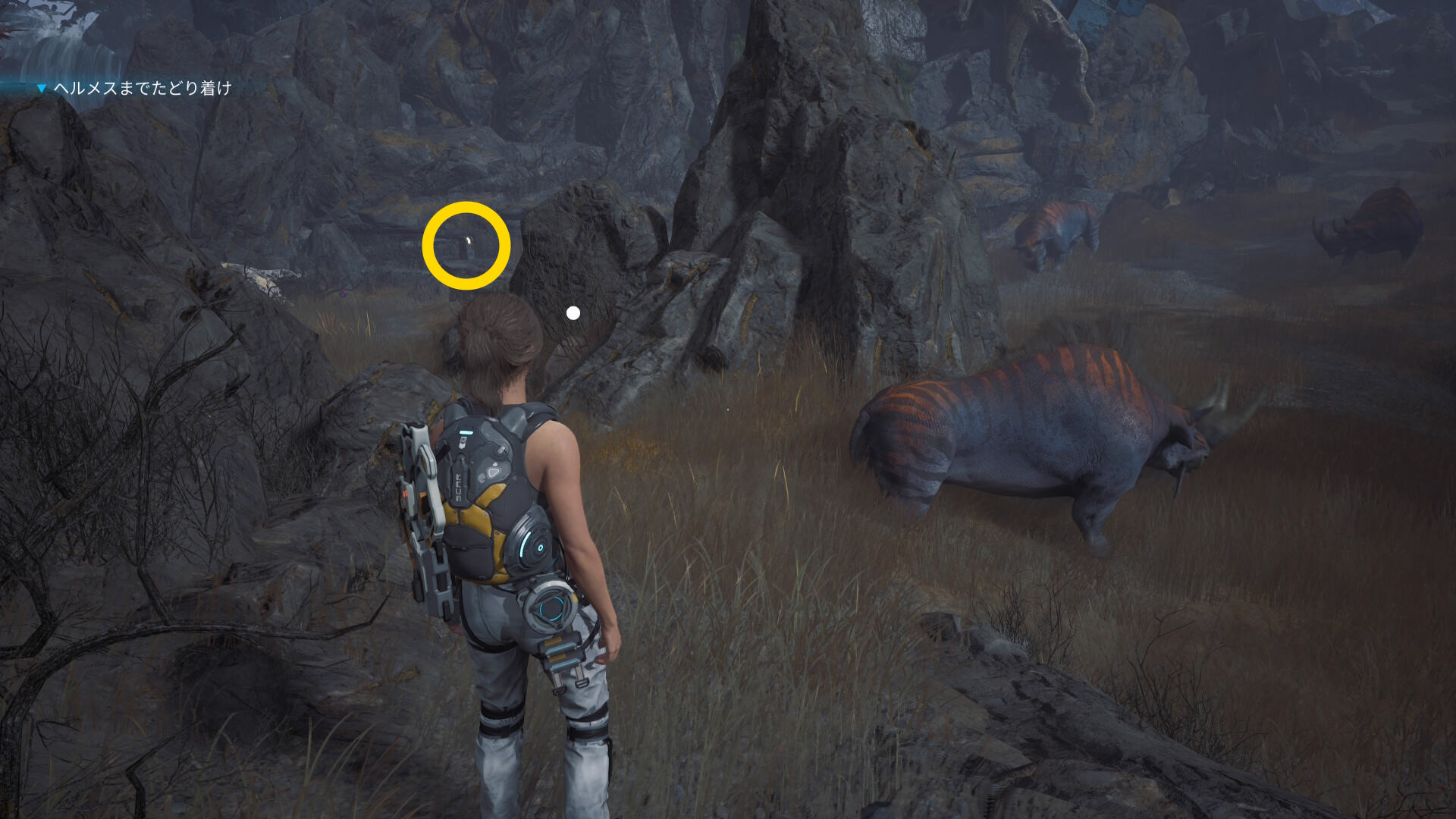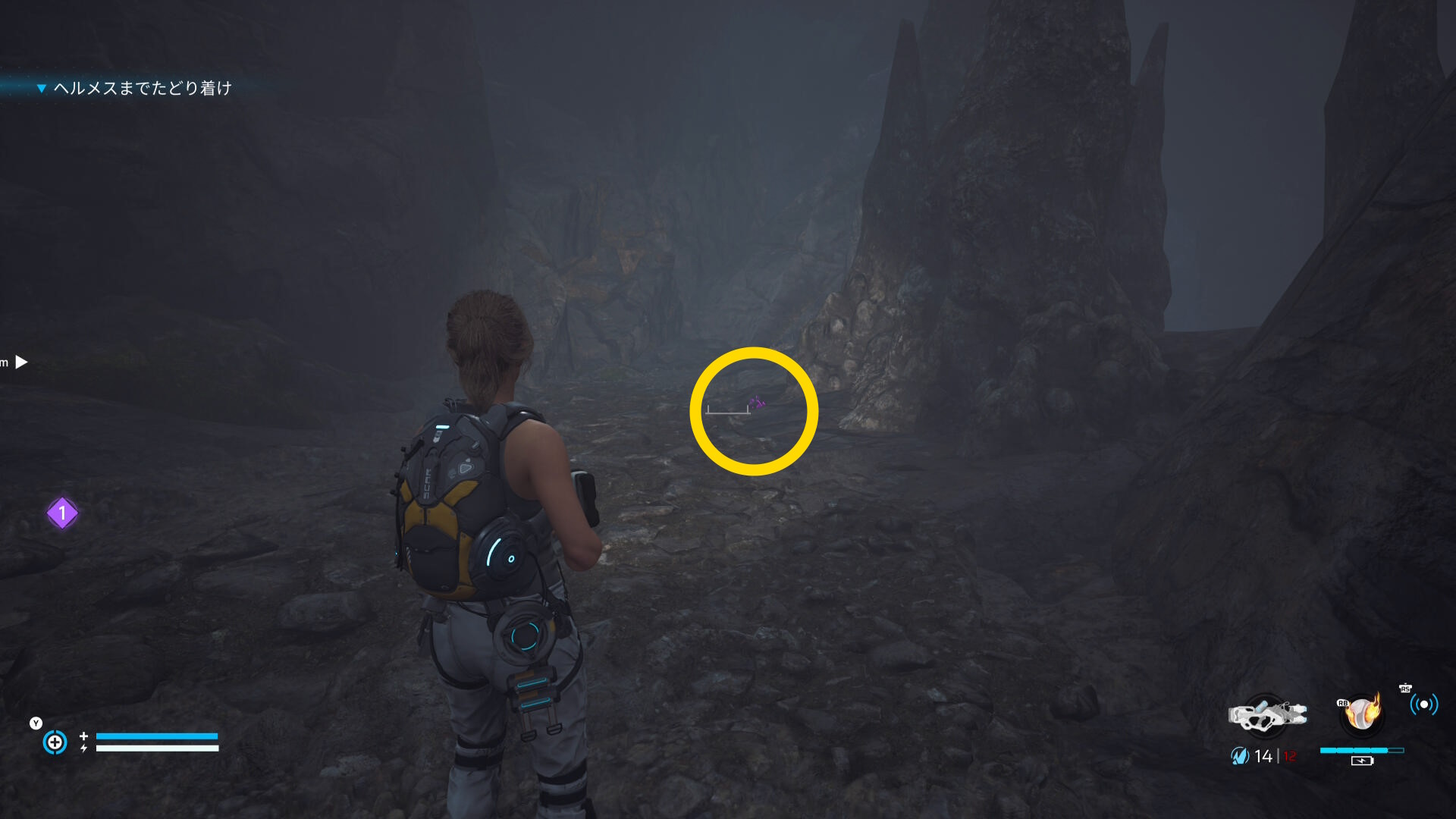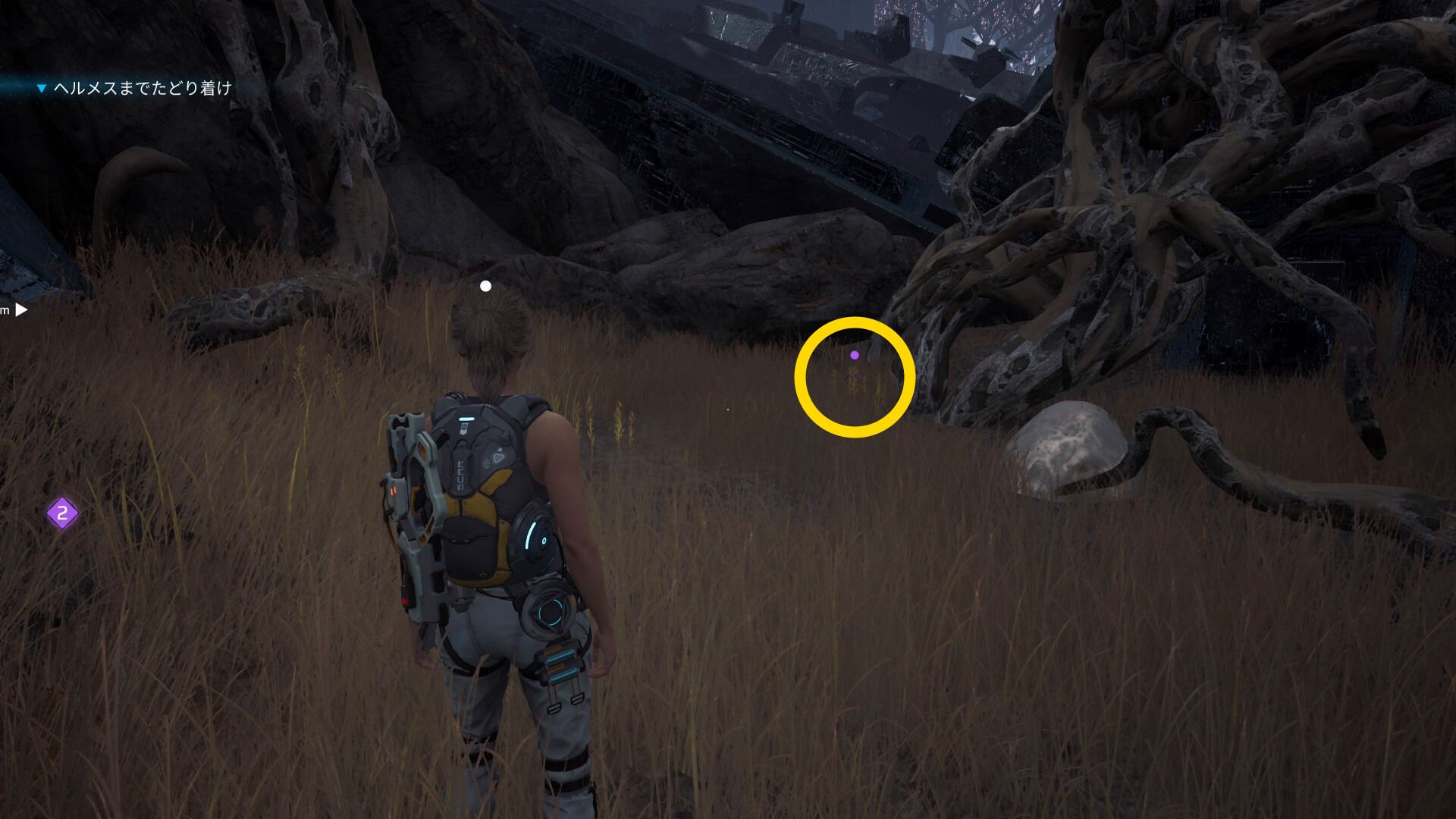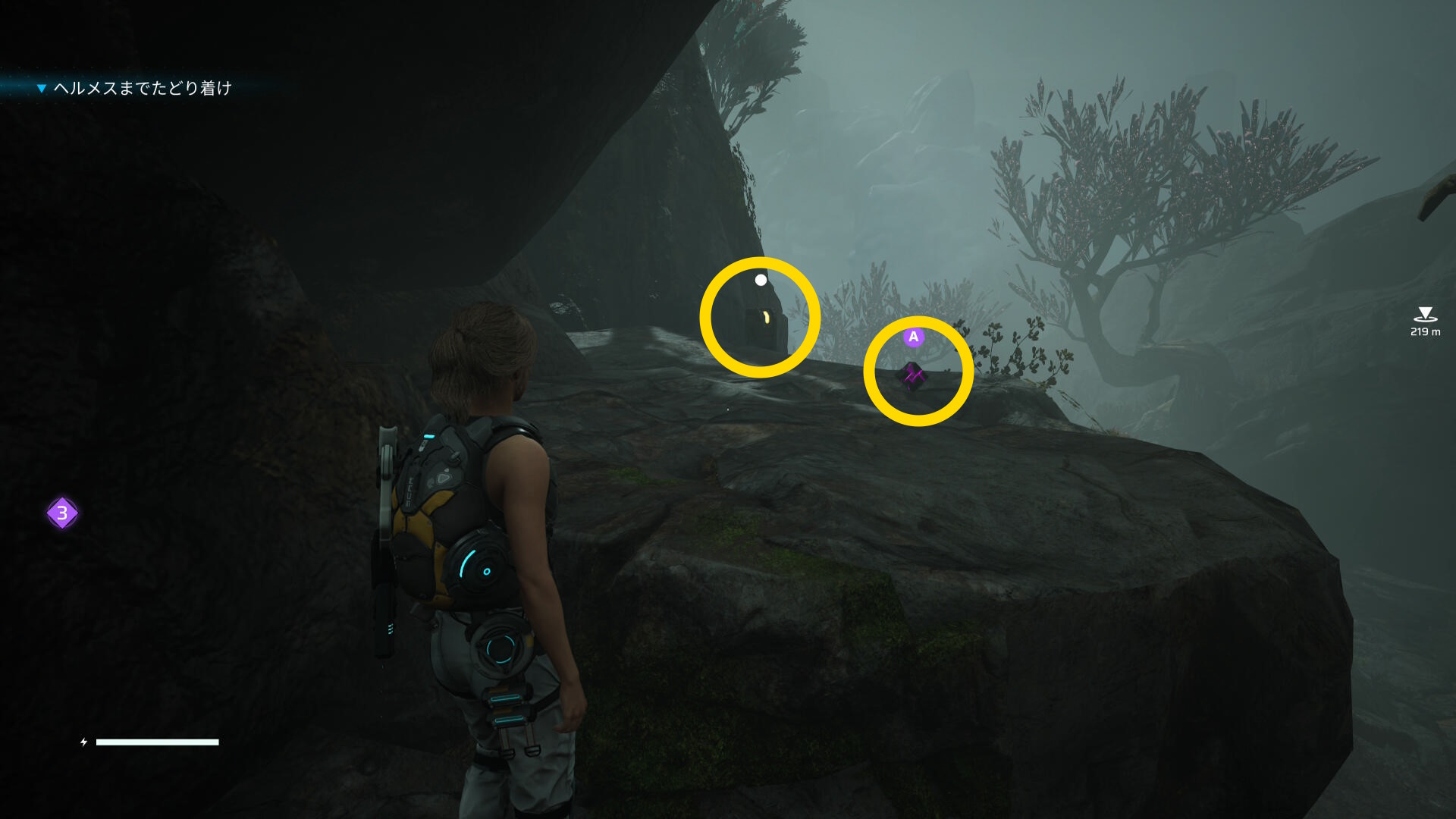- 洞窟を進むと奥に エイリアンの柱(5/17) が見えてくる。なお、その手前右壁に「フレッシュの死骸」があるが調べても調べなくてもオーケー(下画像、右側の白い◯)