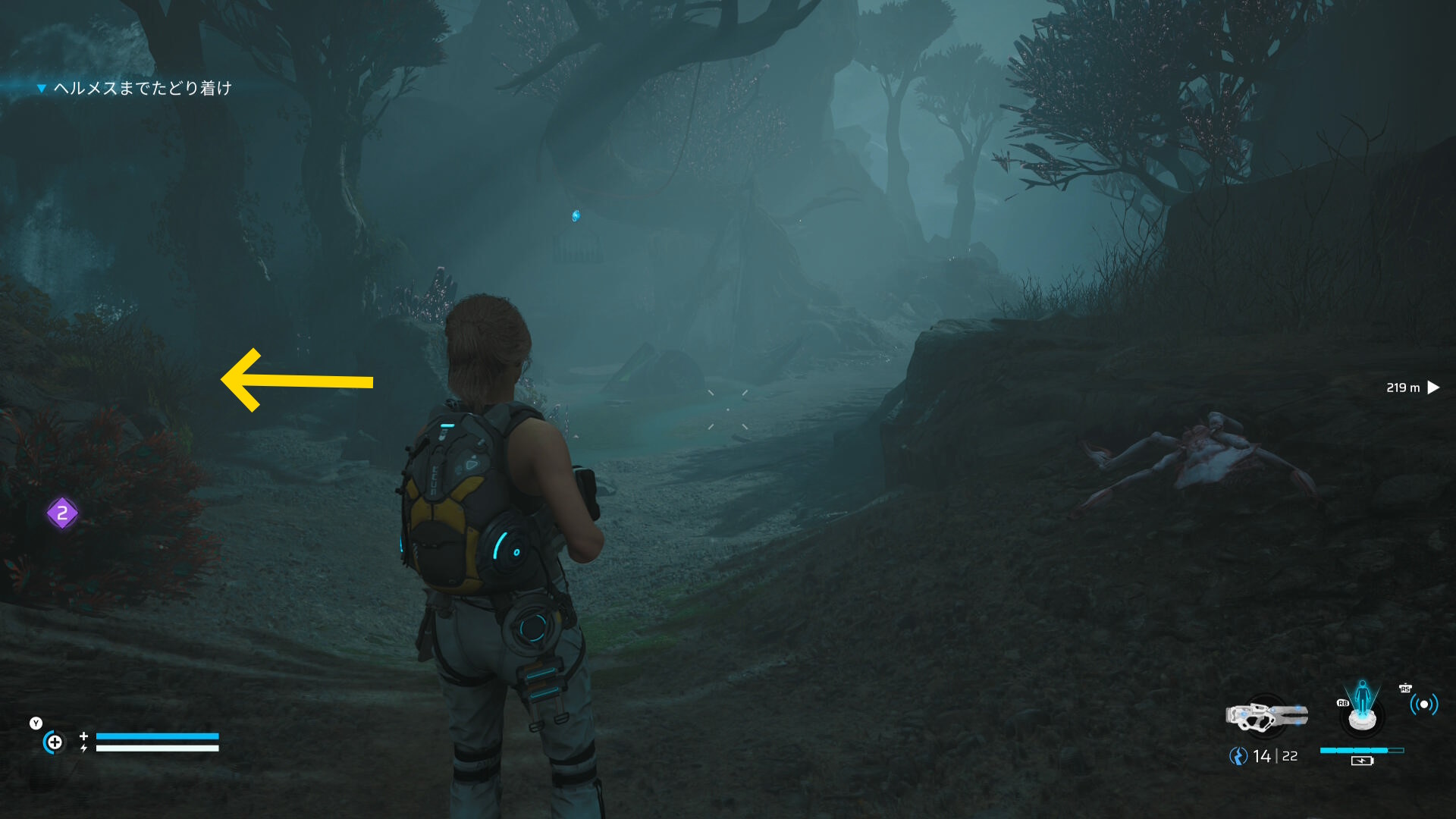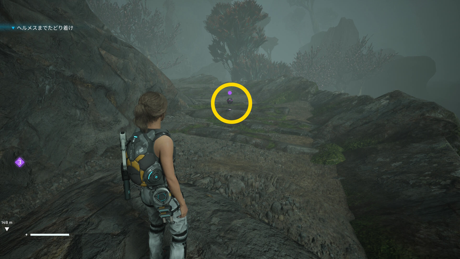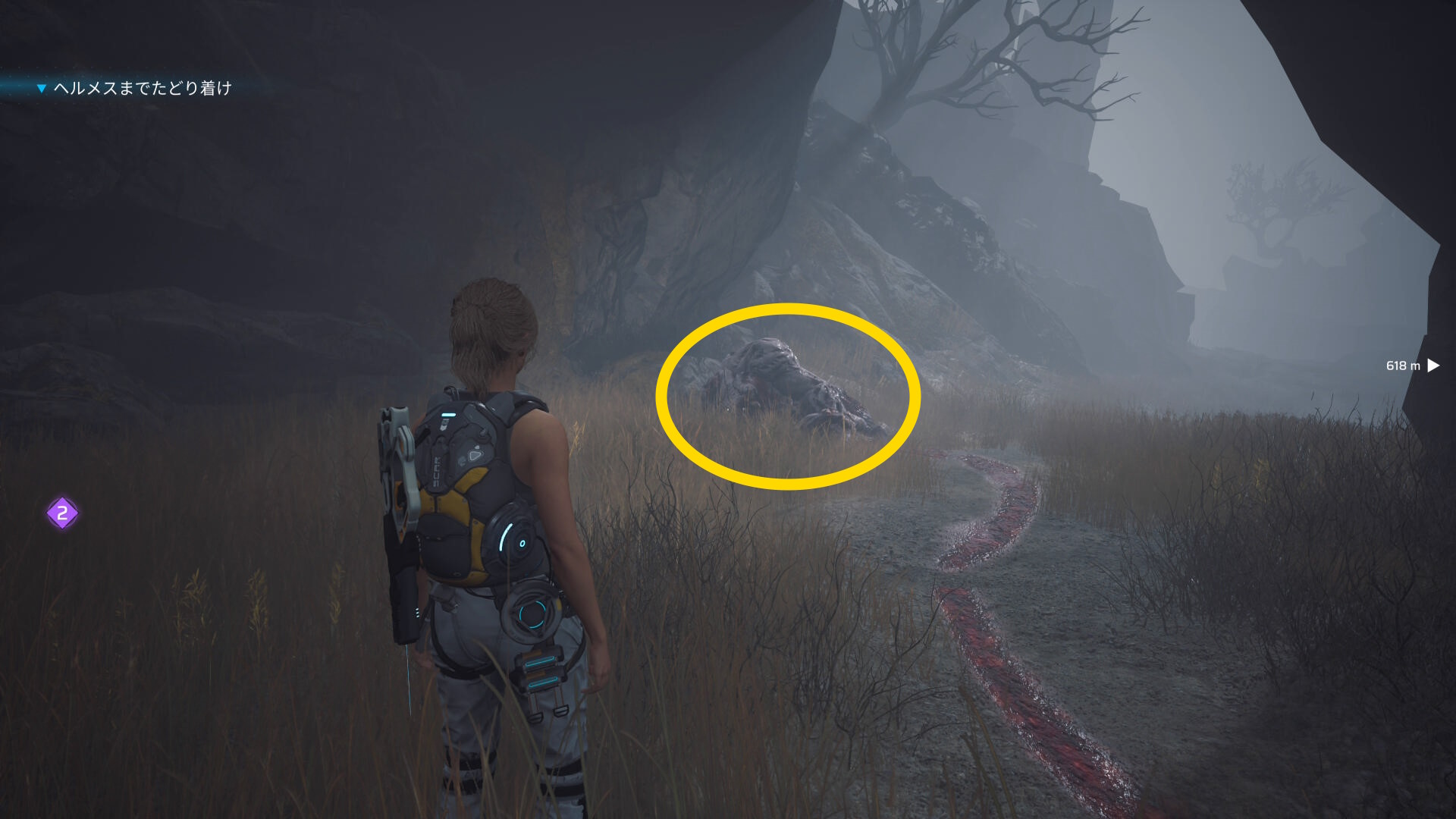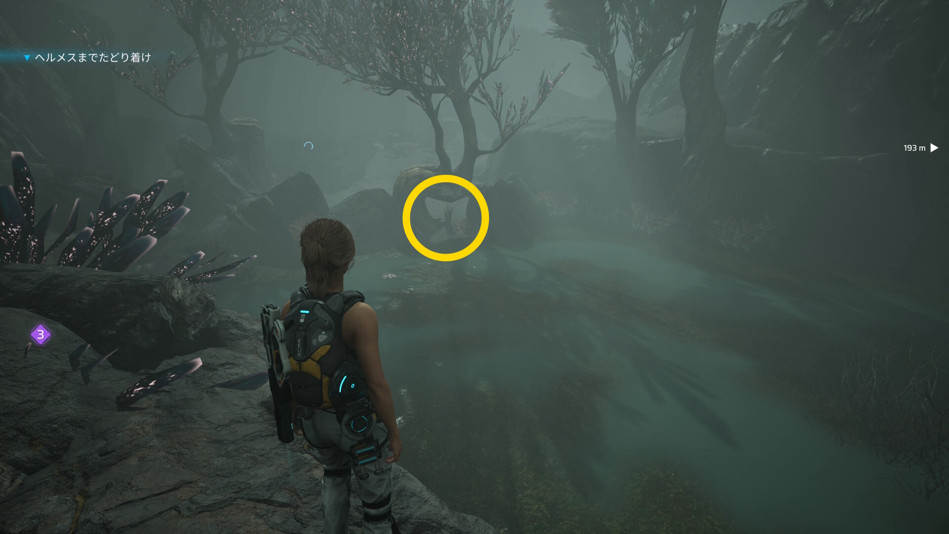 - 洞窟を進むと奥に エイリアンの柱(5/17) が見えてくる。なお、その手前右壁に「フレッシュの死骸」があるが調べても調べなくてもオーケー(下画像、右側の白い◯)