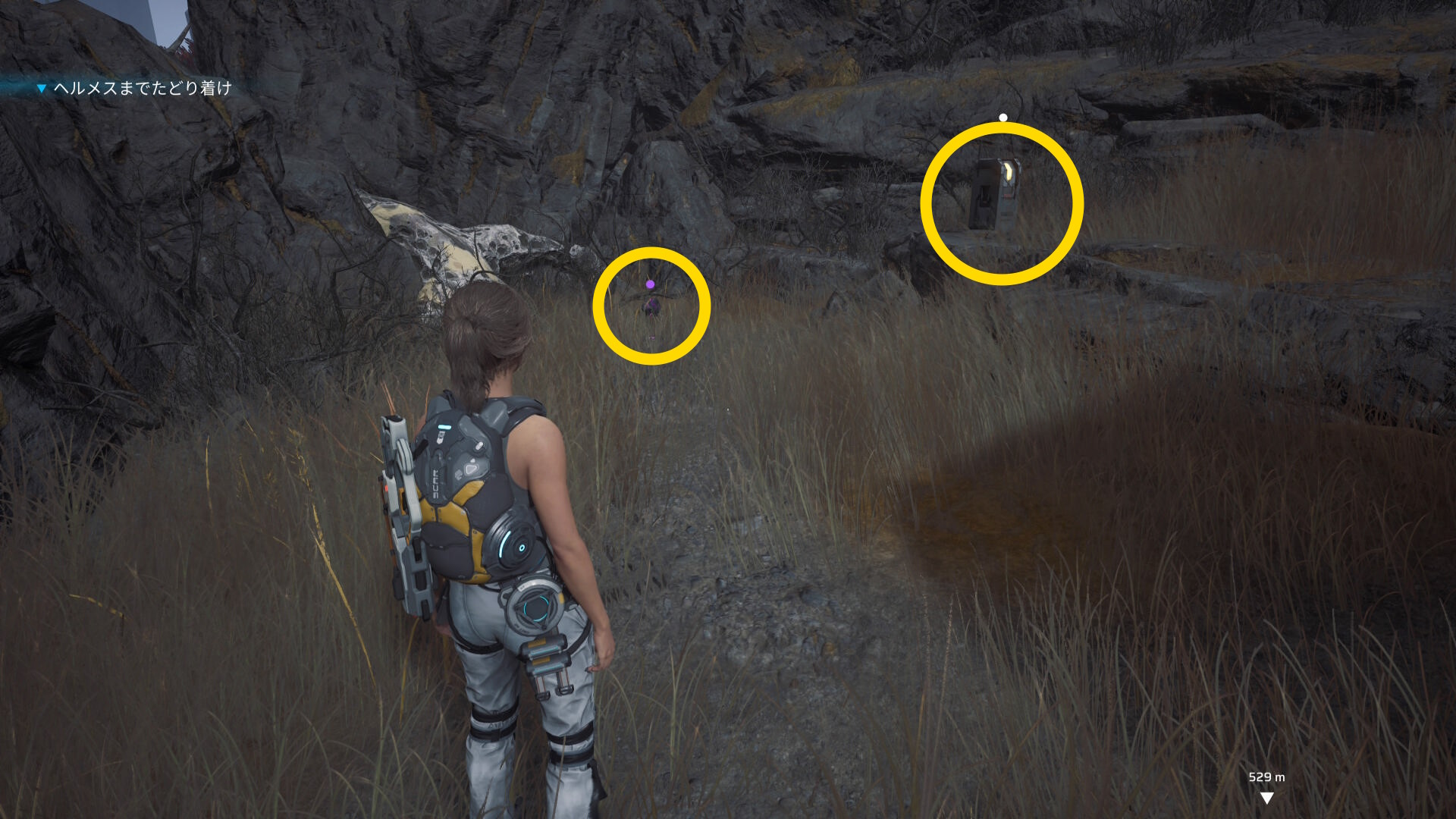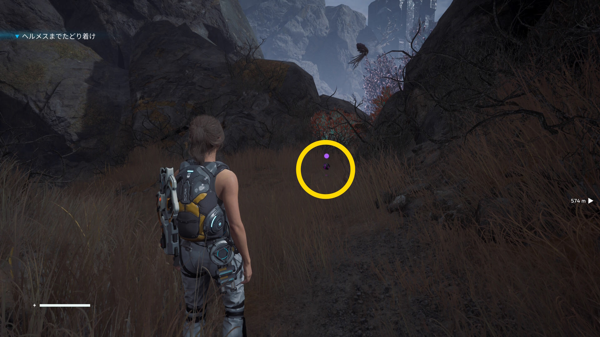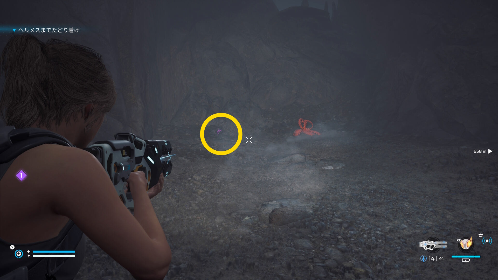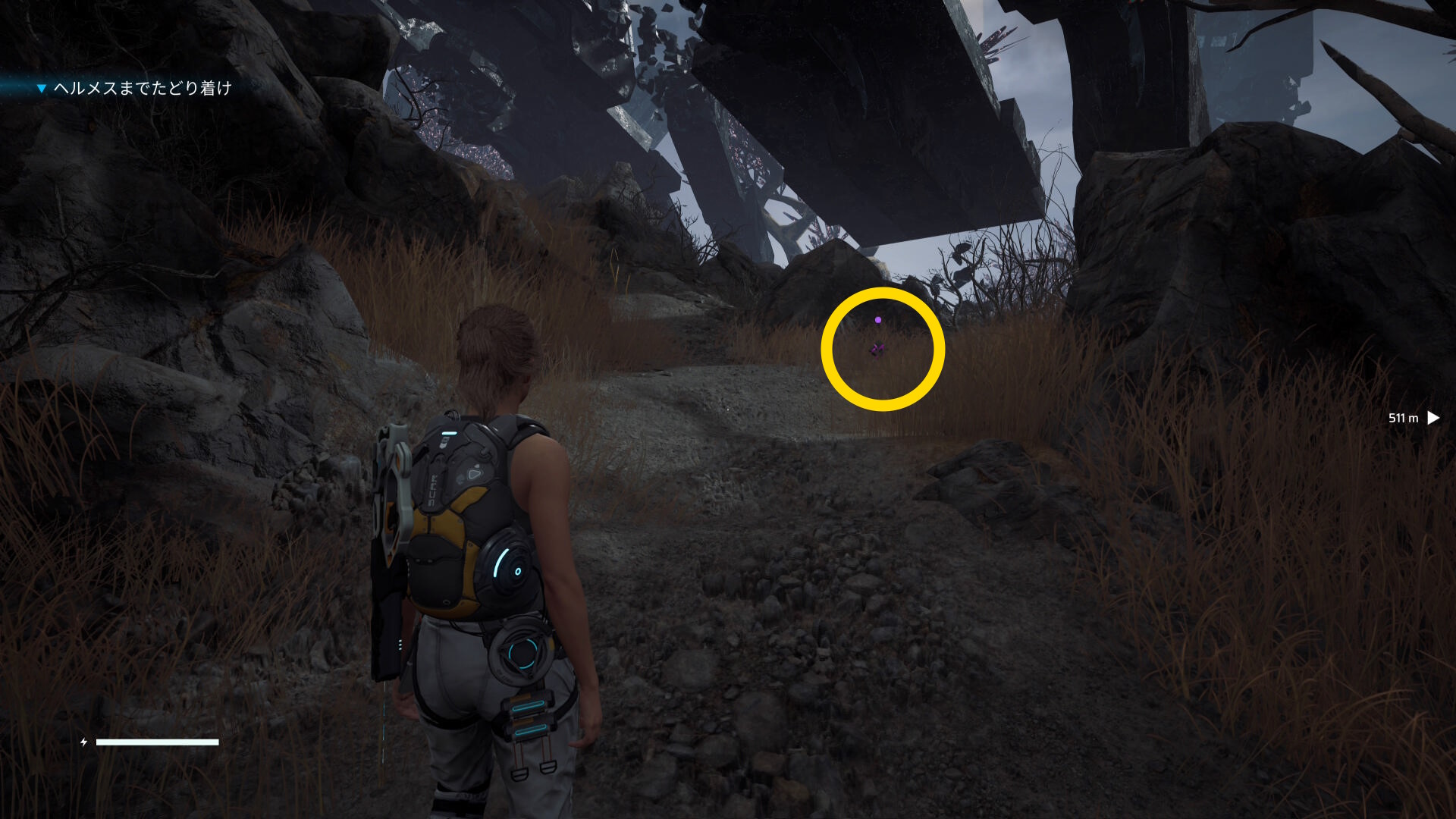 - 洞窟を進むと奥に エイリアンの柱(5/17) が見えてくる。なお、その手前右壁に「フレッシュの死骸」があるが調べても調べなくてもオーケー(下画像、右側の白い◯)