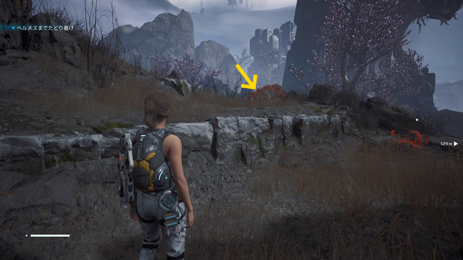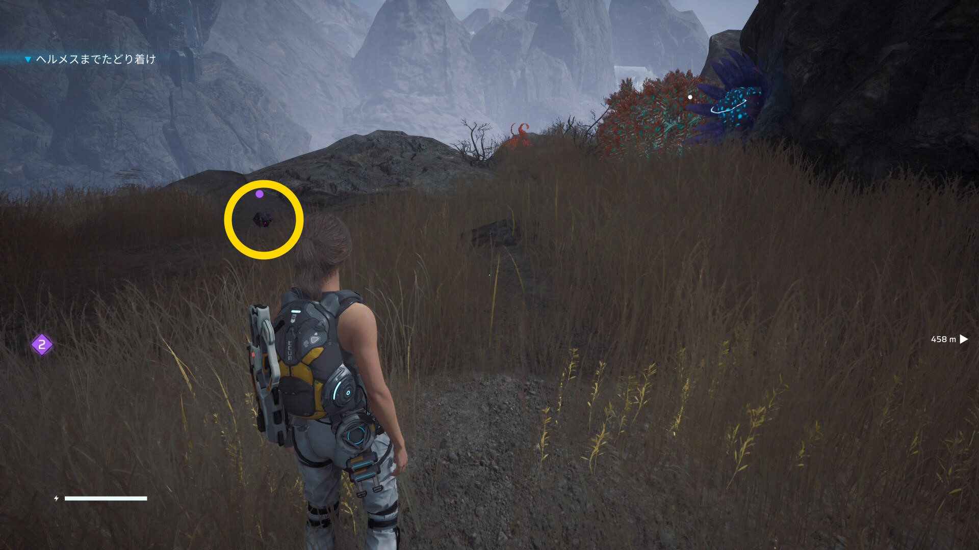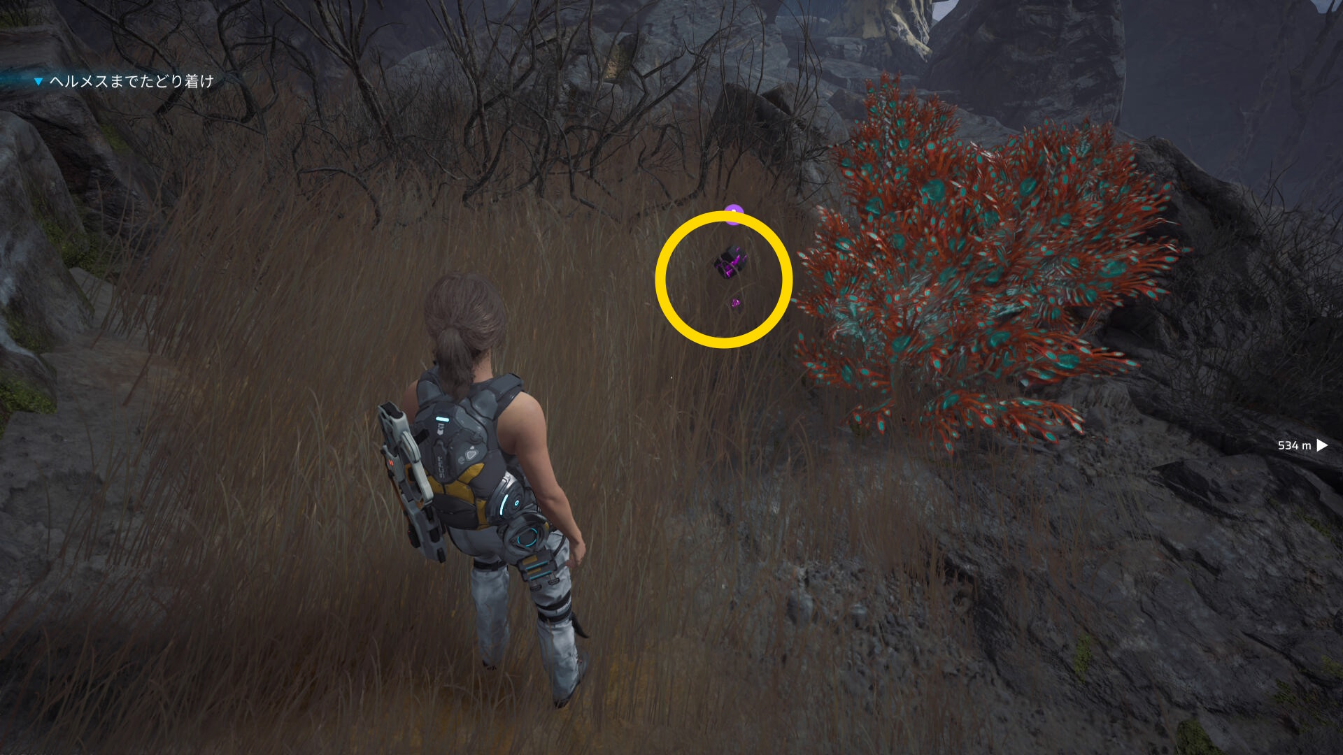 - 右後ろに移動すると繊維が落ちている箇所があり、スコーピオッドのまゆに似た物体からは 有害採取物 が回収できるときがある(ランダムなので流電採取物のときもある)