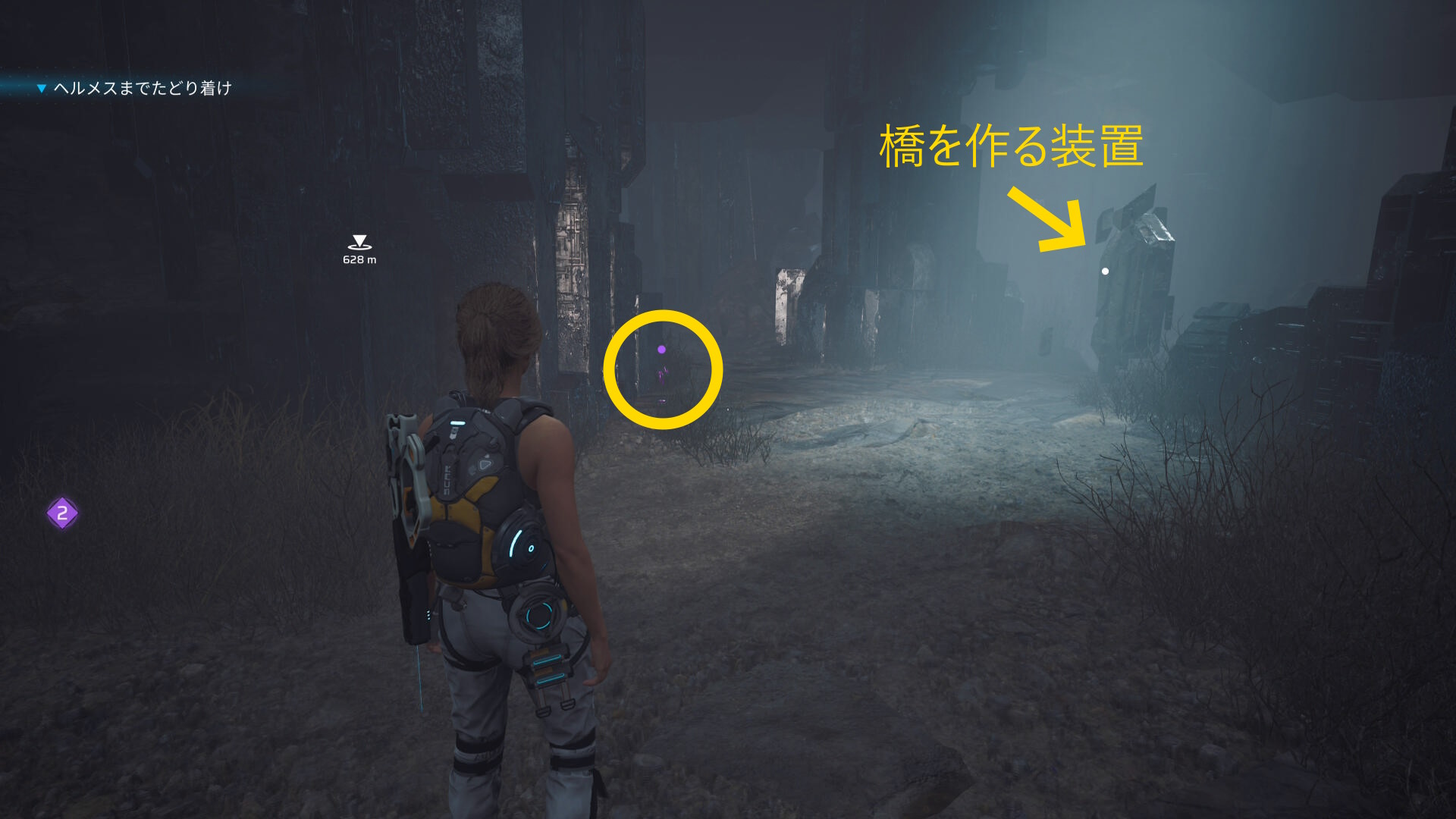 - 右側の装置を調べると橋が出来上がり、「エイリアンの柱」へのショートカットを作ることができる