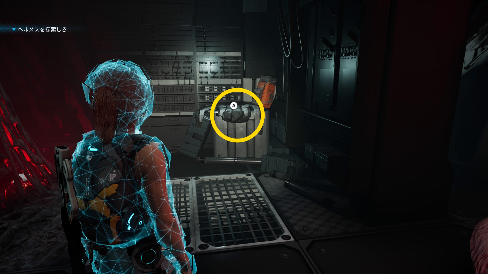 - ヘルメスの入口に近づくと、右側のコンテナの裏に 知識キューブ