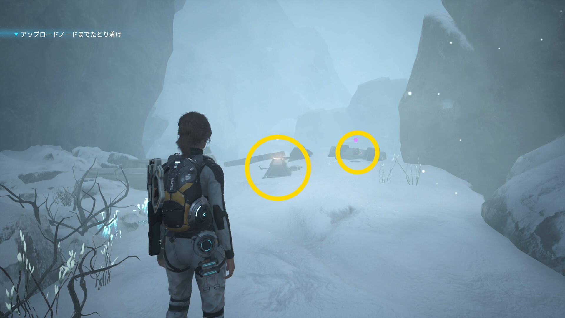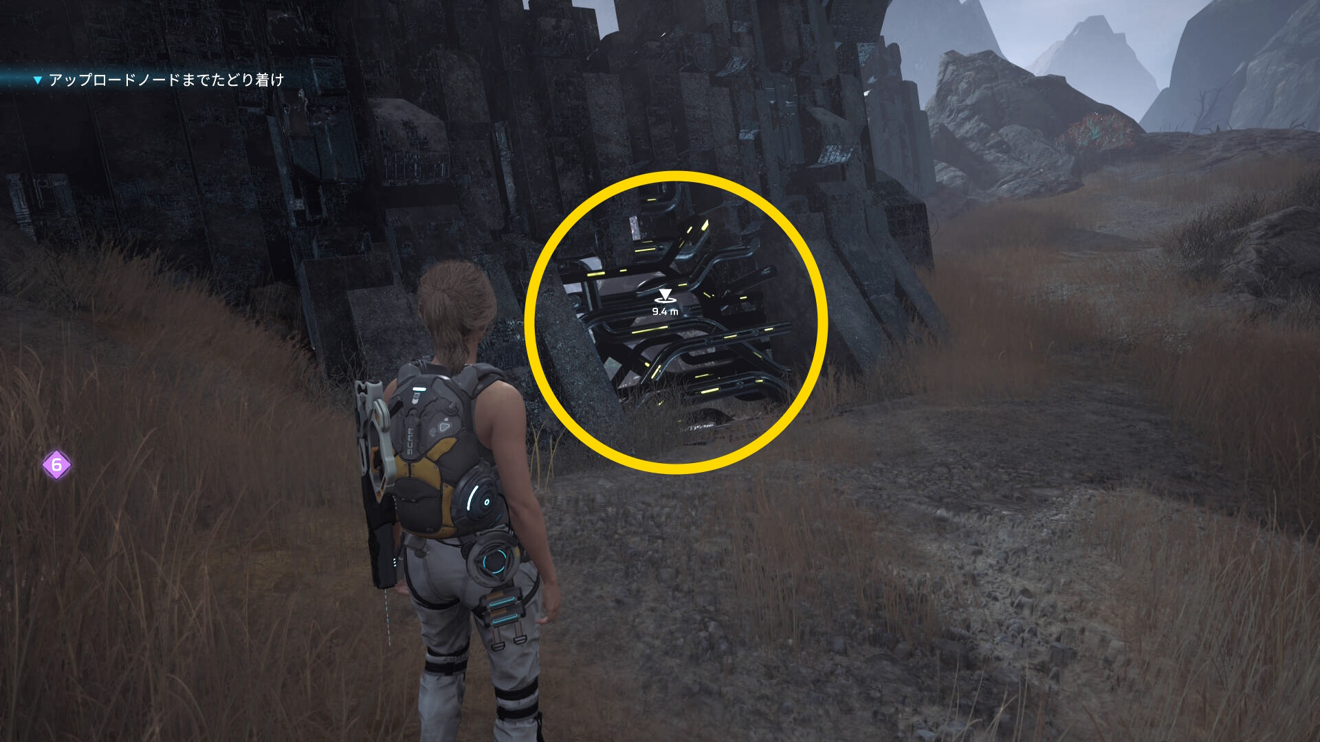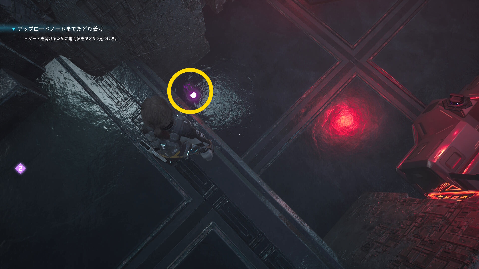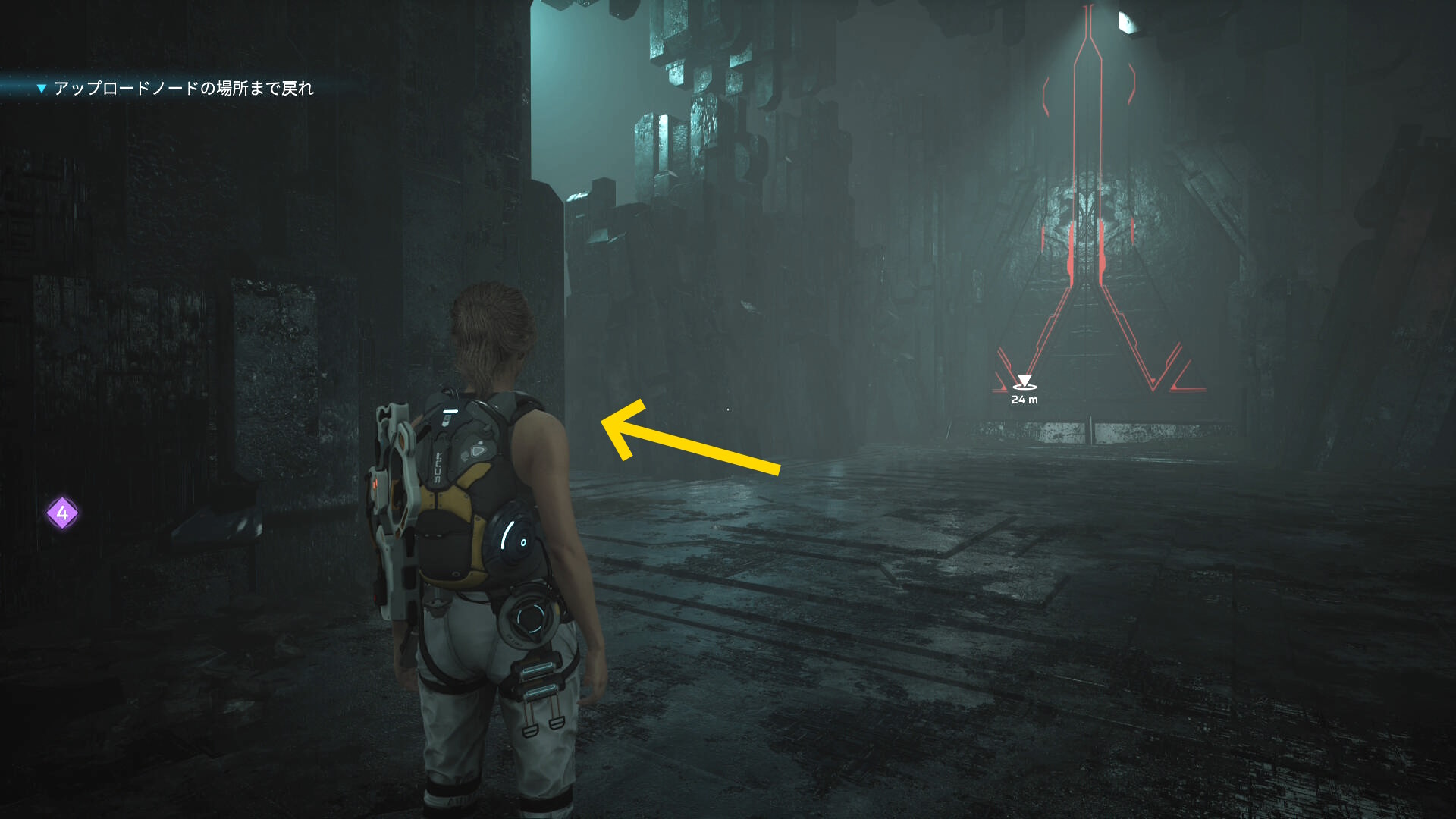 - アップロードノードの操作パネルを正面にみて、裏と右のゲートに向かう(下画像①および②)