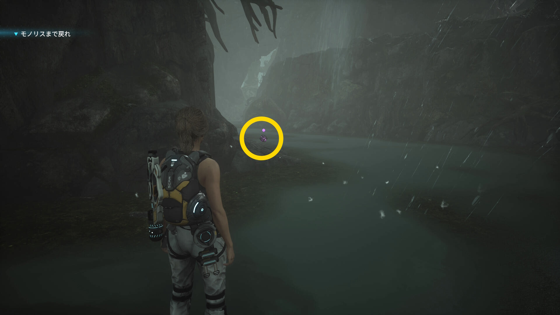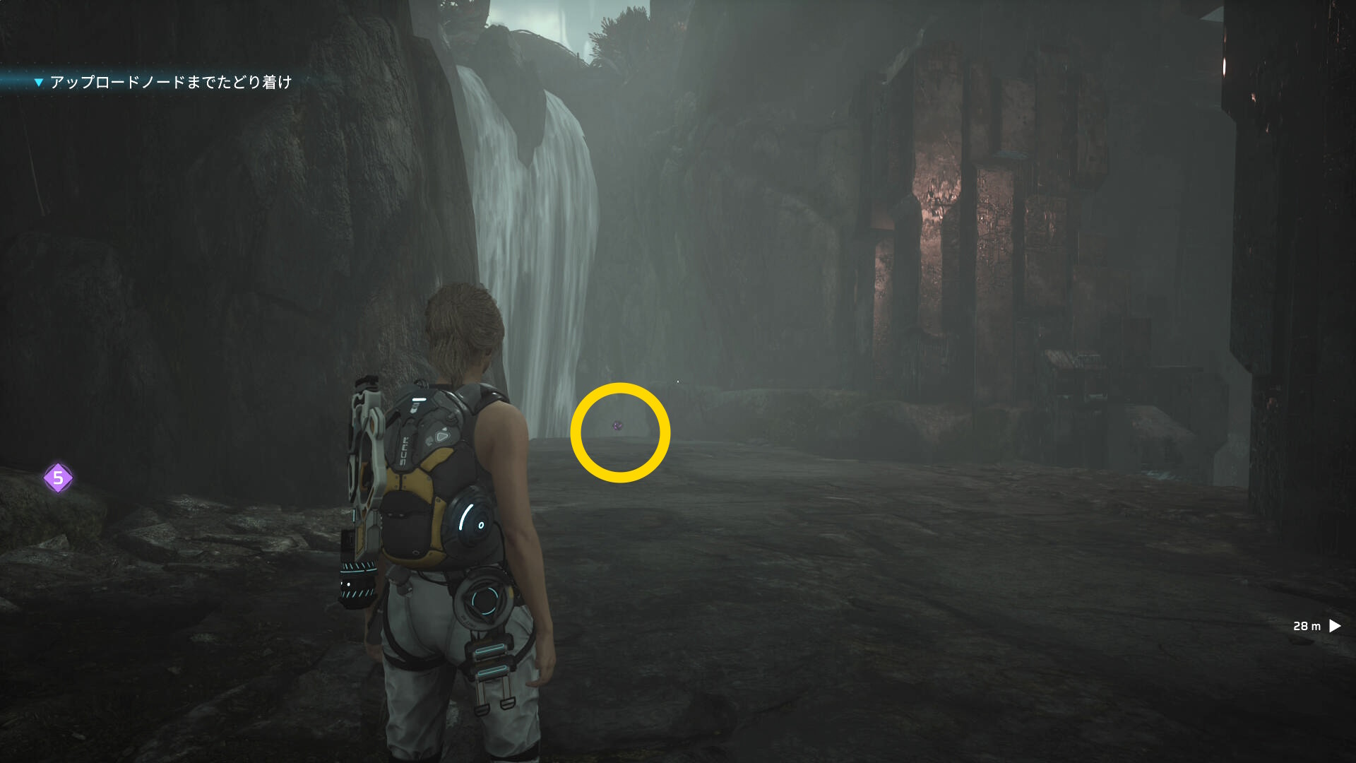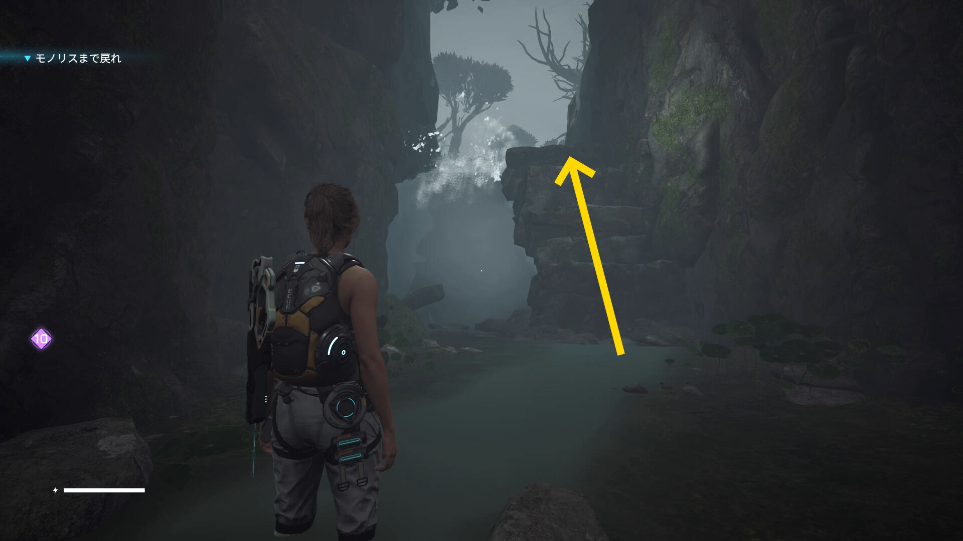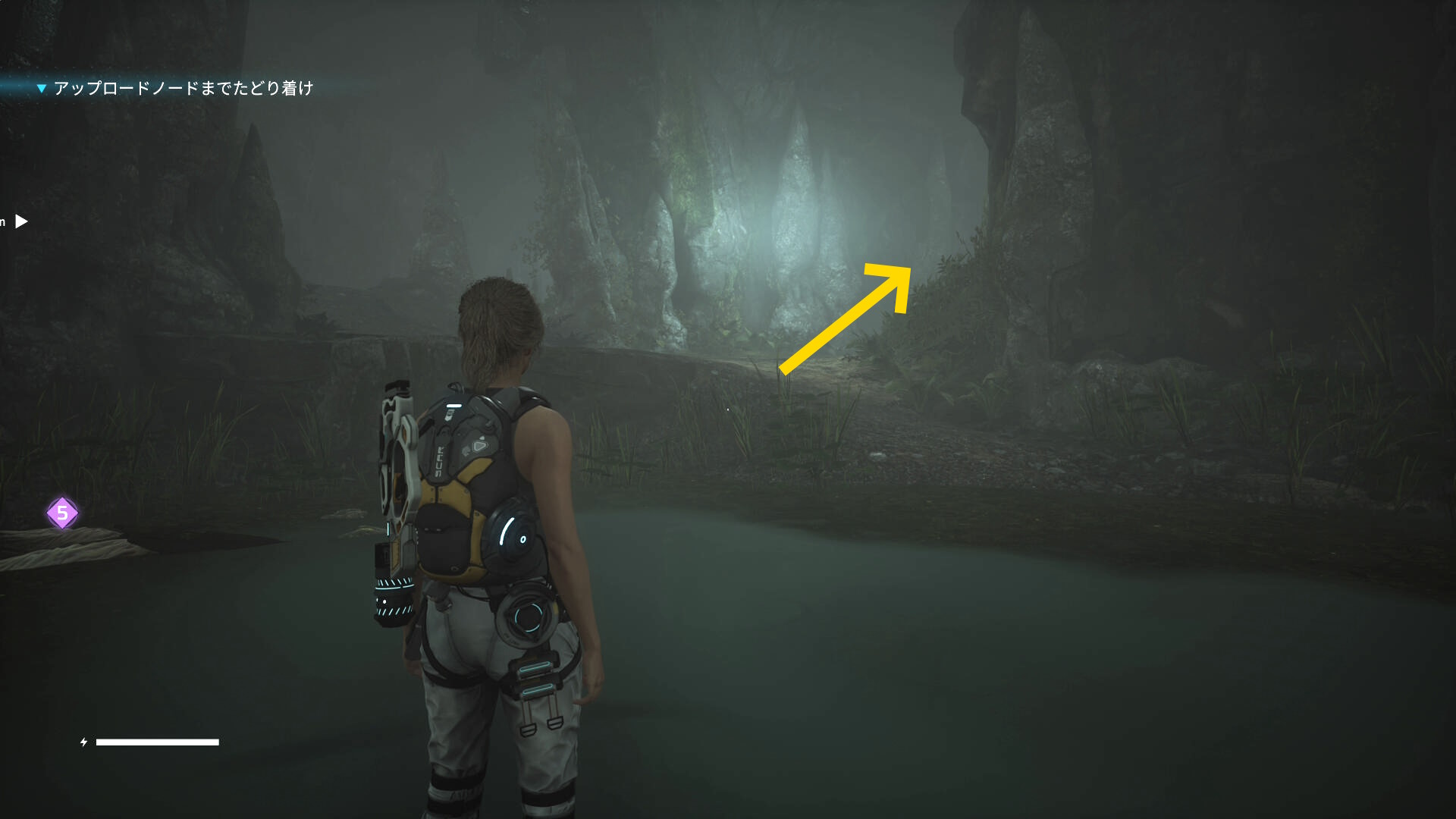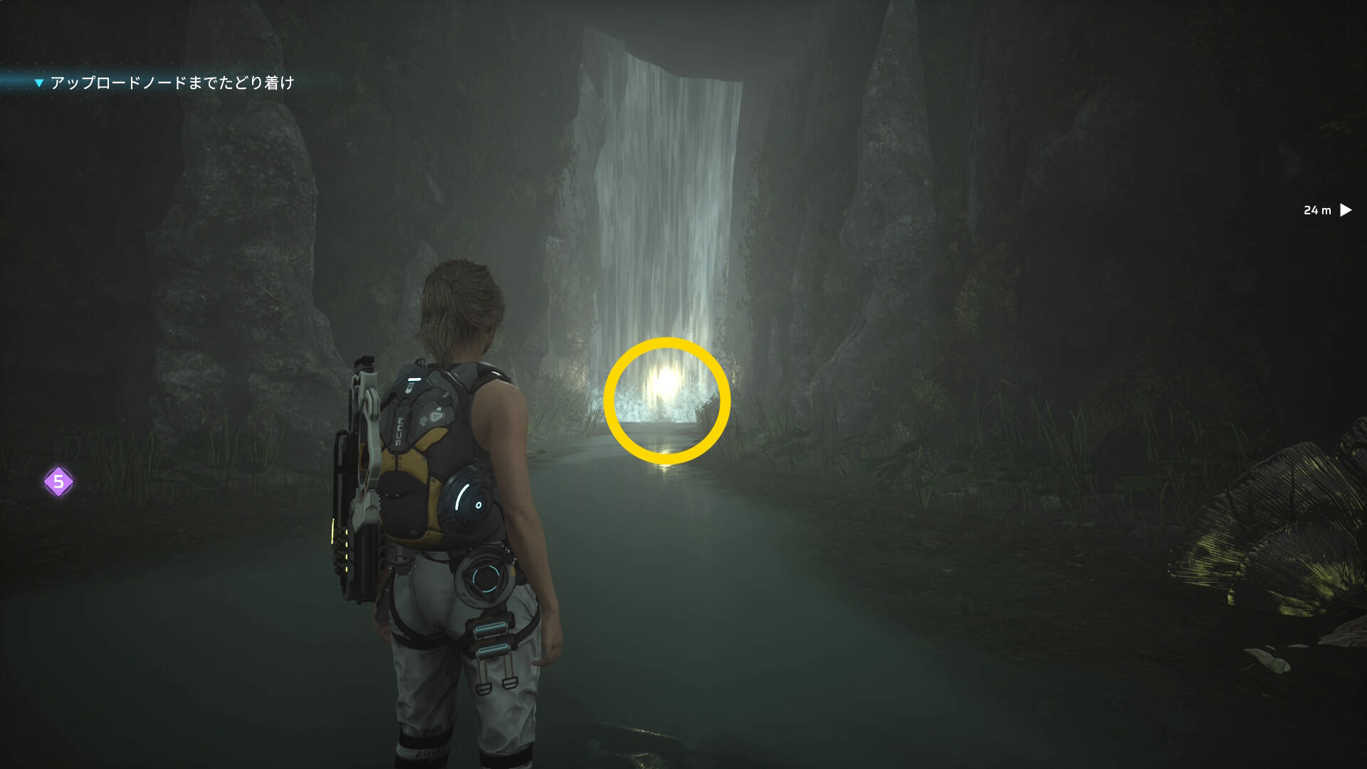 - ファンガスをキル後、彼が最初にいたところに進むと突き当りに滝が見え、黄色のライトが灯っている