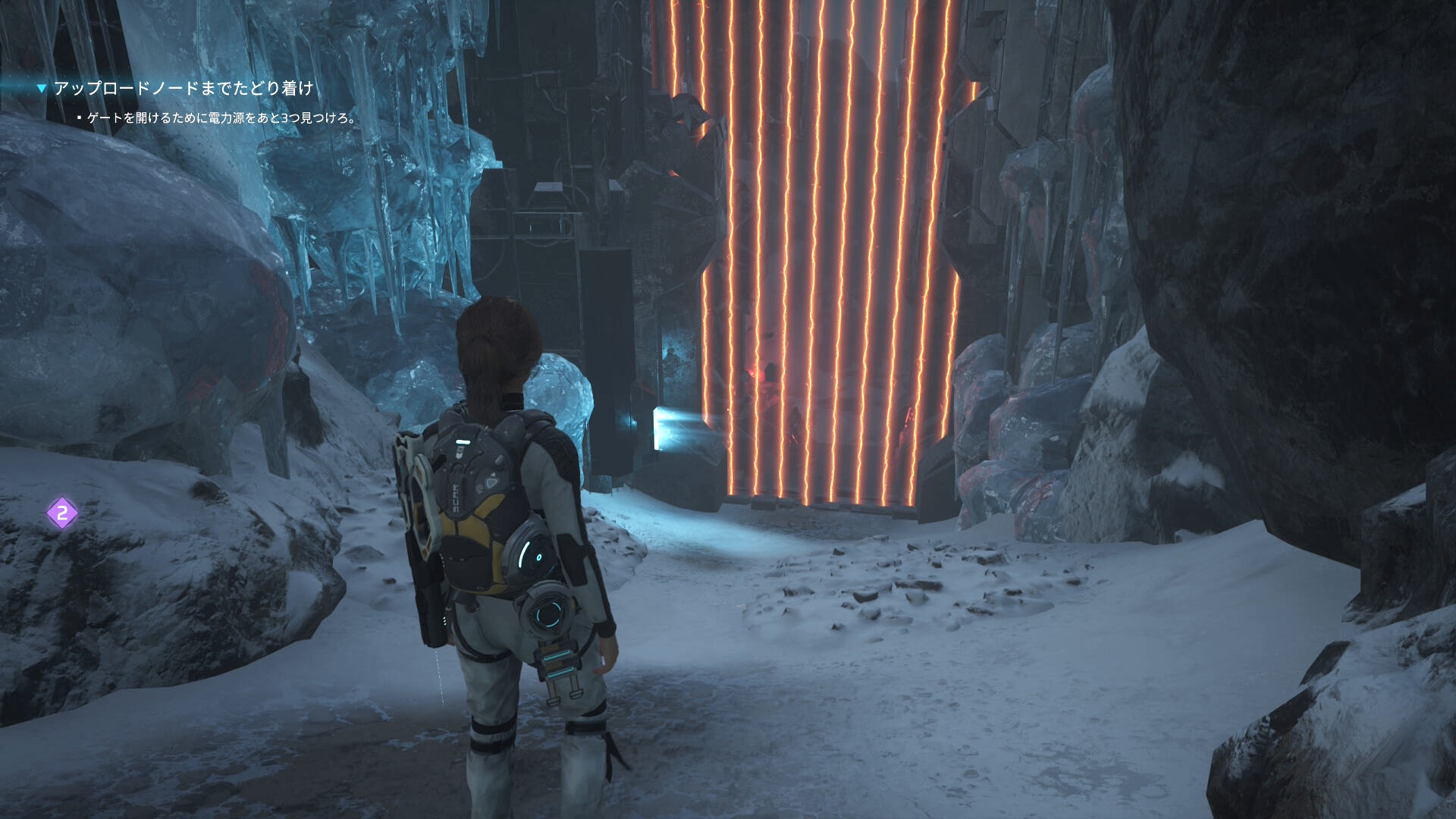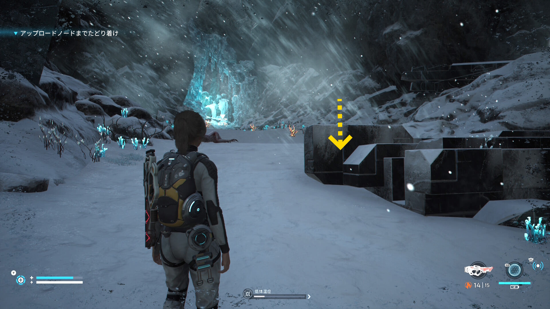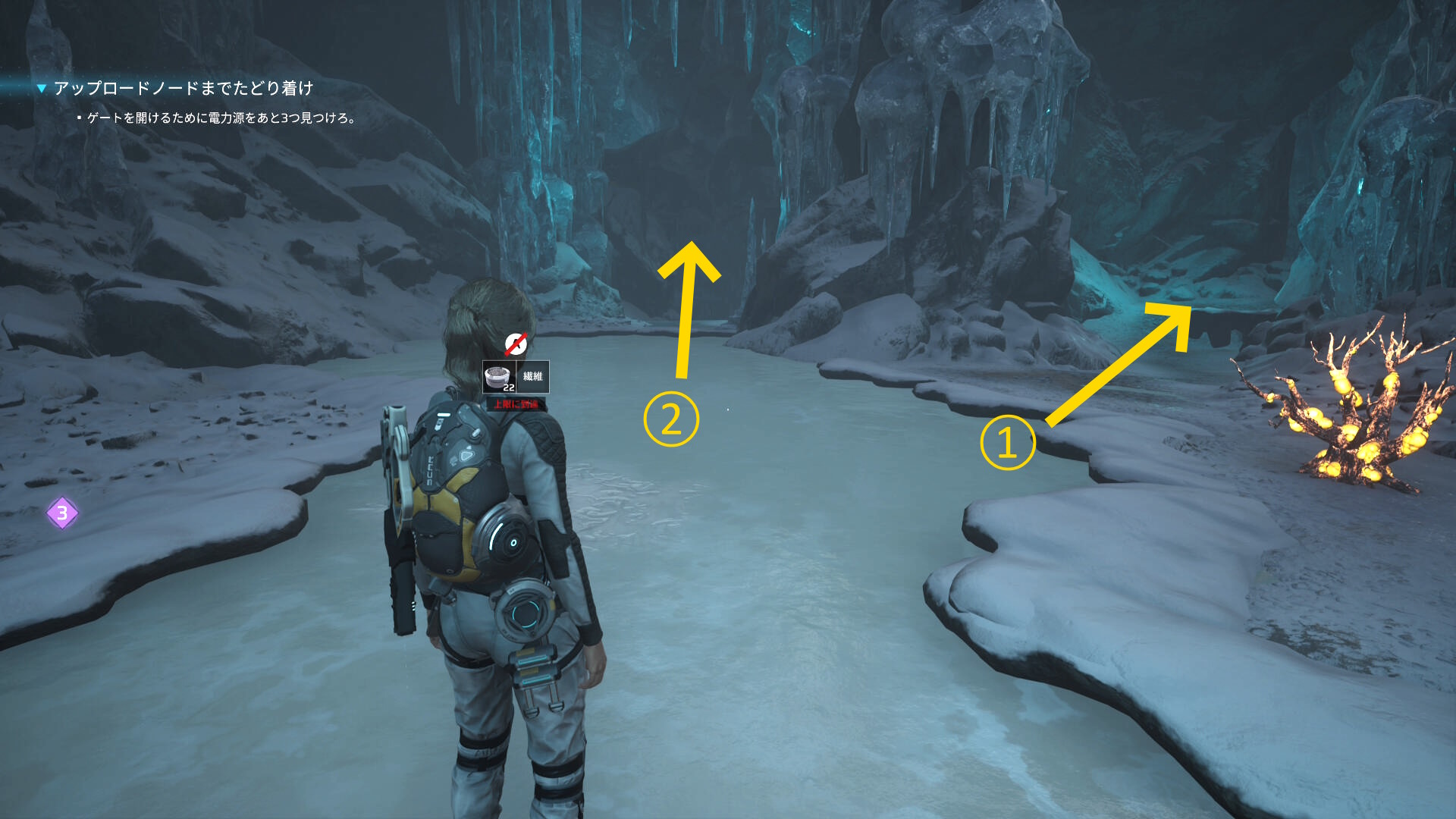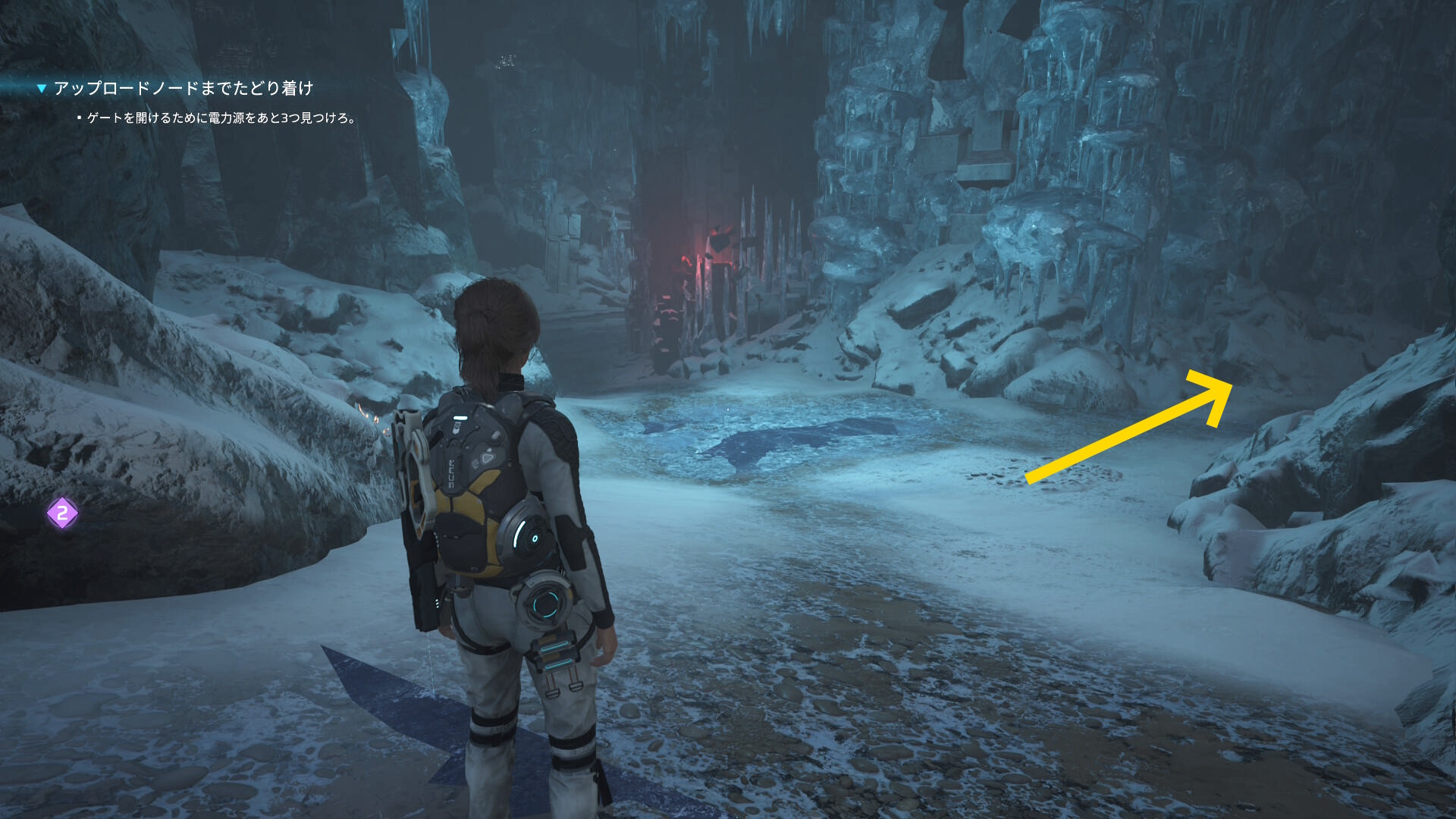- マーカーが示す「むき出しの管」をケミカルアトマイザーで溶かして進むのが正規ルートであるが、右前方の沼地を下画像のように凍らせて進む