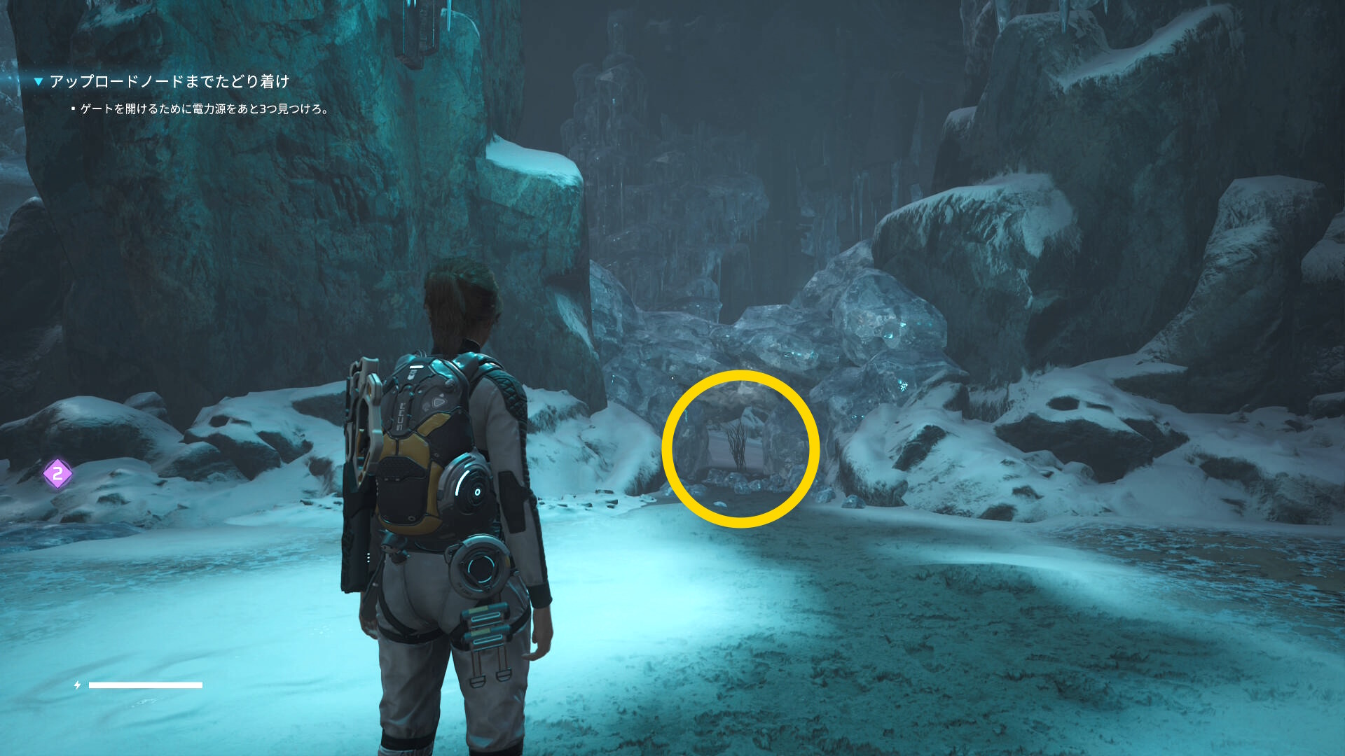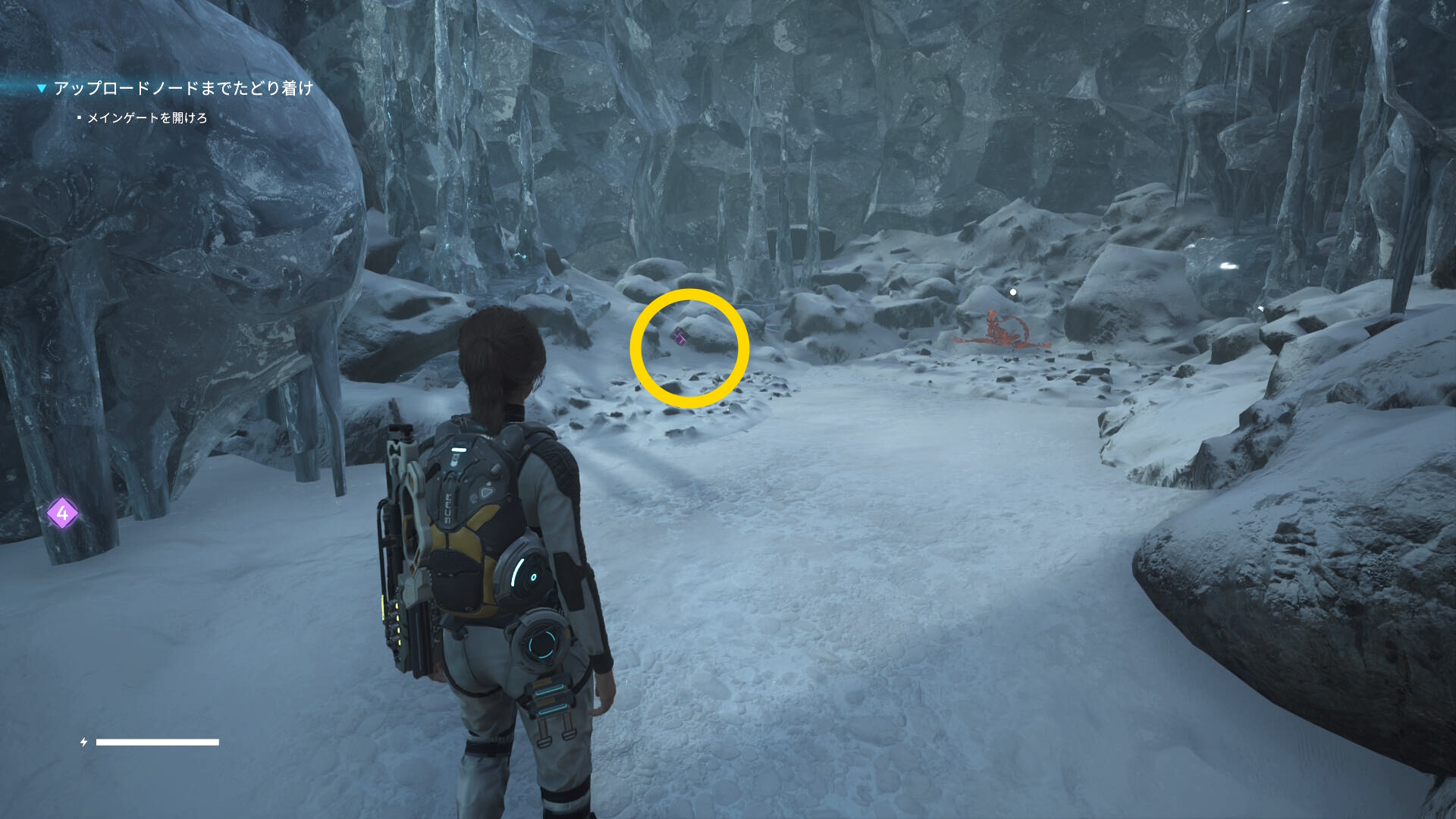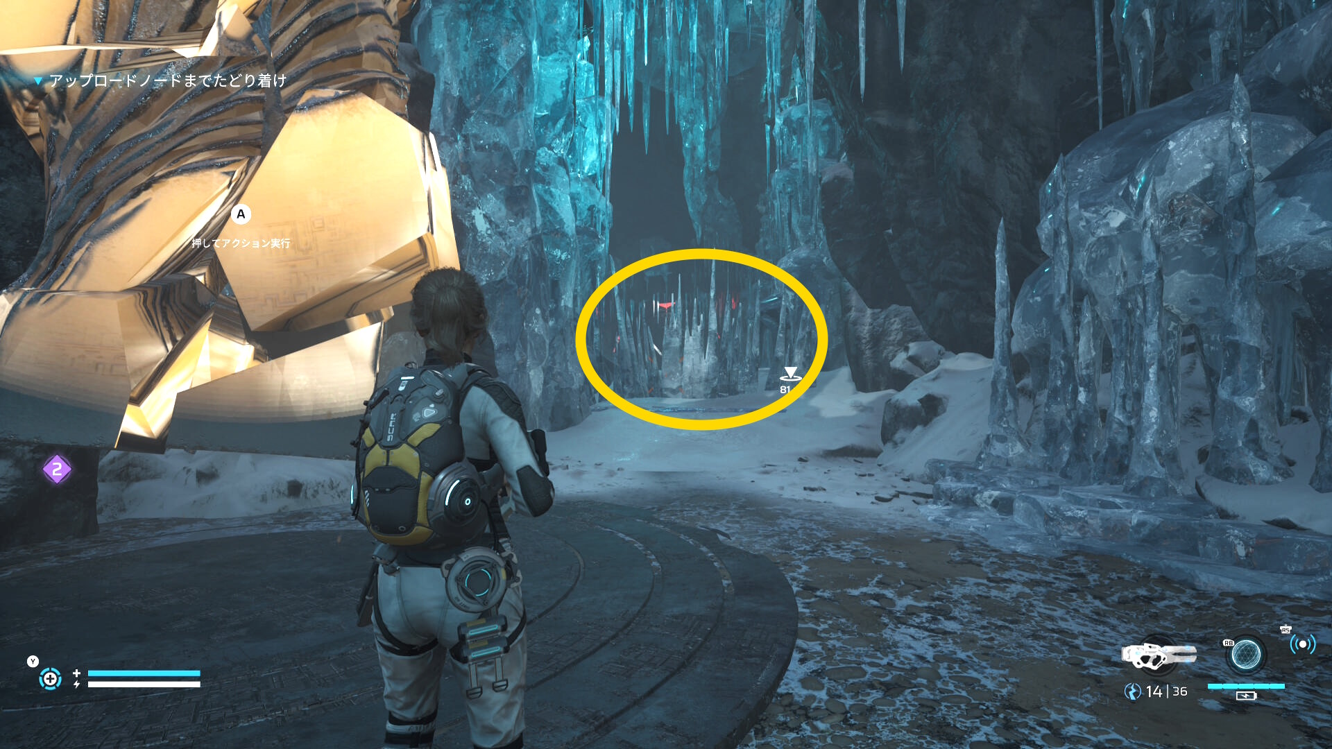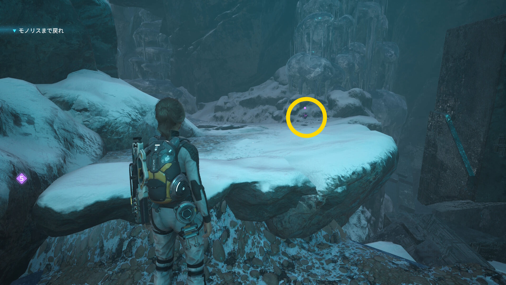 - モノリスの方へ戻るが、その前にドアを背にして右前方奥の陸地に向かう(もちろんクライオランチャーで凍らせながら)