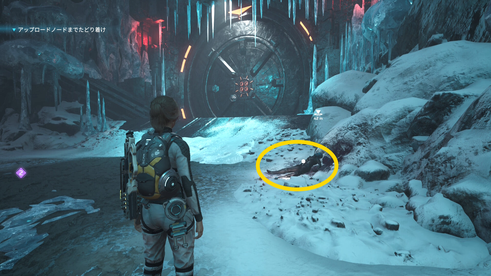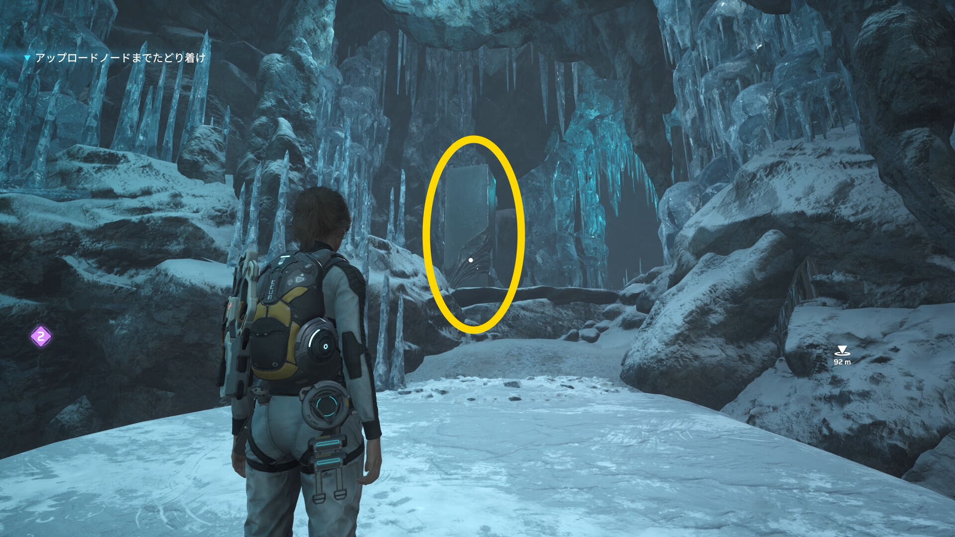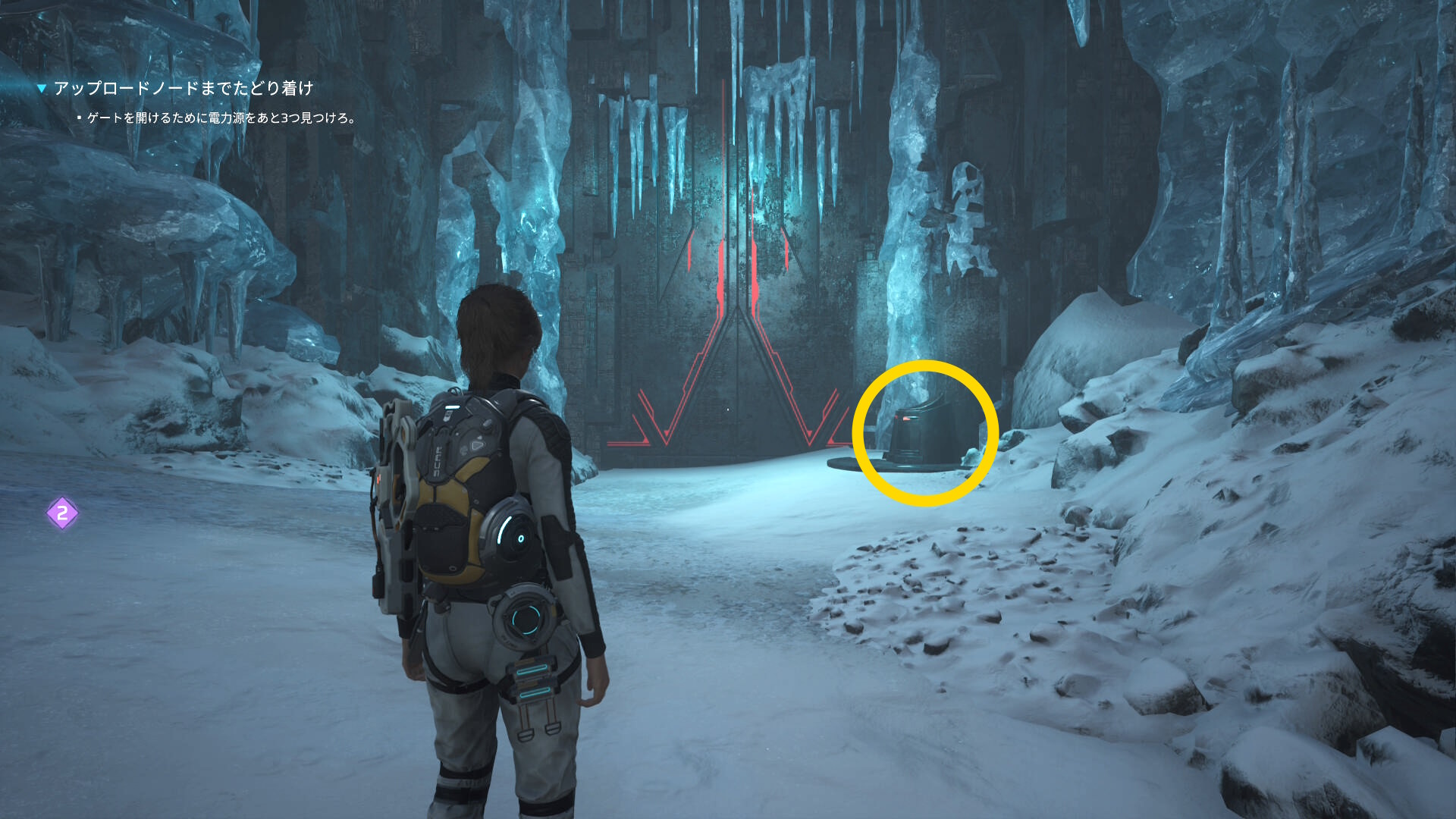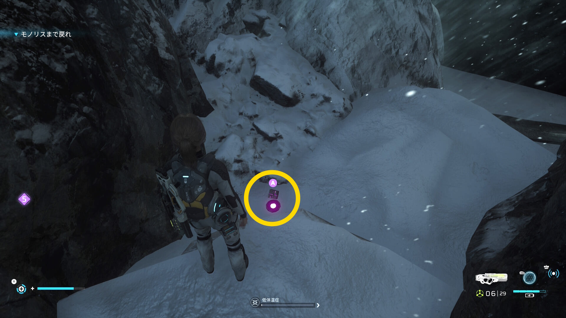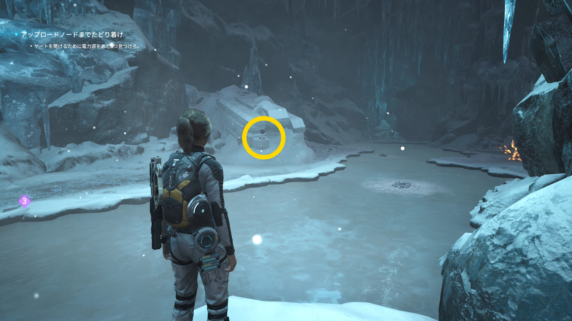 - モノリスの方へ戻るが、その前にドアを背にして右前方奥の陸地に向かう(もちろんクライオランチャーで凍らせながら)