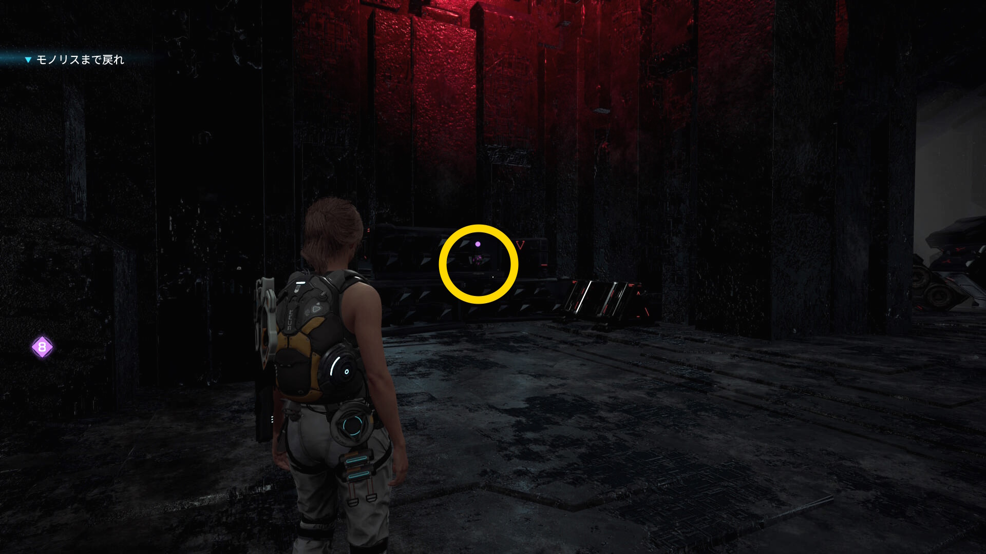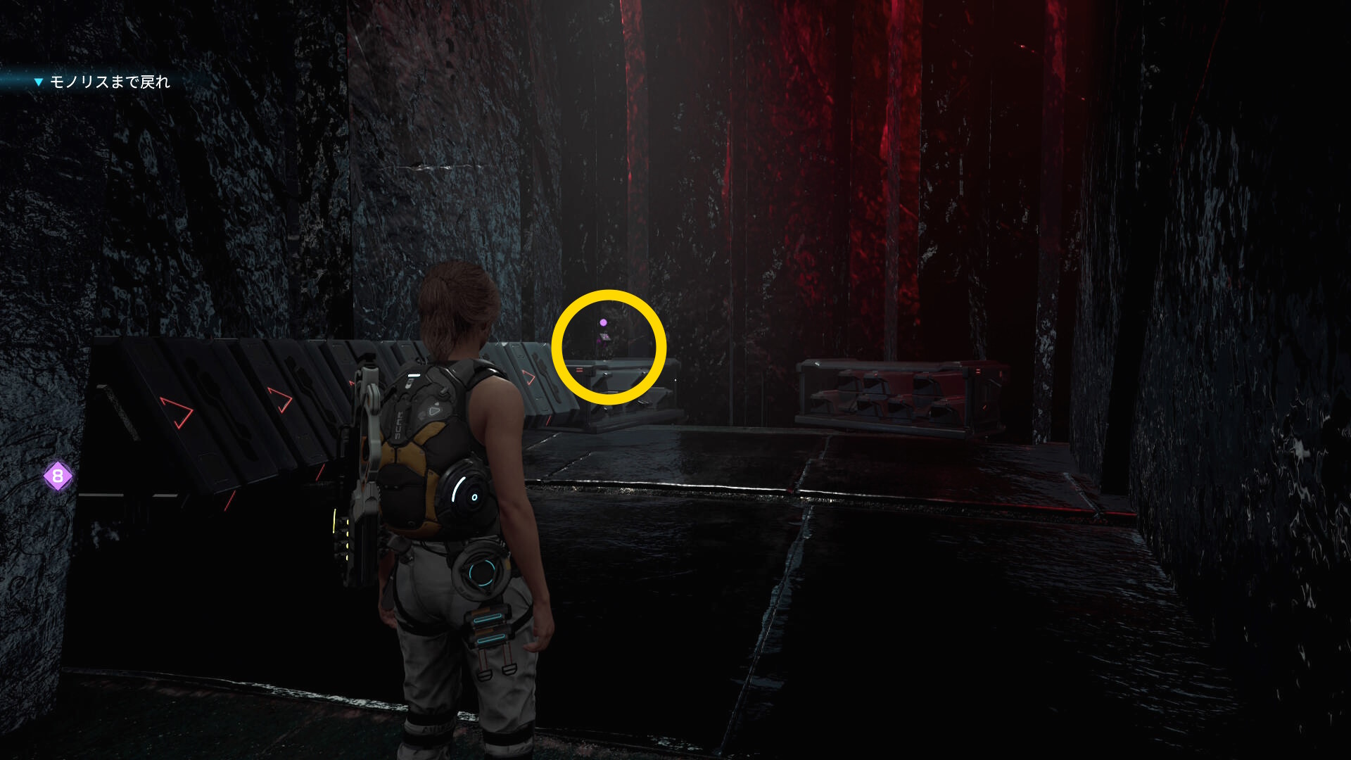 - 来た道を戻り、段差を越えて左に進むと エイリアンの柱(19/17)が見えてくる