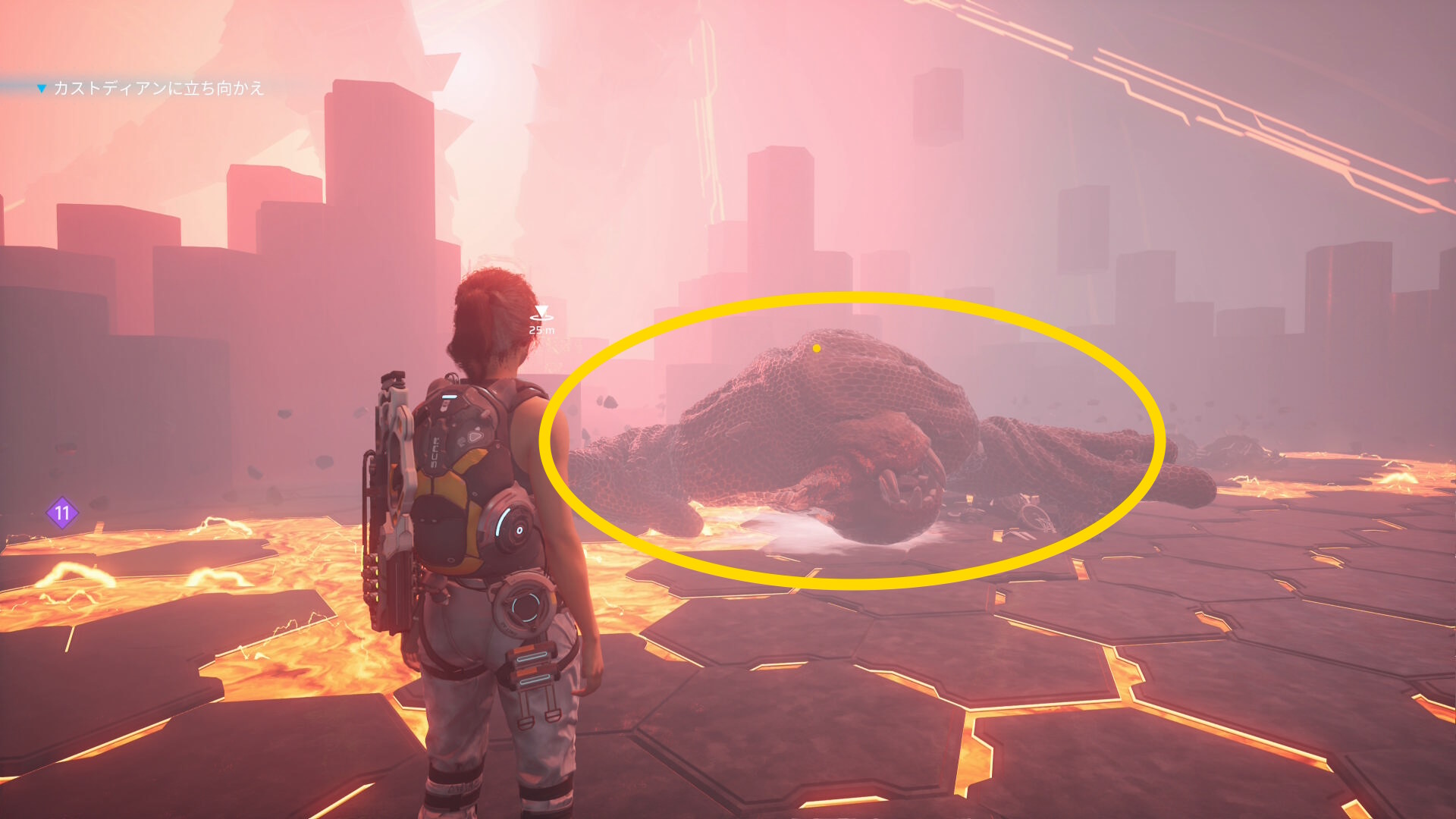 - アルファと戦った場所に来ると右前方に寝ている敵がいると勘違いするが、これはアルファの死骸である
