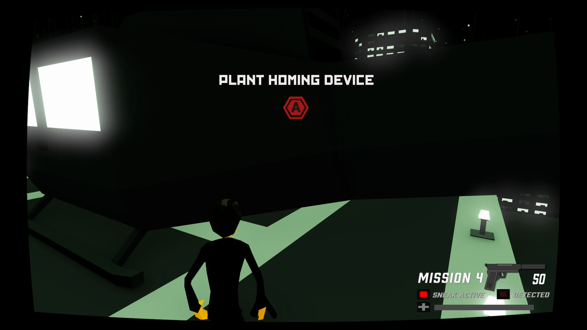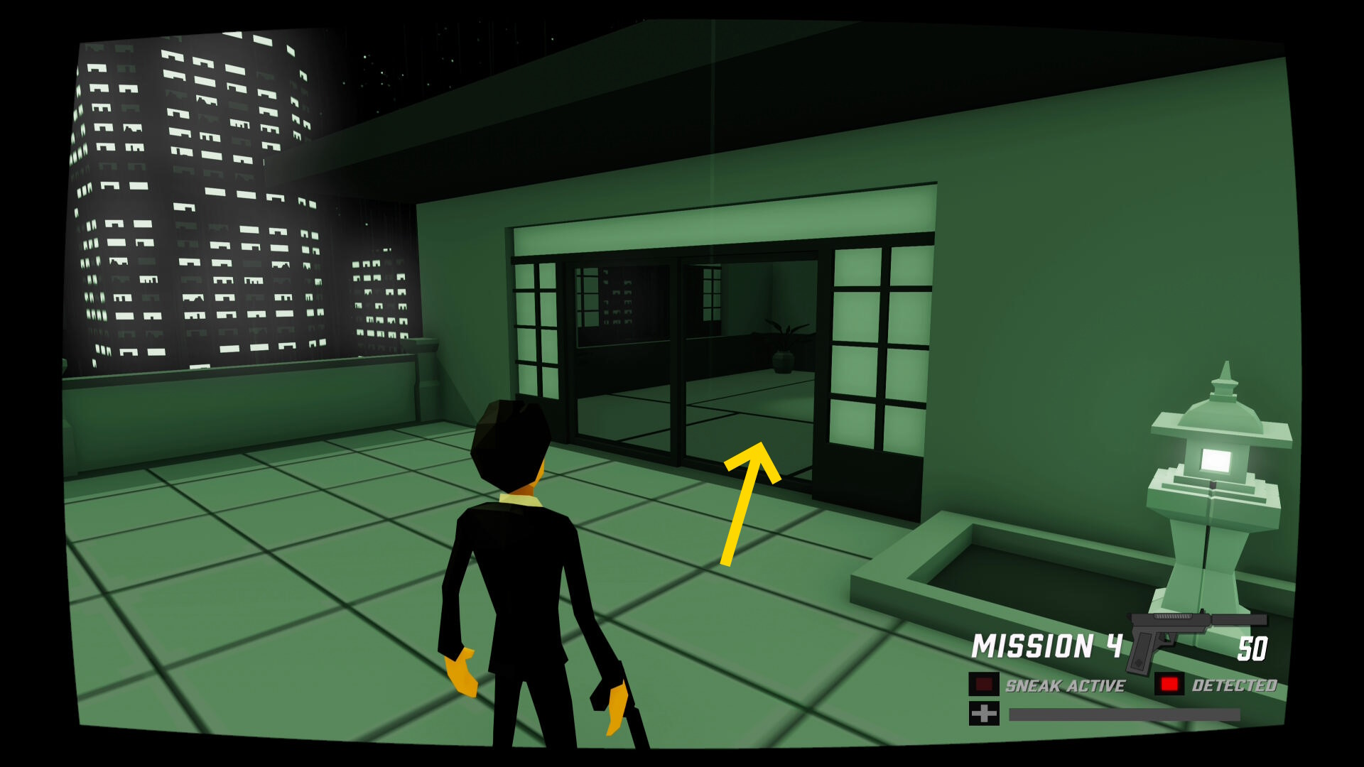 - 外に面した窓の右下部分をピストルで破壊し、へりを左に移動する