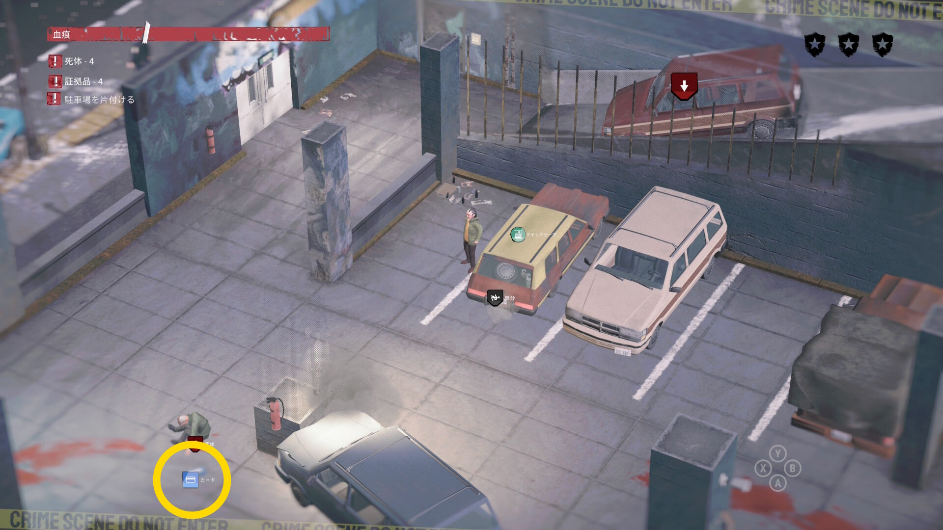 - このカードが何に使うものかは不明だが、警察官が拾ってしまうので先に回収しておこう(死体や血痕はあと。まずはカードだけ回収)