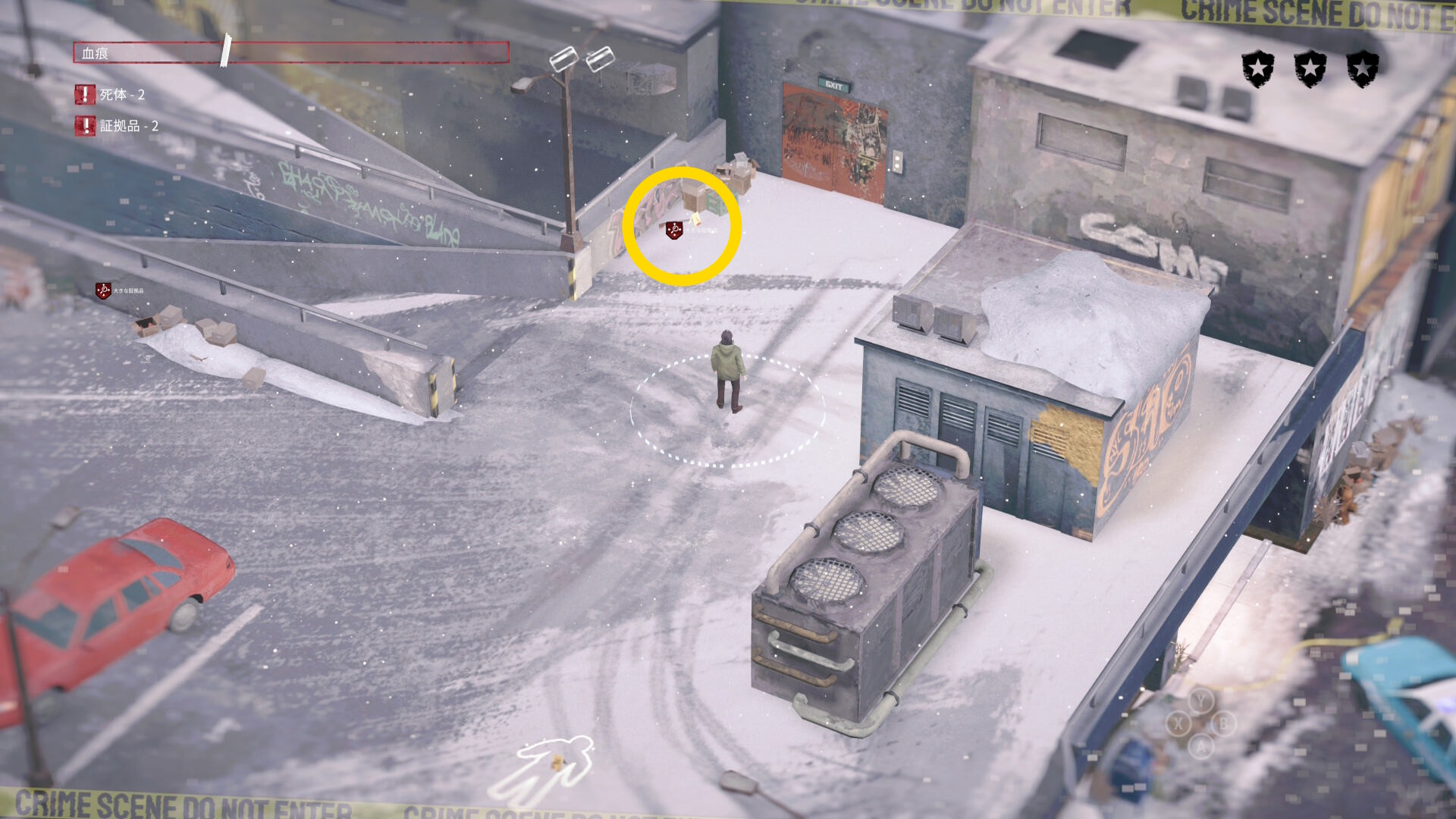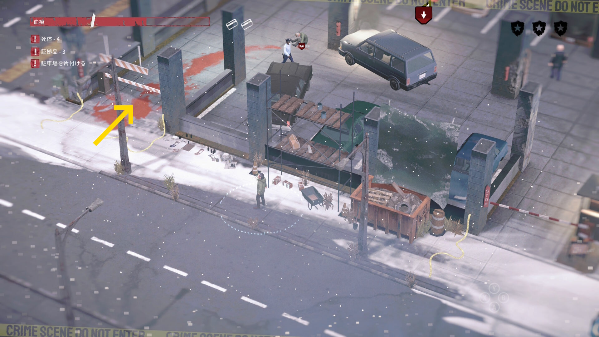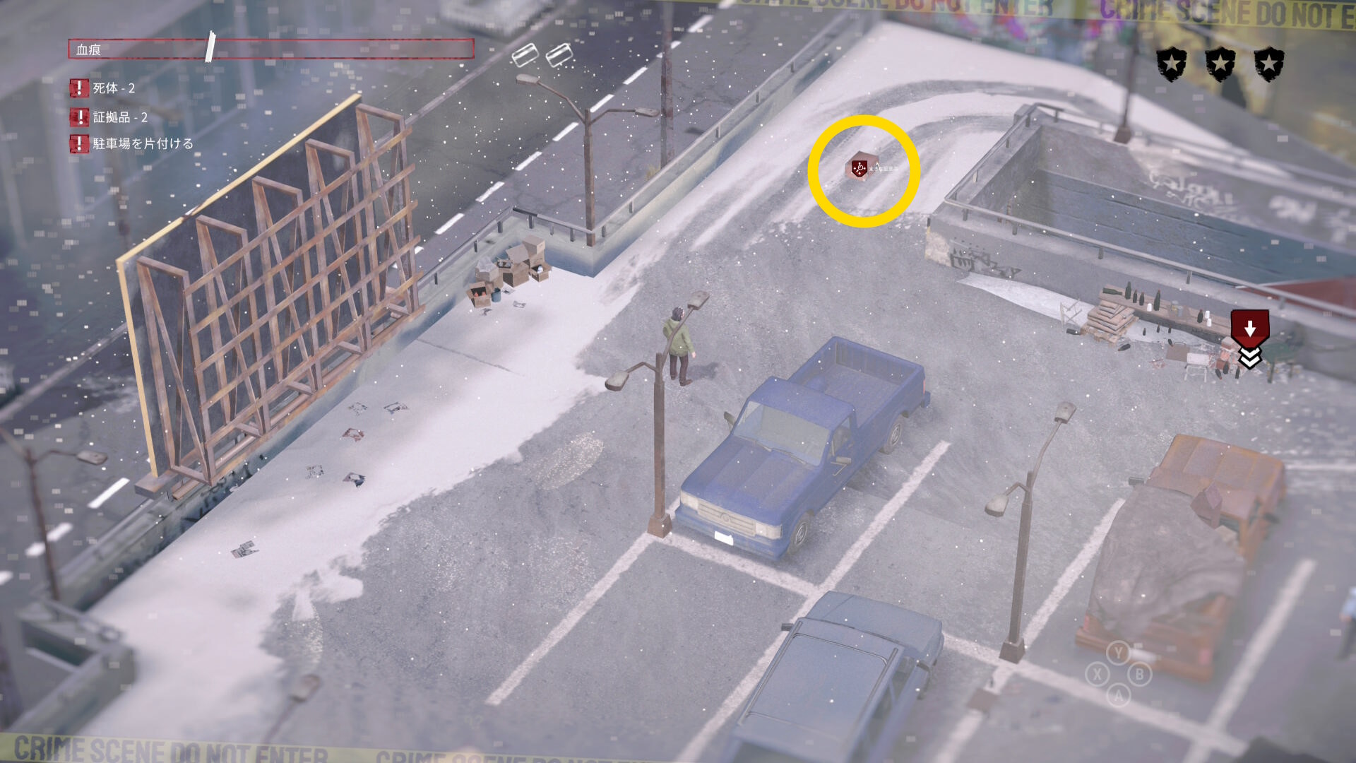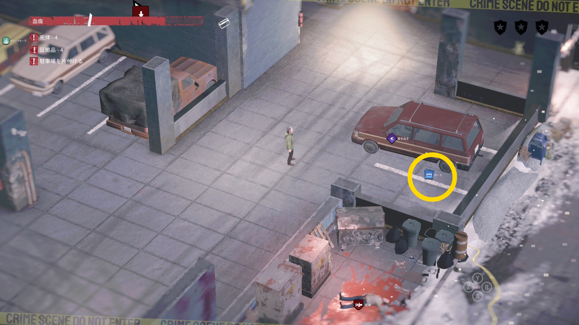- 車の後ろに隠れながら時計回りに移動していくと 4体目の死体 と 証拠品(16/20)