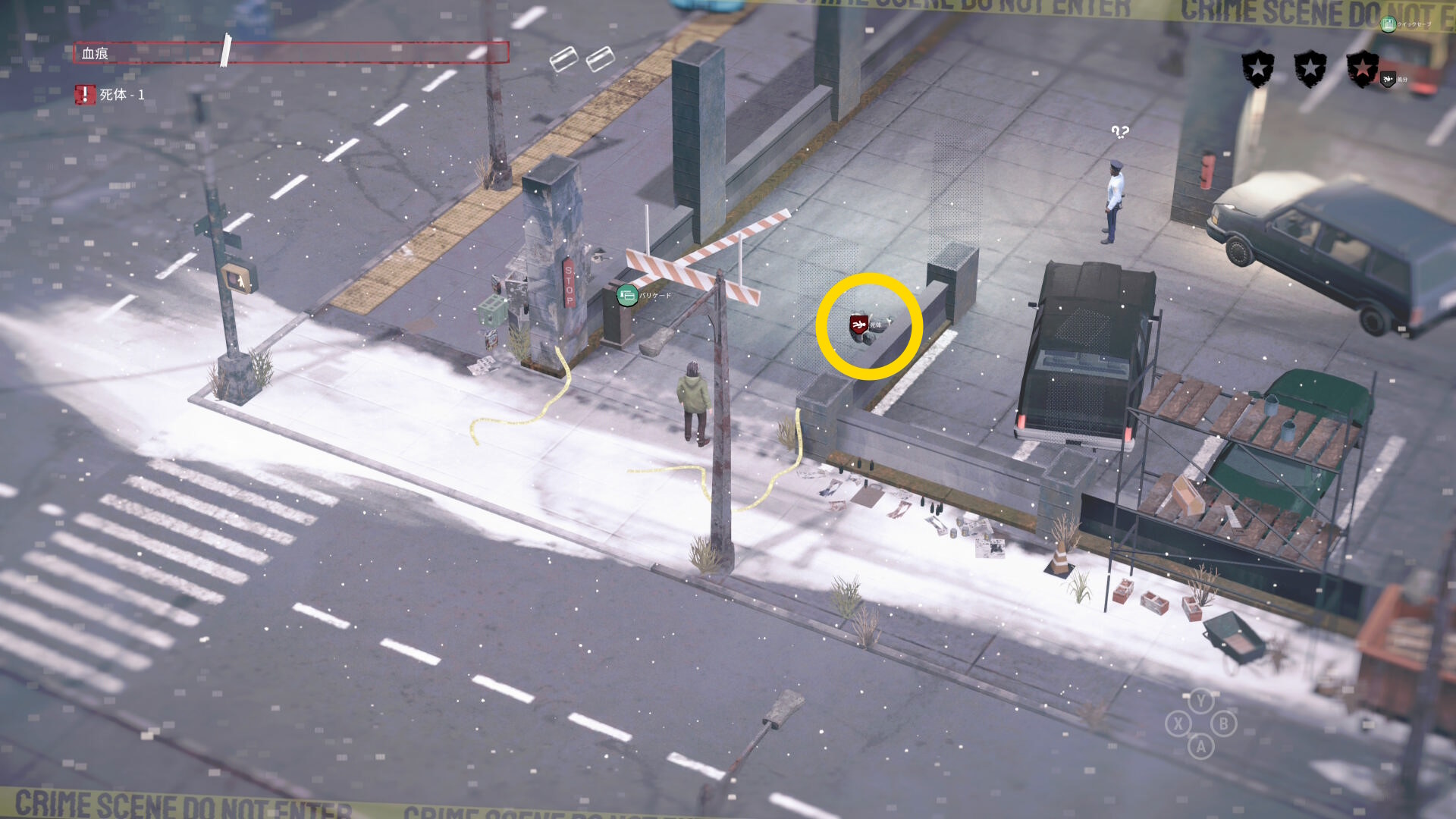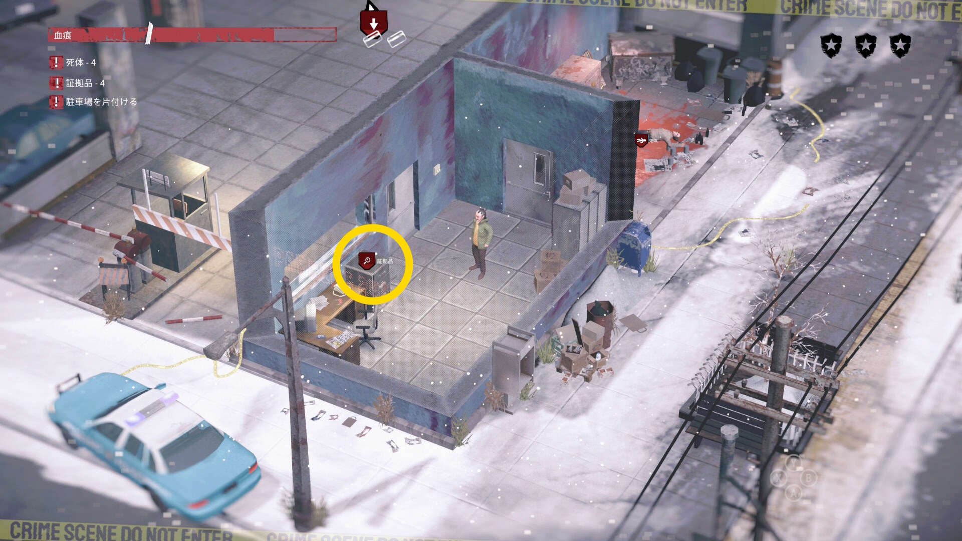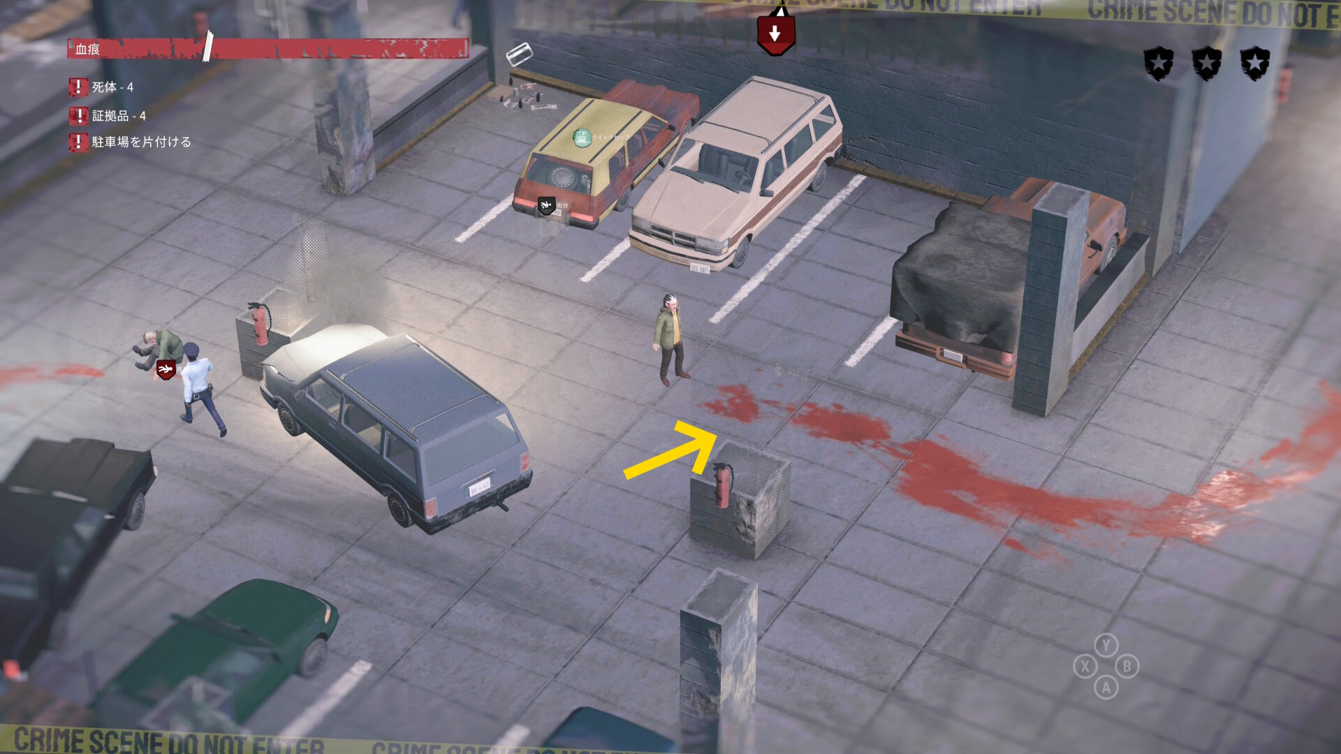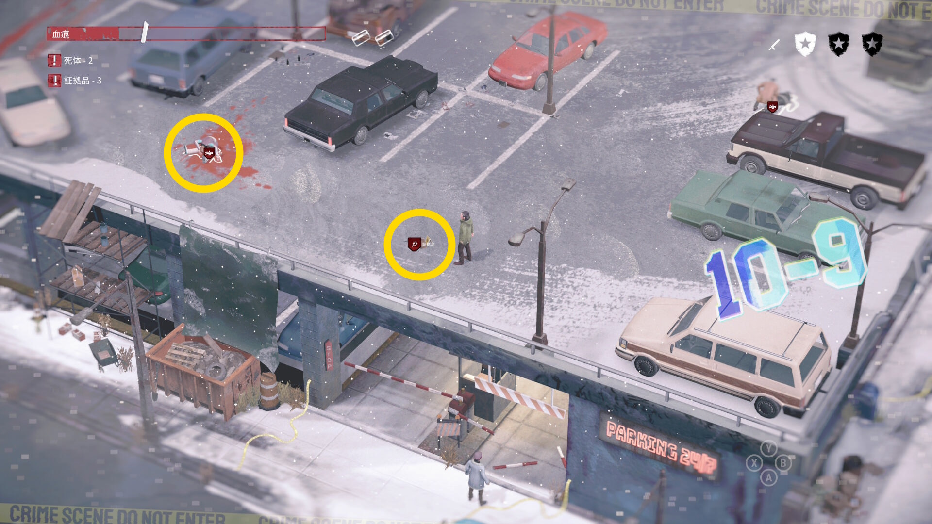 - 車の後ろに隠れながら時計回りに移動していくと 4体目の死体 と 証拠品(16/20)