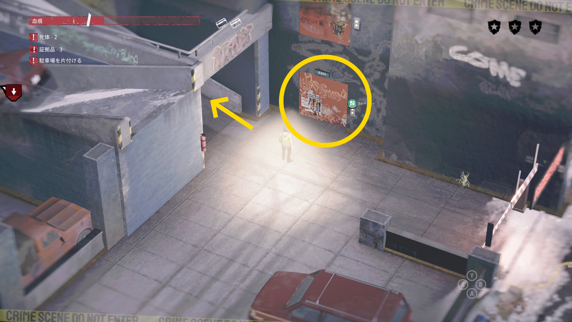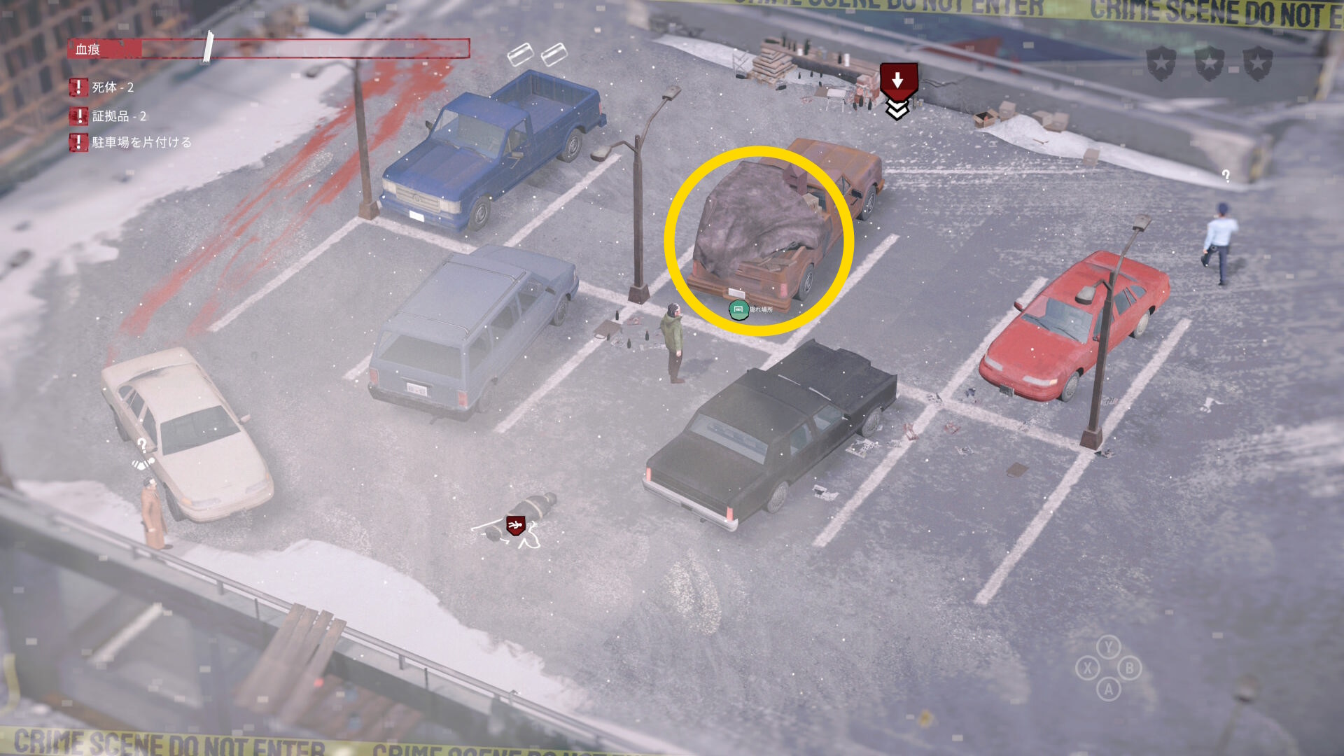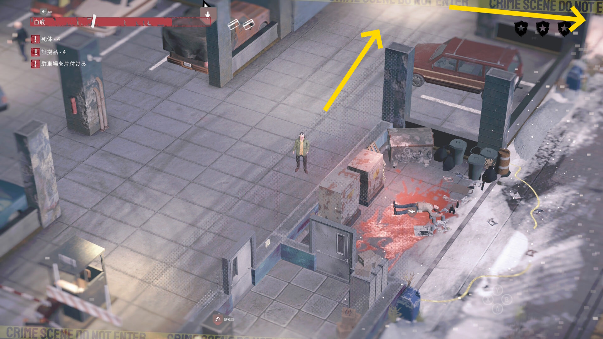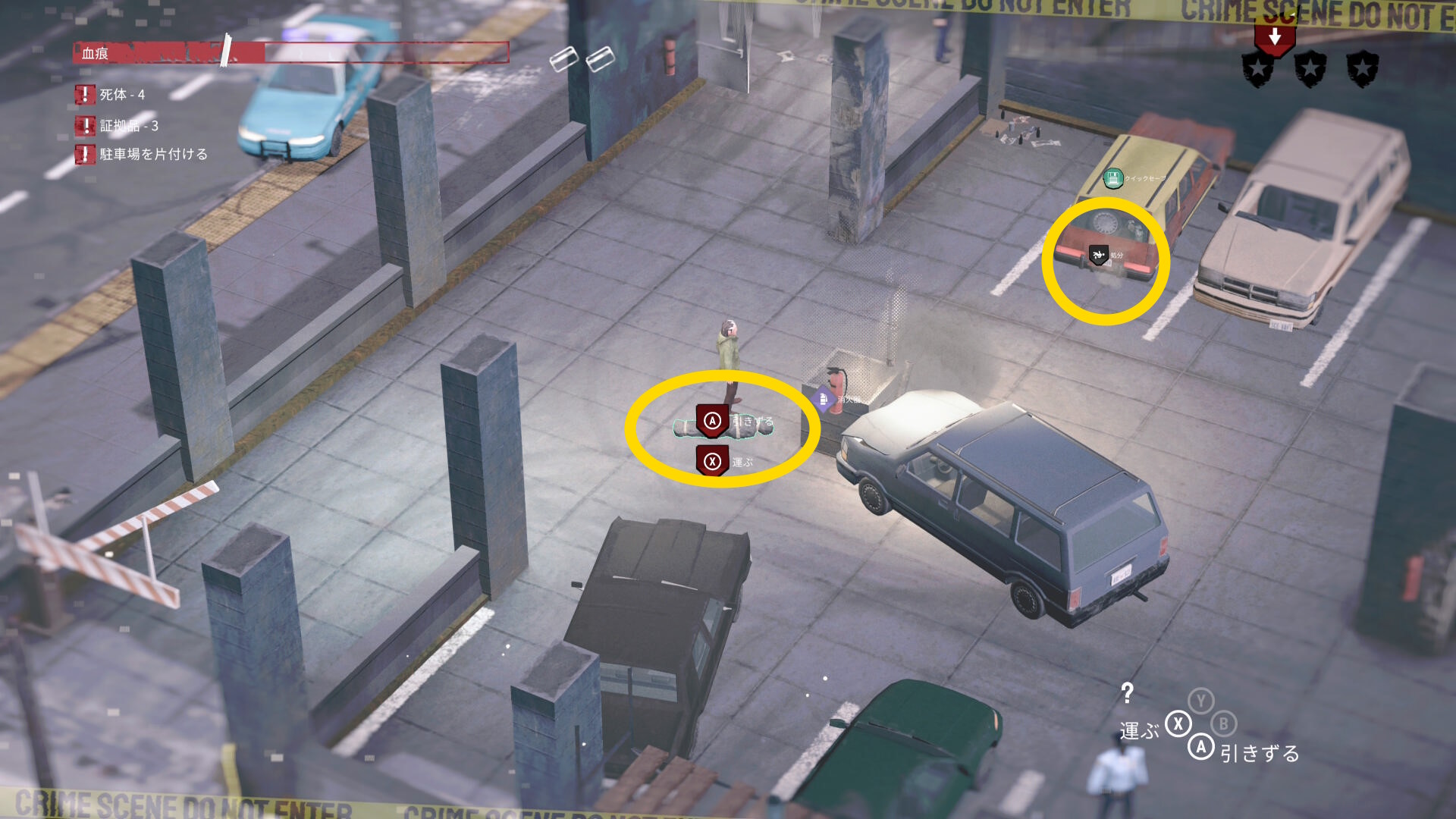 - 死体袋を担いで公共エリアを移動し、駐車場の左下入口へ向かう