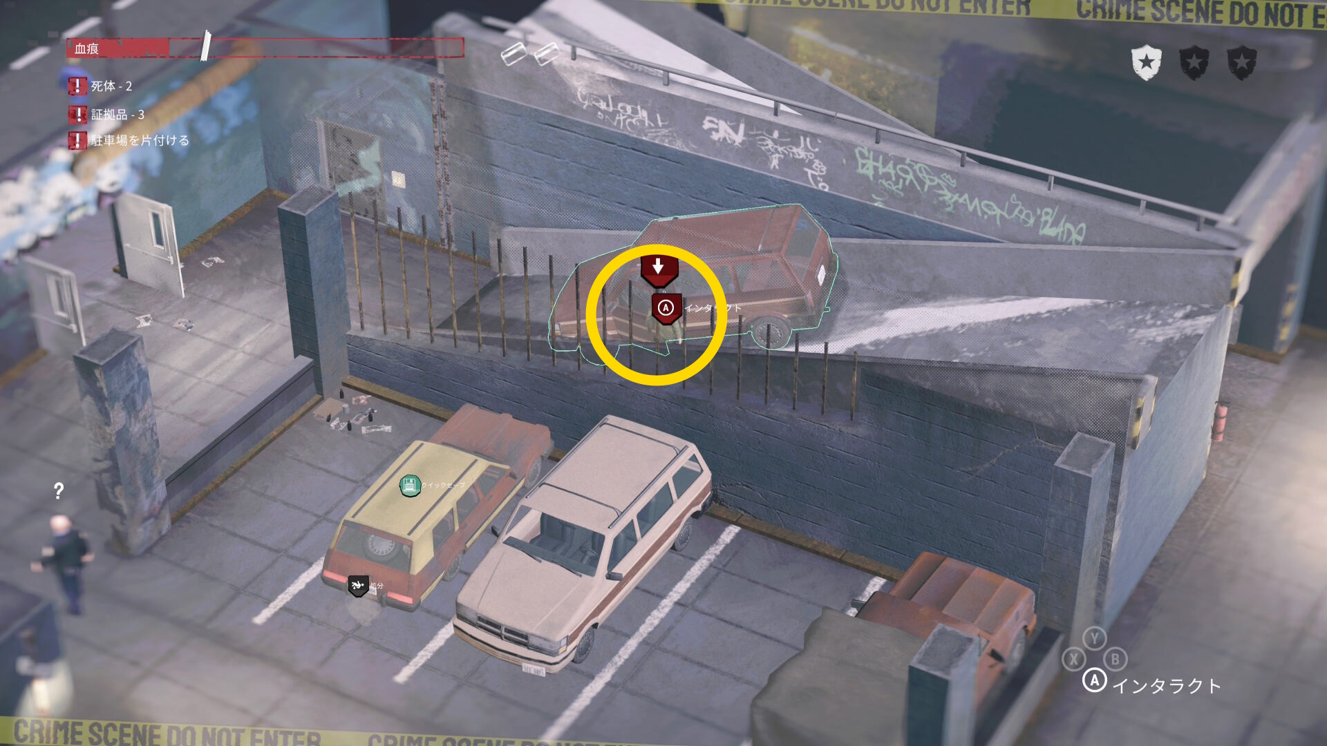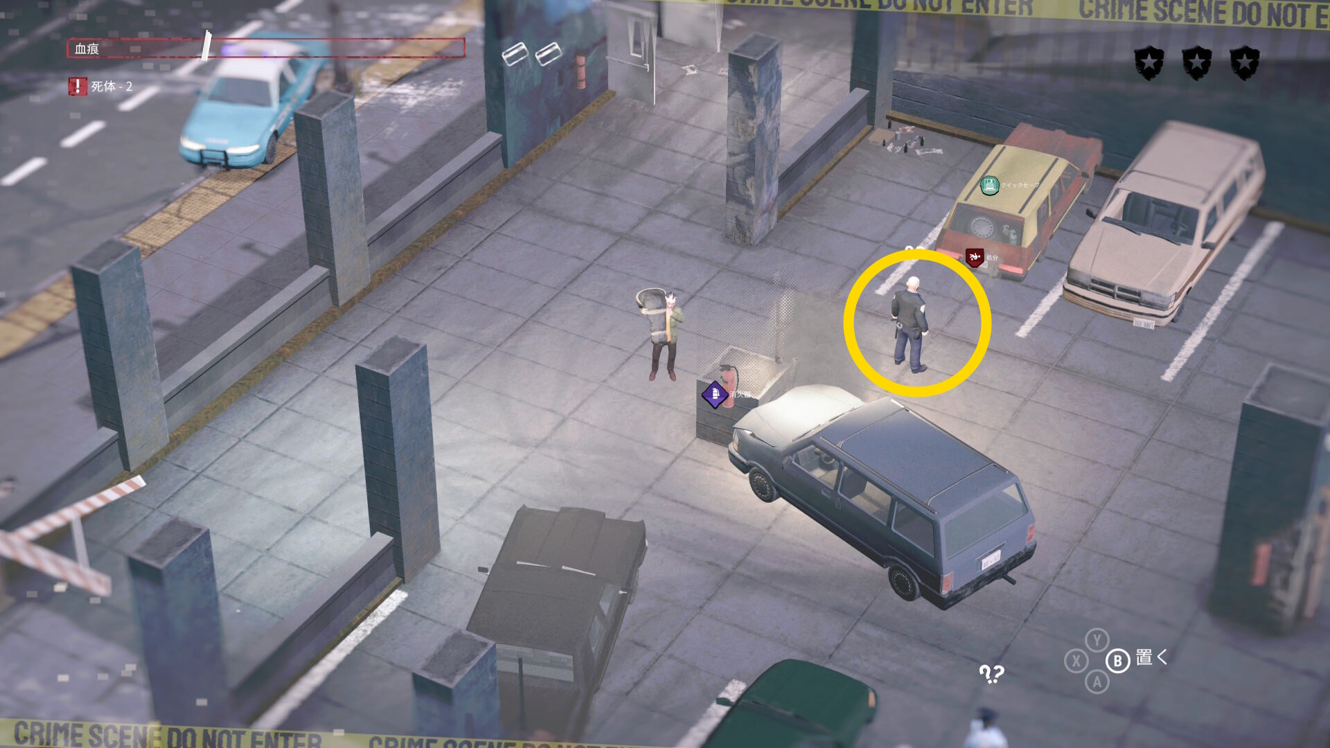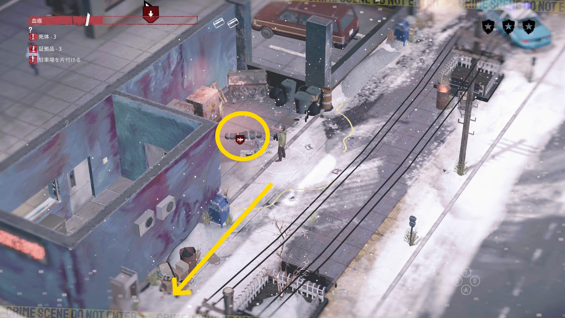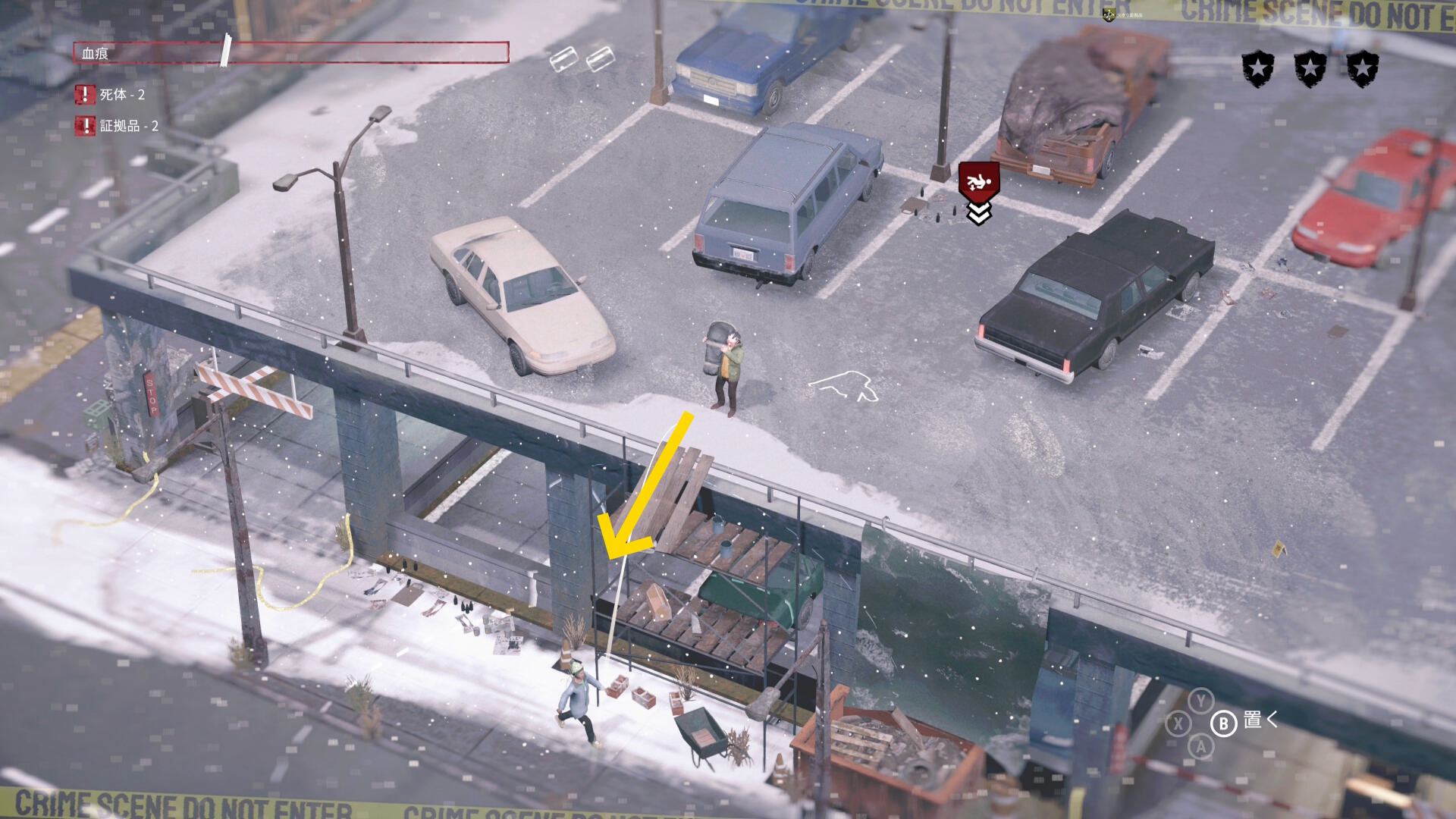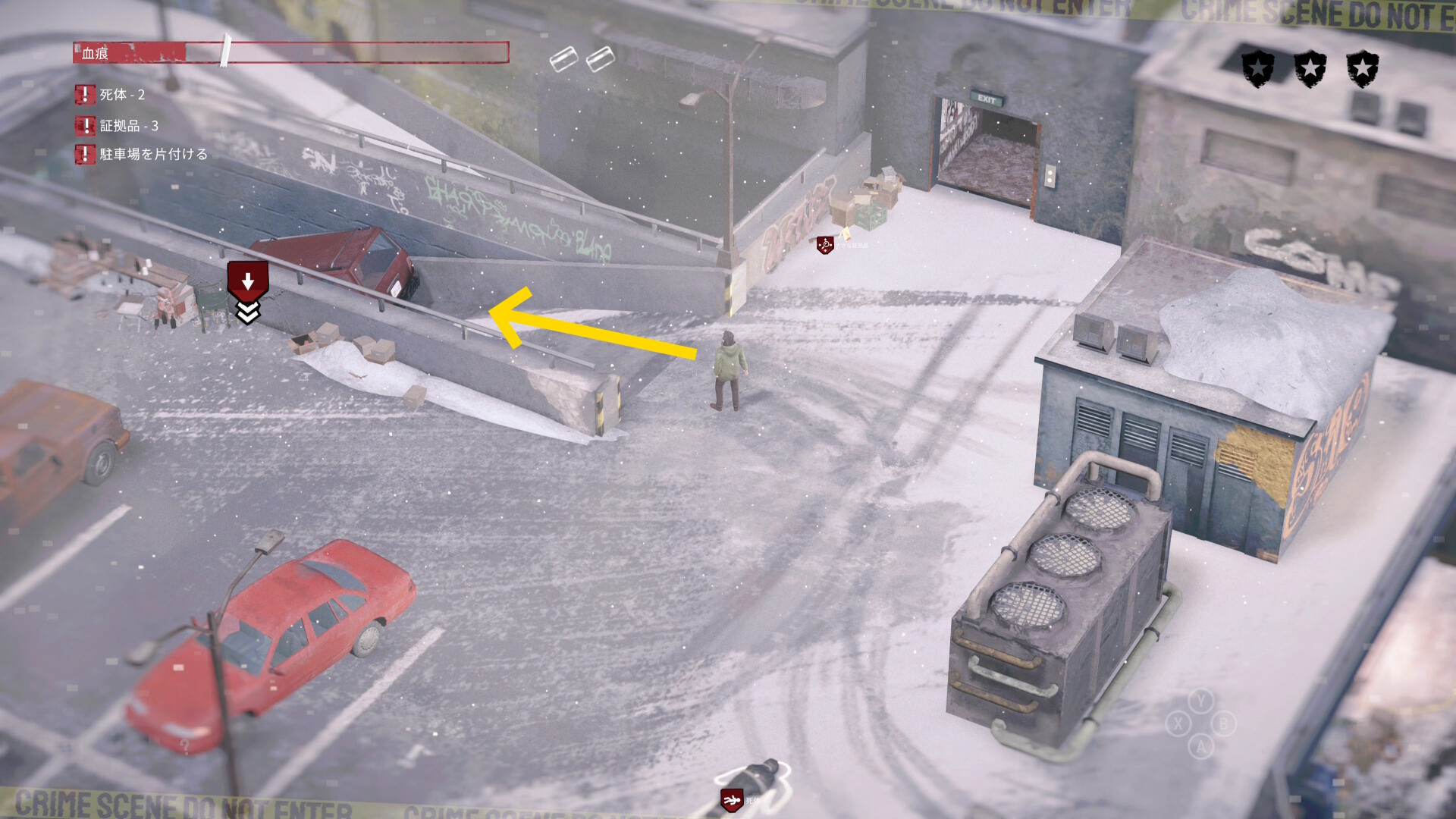 - 死体袋を担いで公共エリアを移動し、駐車場の左下入口へ向かう