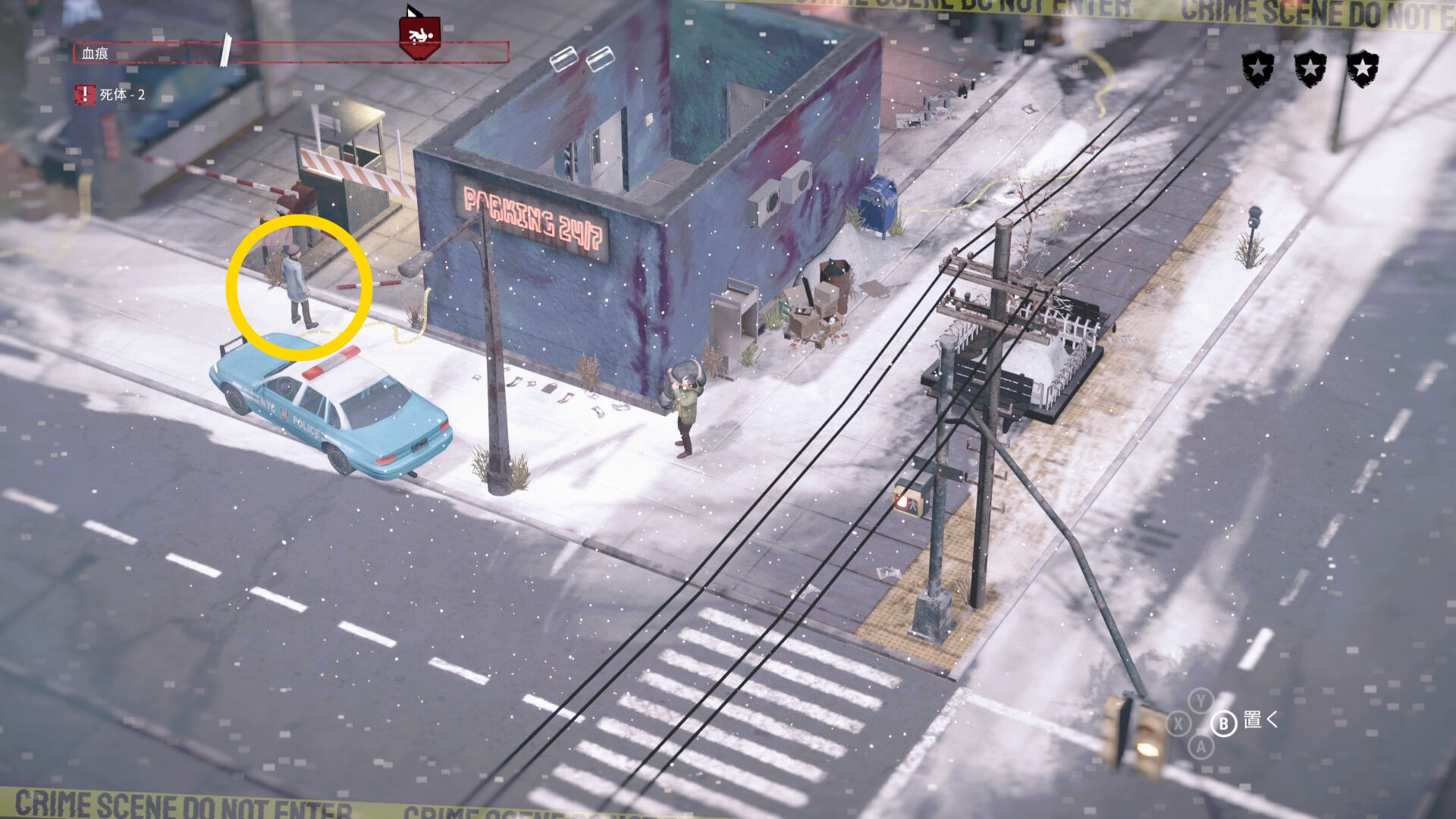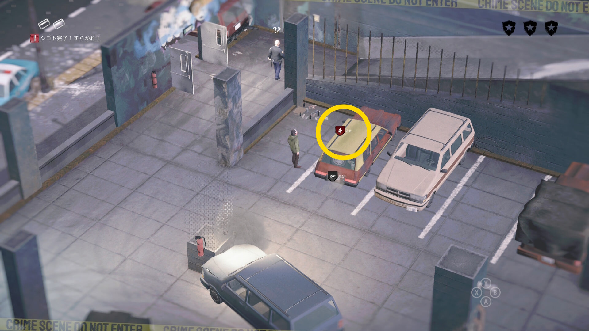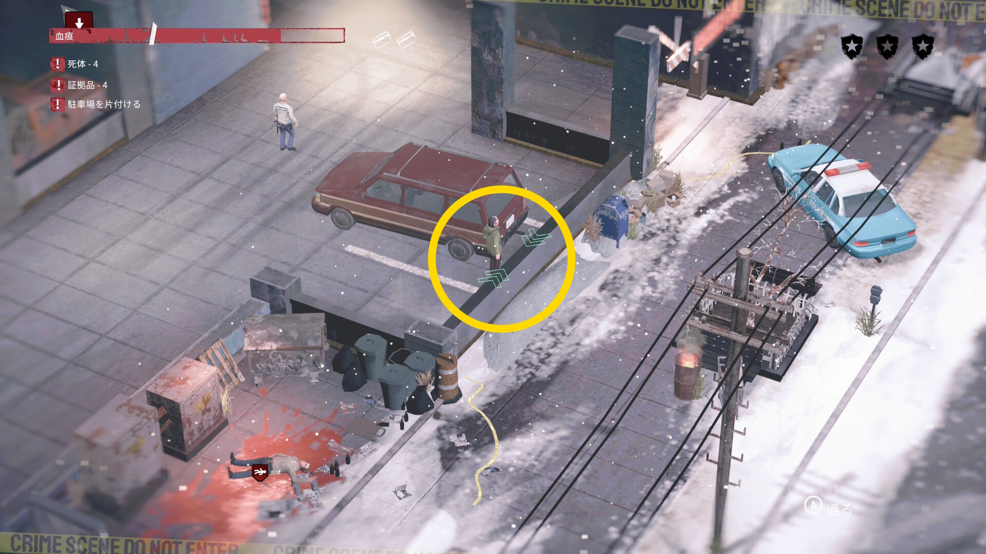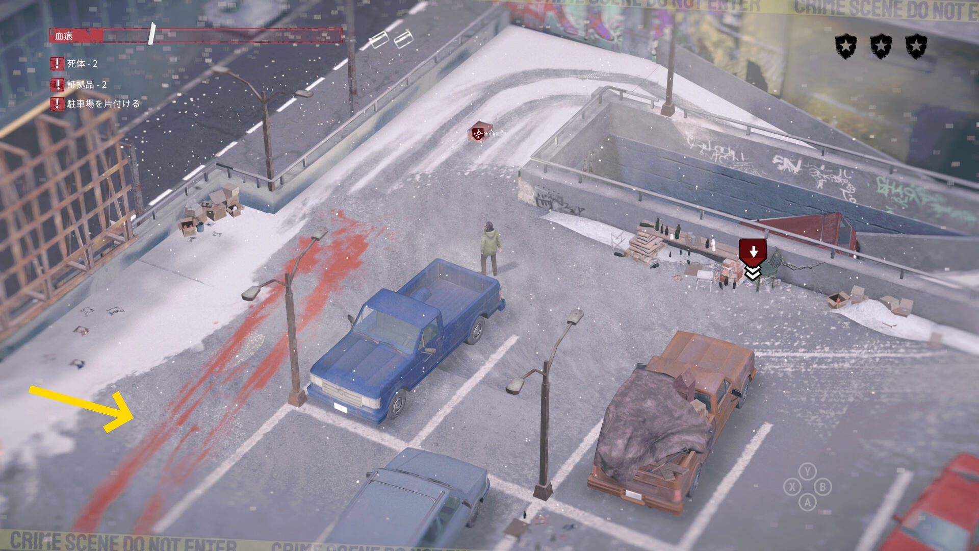 - 死体袋を担いで公共エリアを移動し、駐車場の左下入口へ向かう