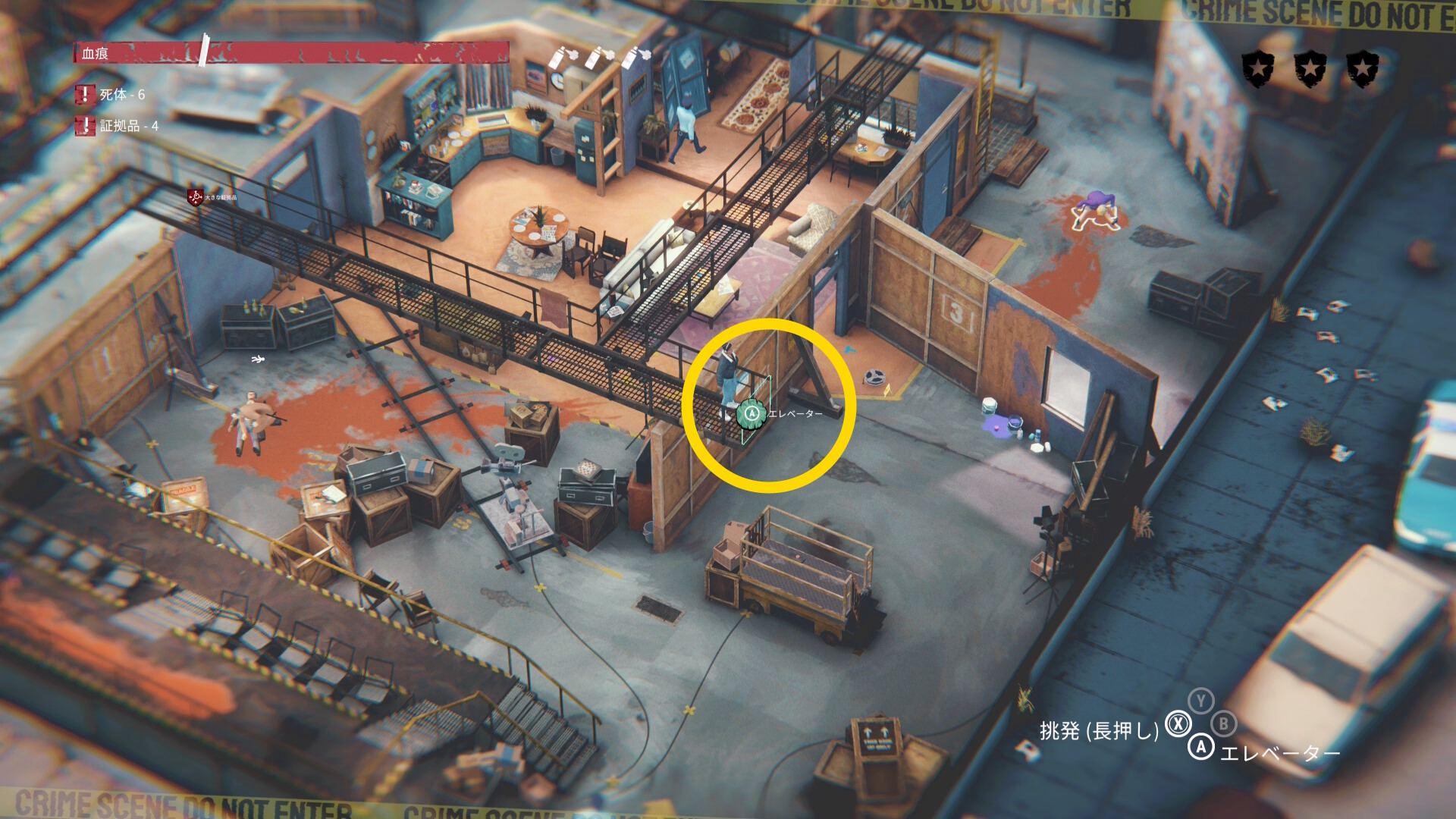 • エレベーターで下におり、いま投げた死体を取りに行く