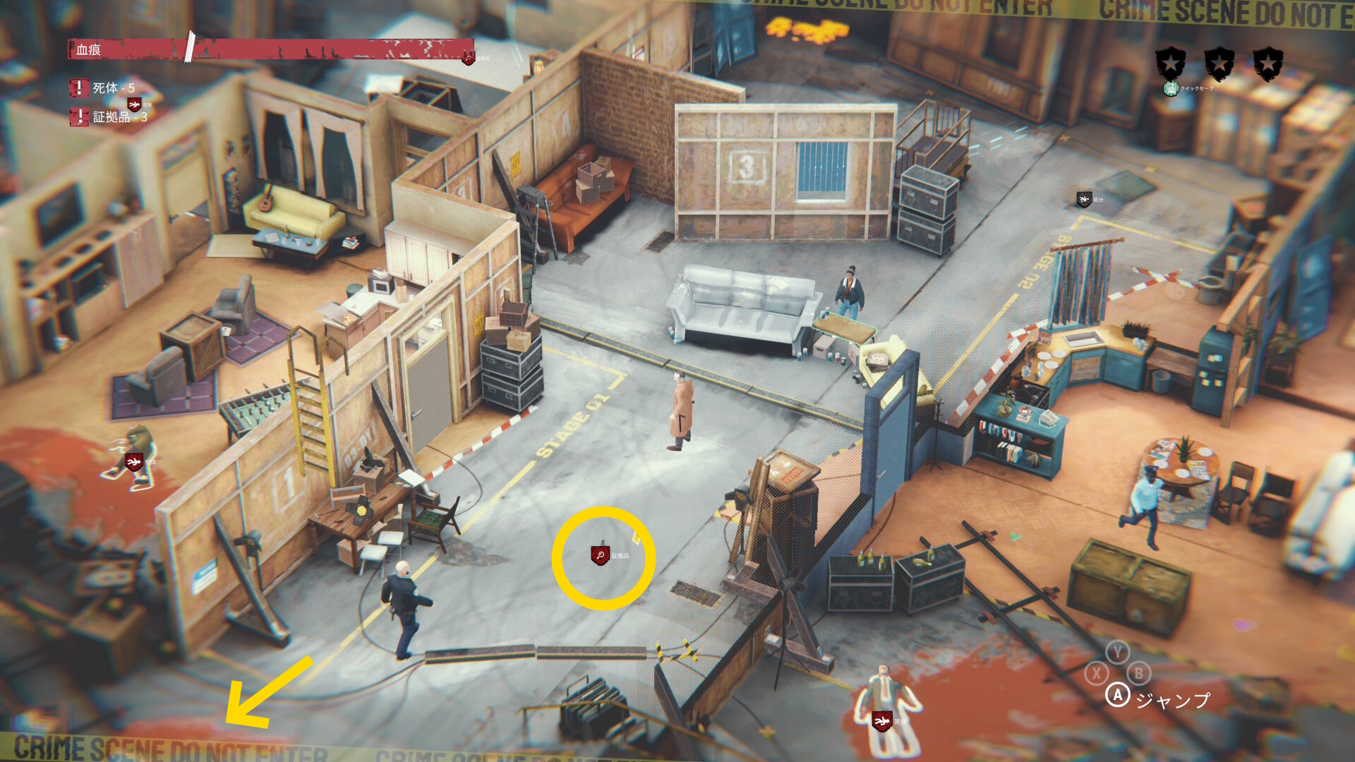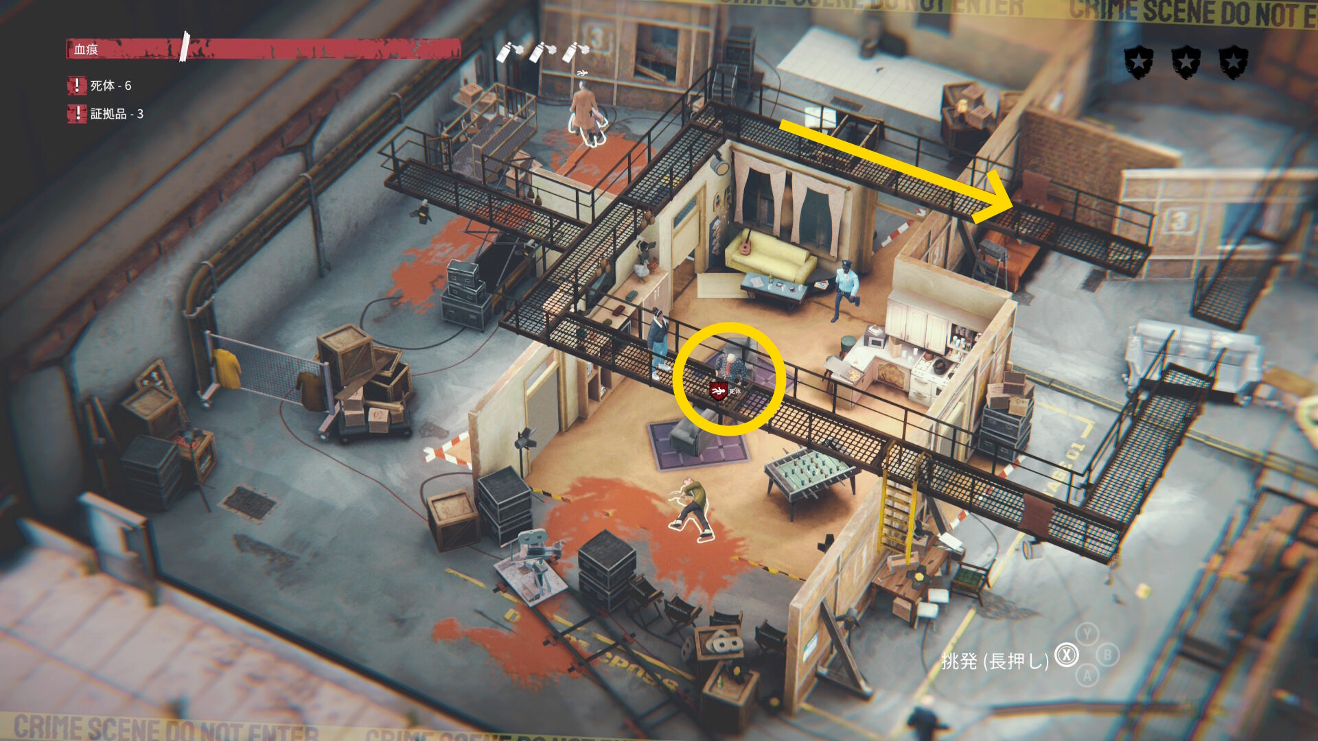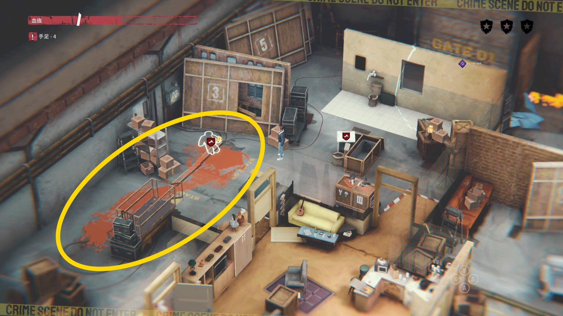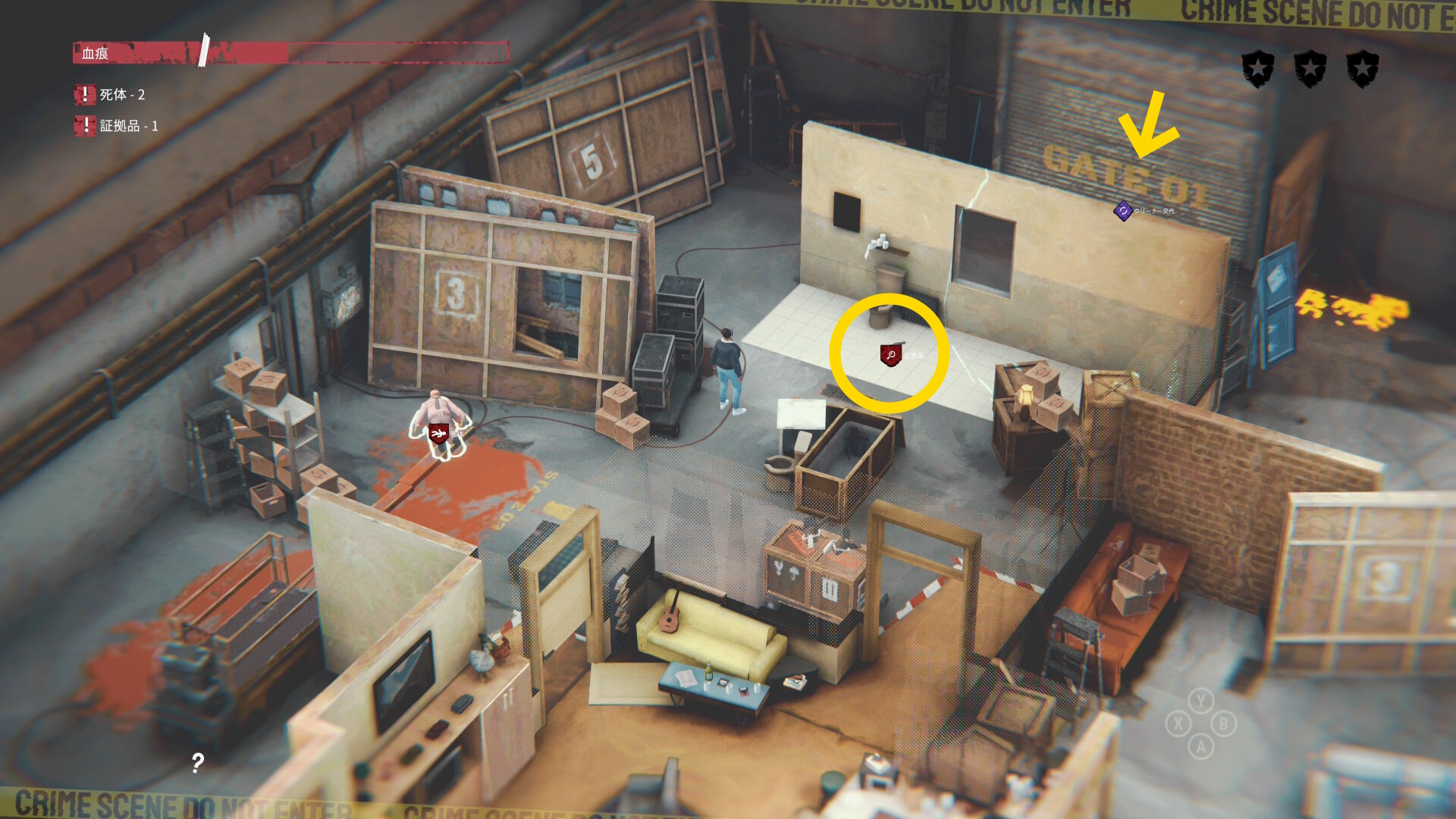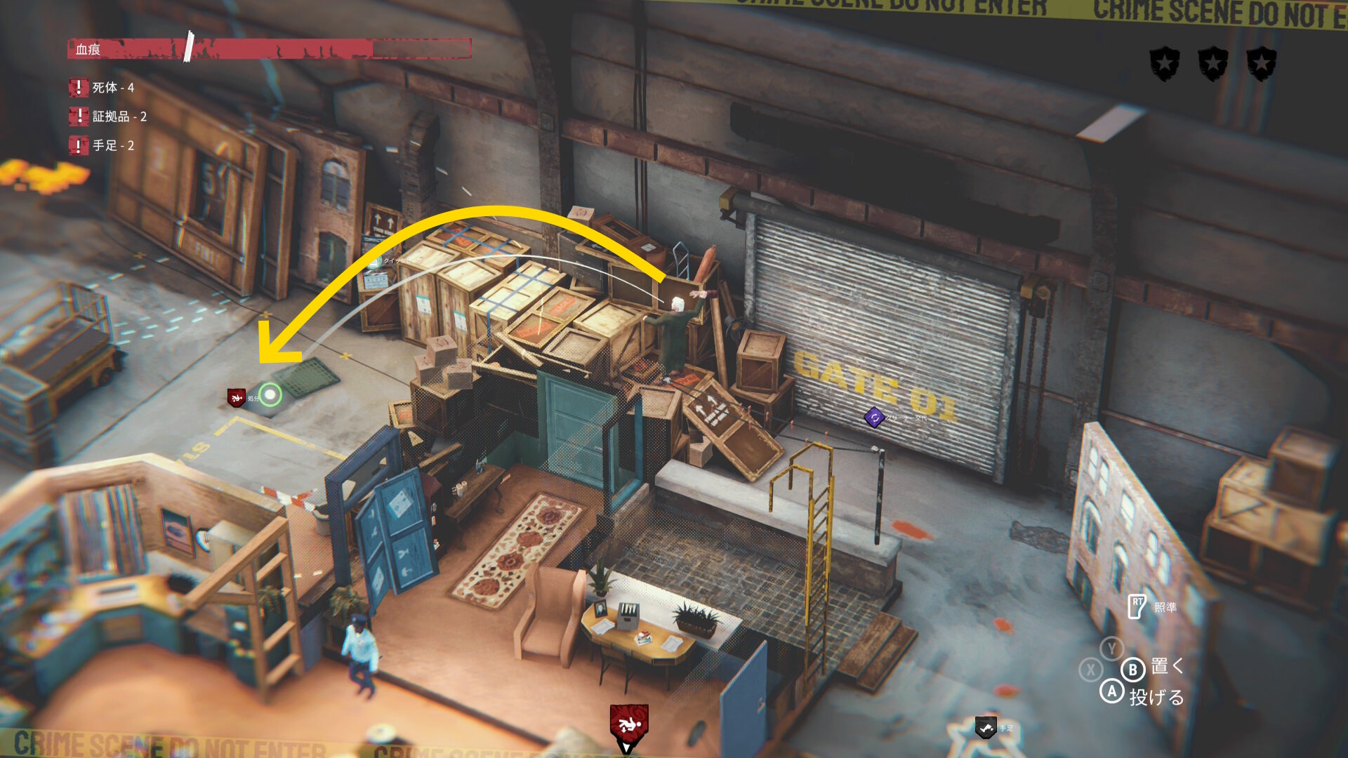 • 証拠品 を回収し、左下の血痕(下画像矢印)を片付ける