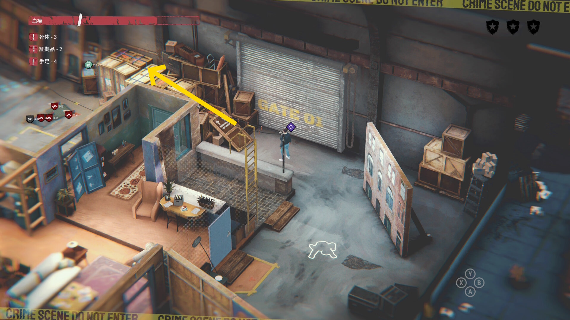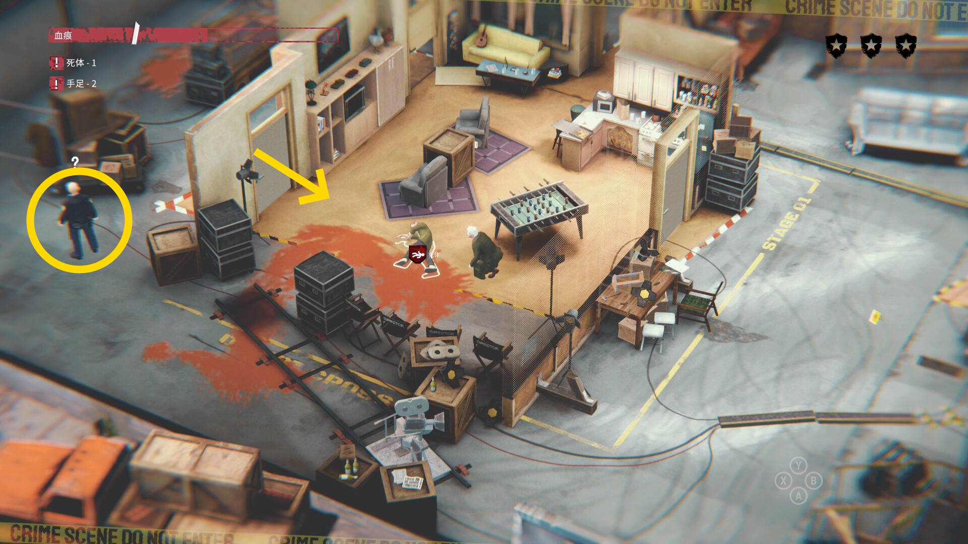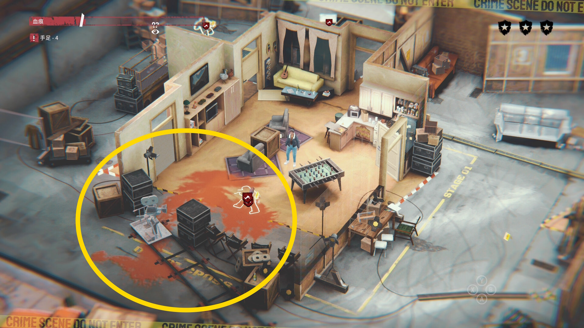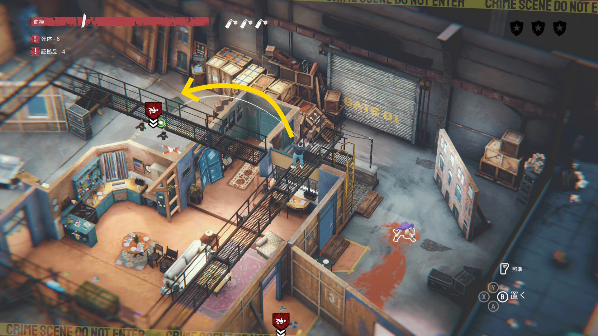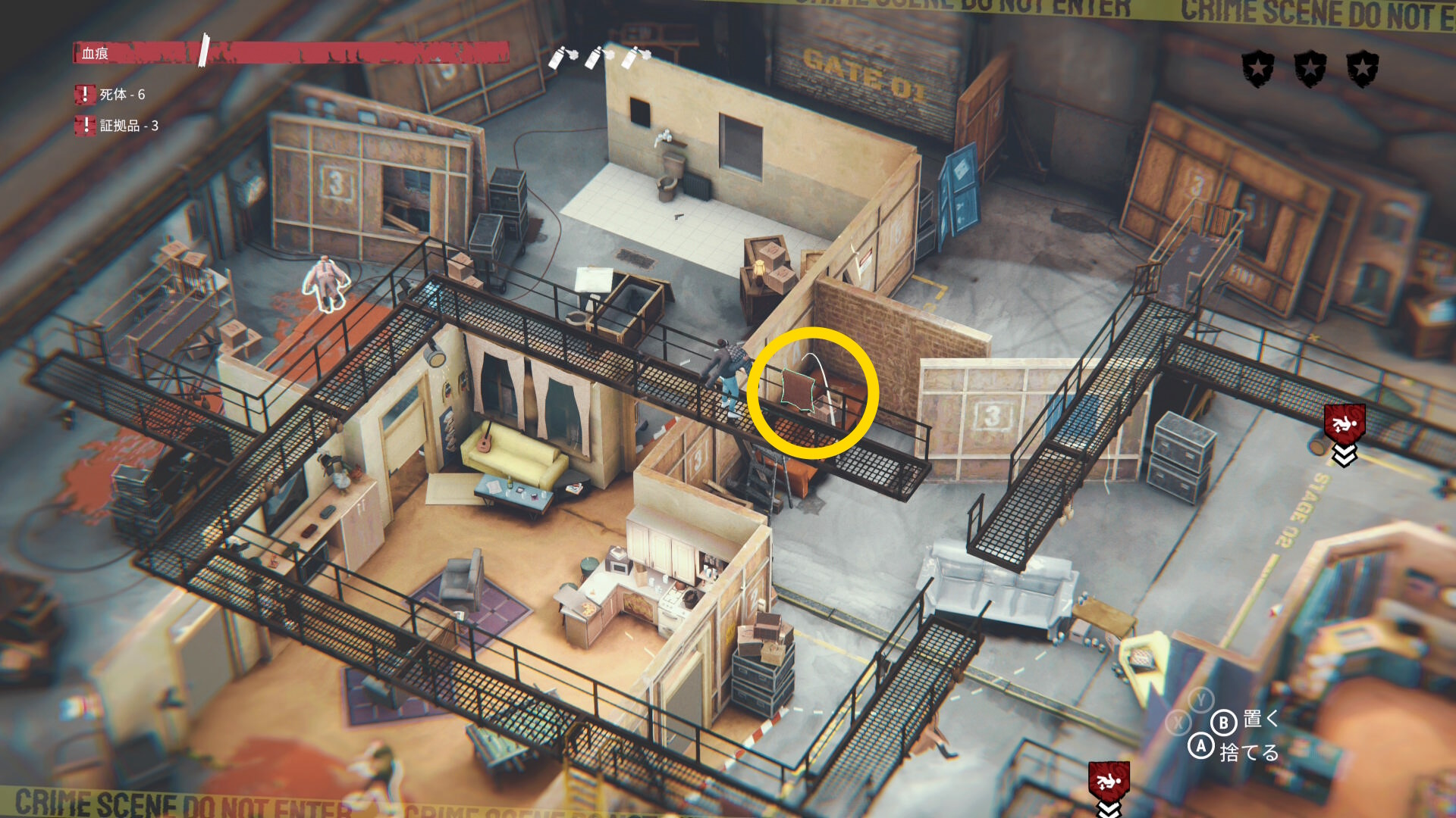 • 証拠品 を回収し、左下の血痕(下画像矢印)を片付ける