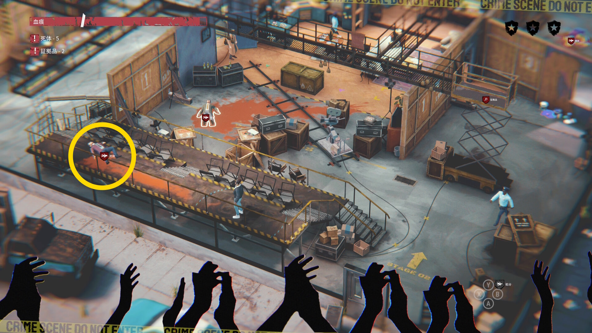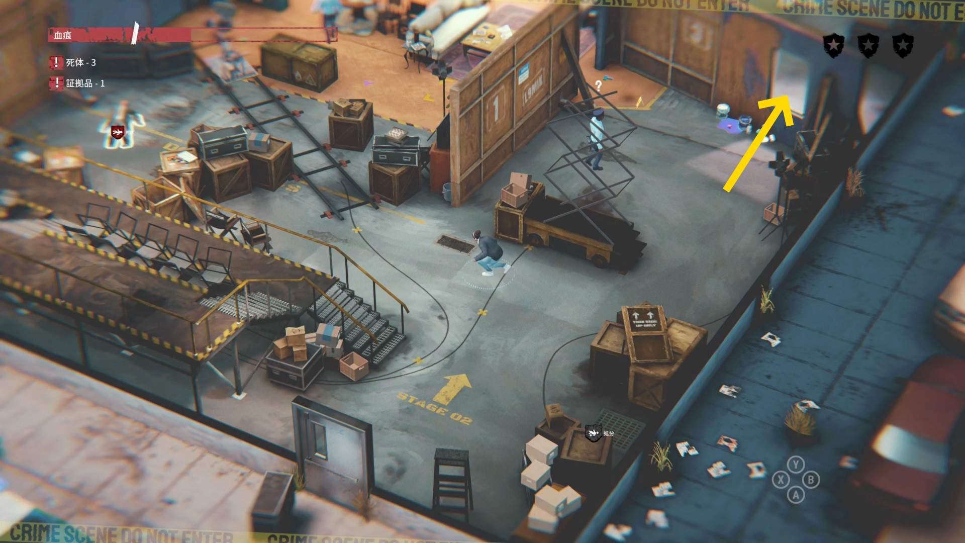 • 証拠品の回収と血痕の片付けを終えたら、右側の観覧席の下に入る