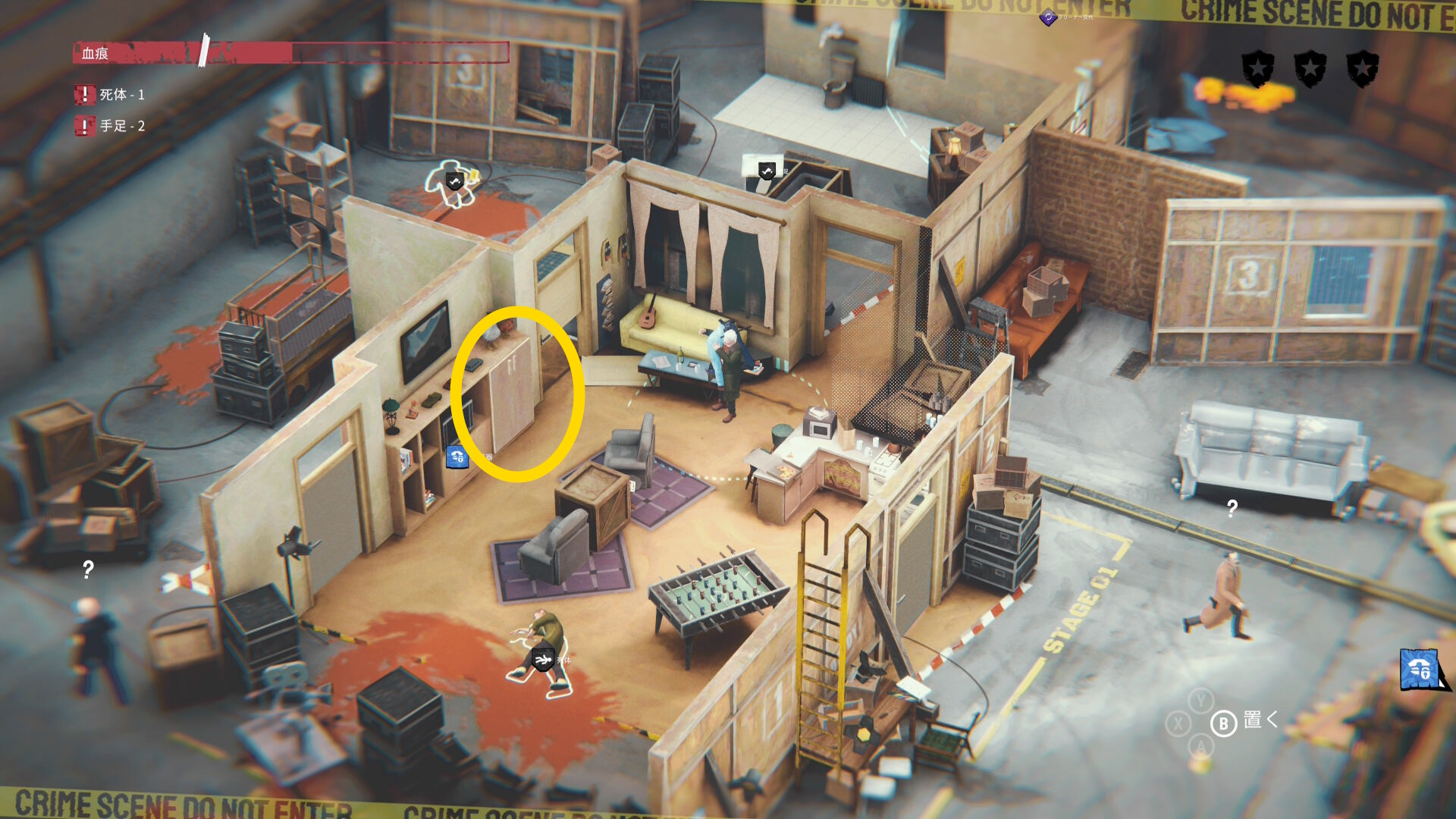 • 戸棚のあるセットに 6体目の死体 と血痕がある