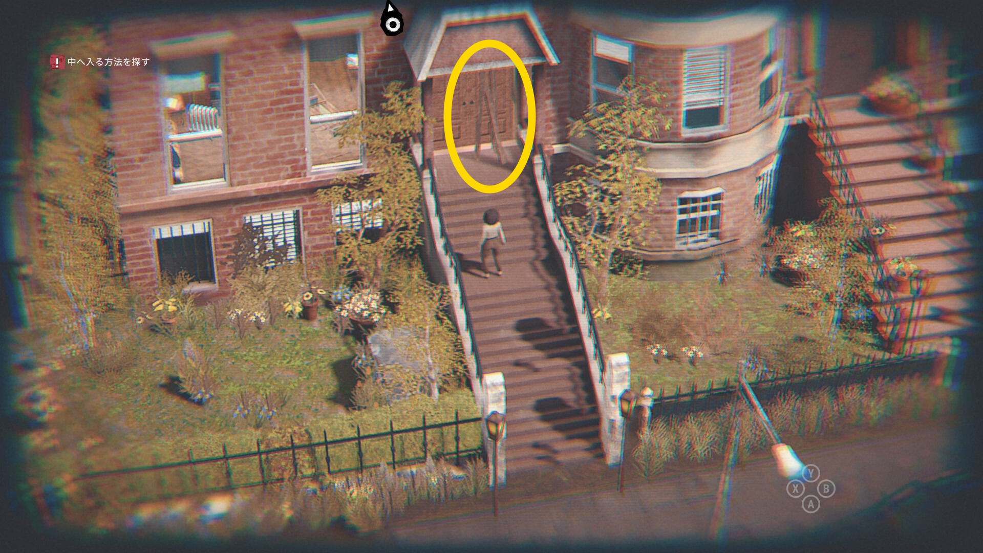 • 階段を登り、玄関ドアを塞いでいる木材をどける
