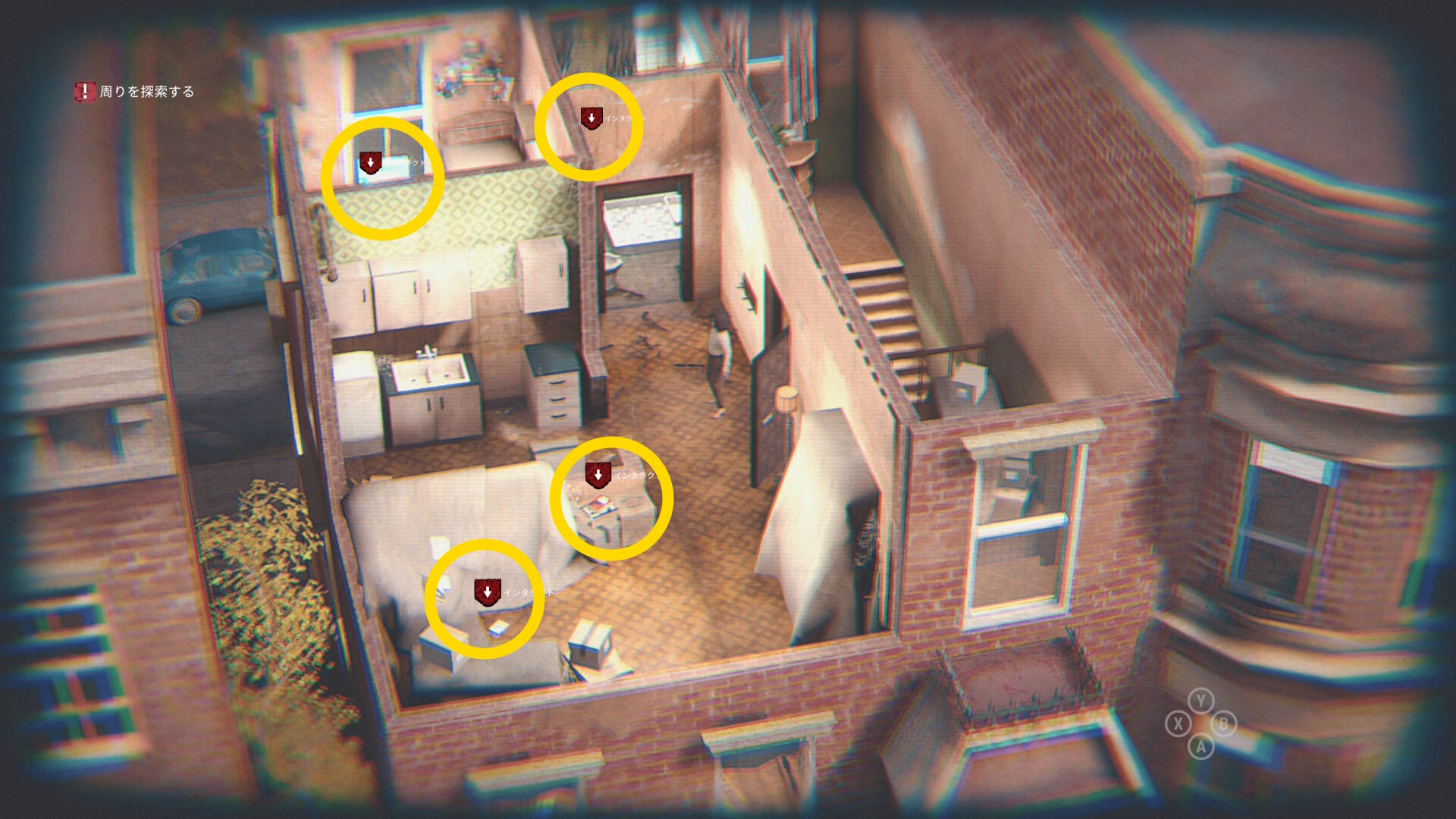 • 部屋に入ると4箇所のオブジェクトが出現する