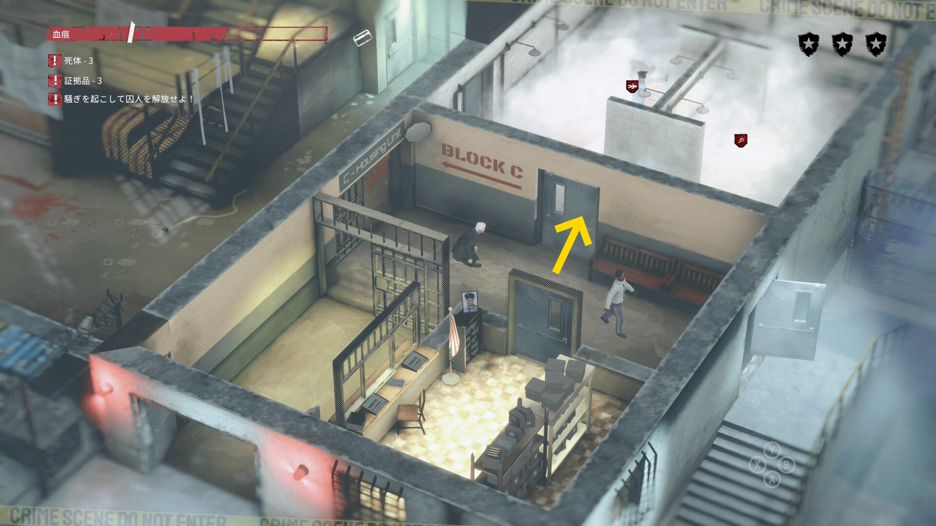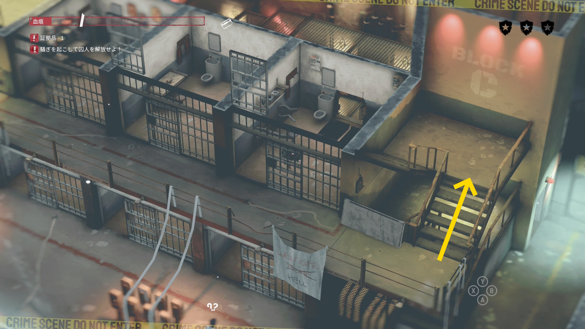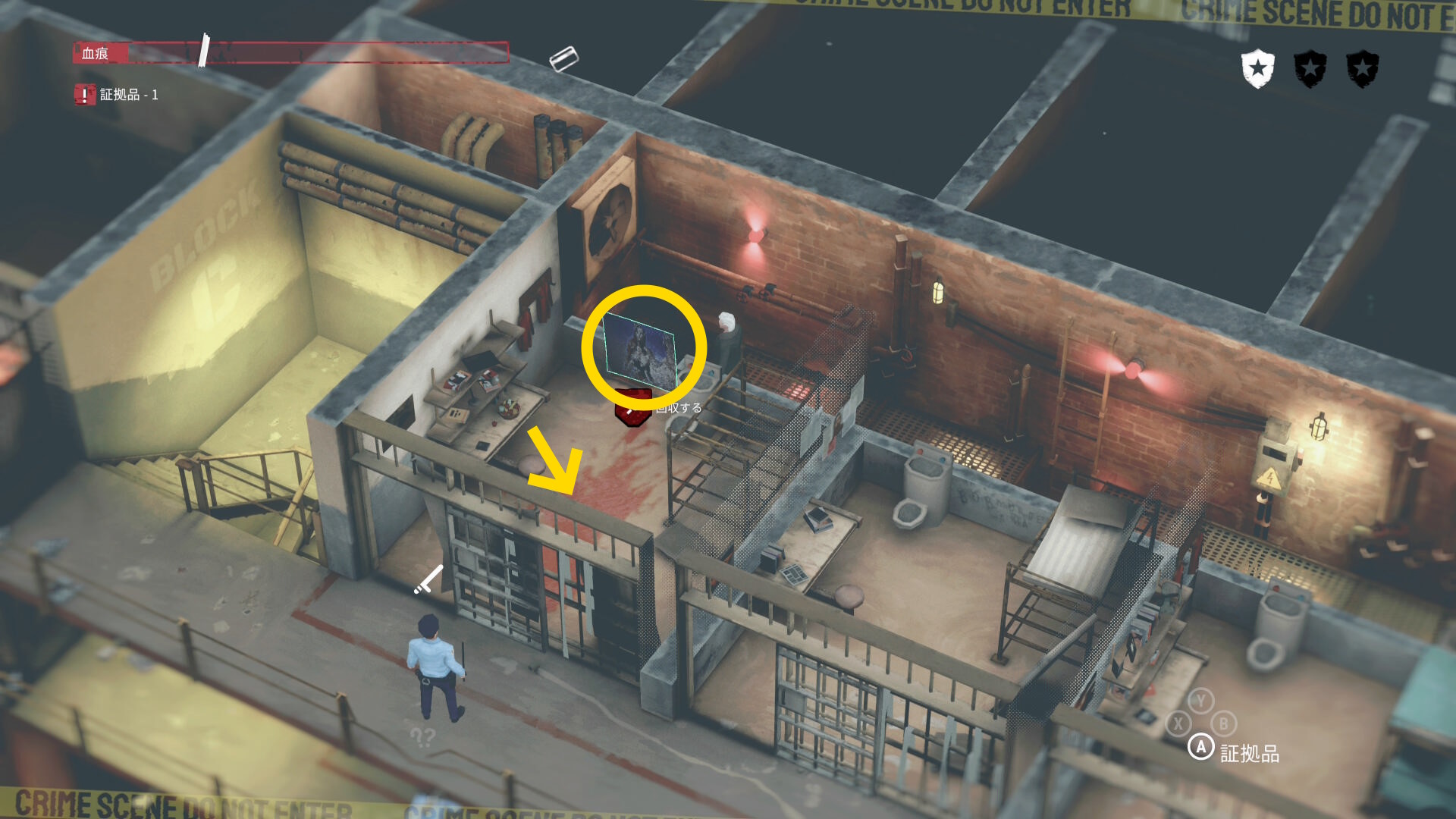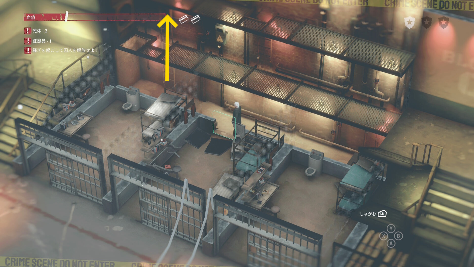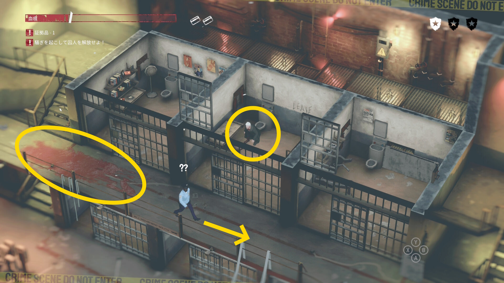 - 証拠品を回収後、”シゴト完了” になるが、しゃがみで牢屋に入って血痕を片付ける(警察官に注意)