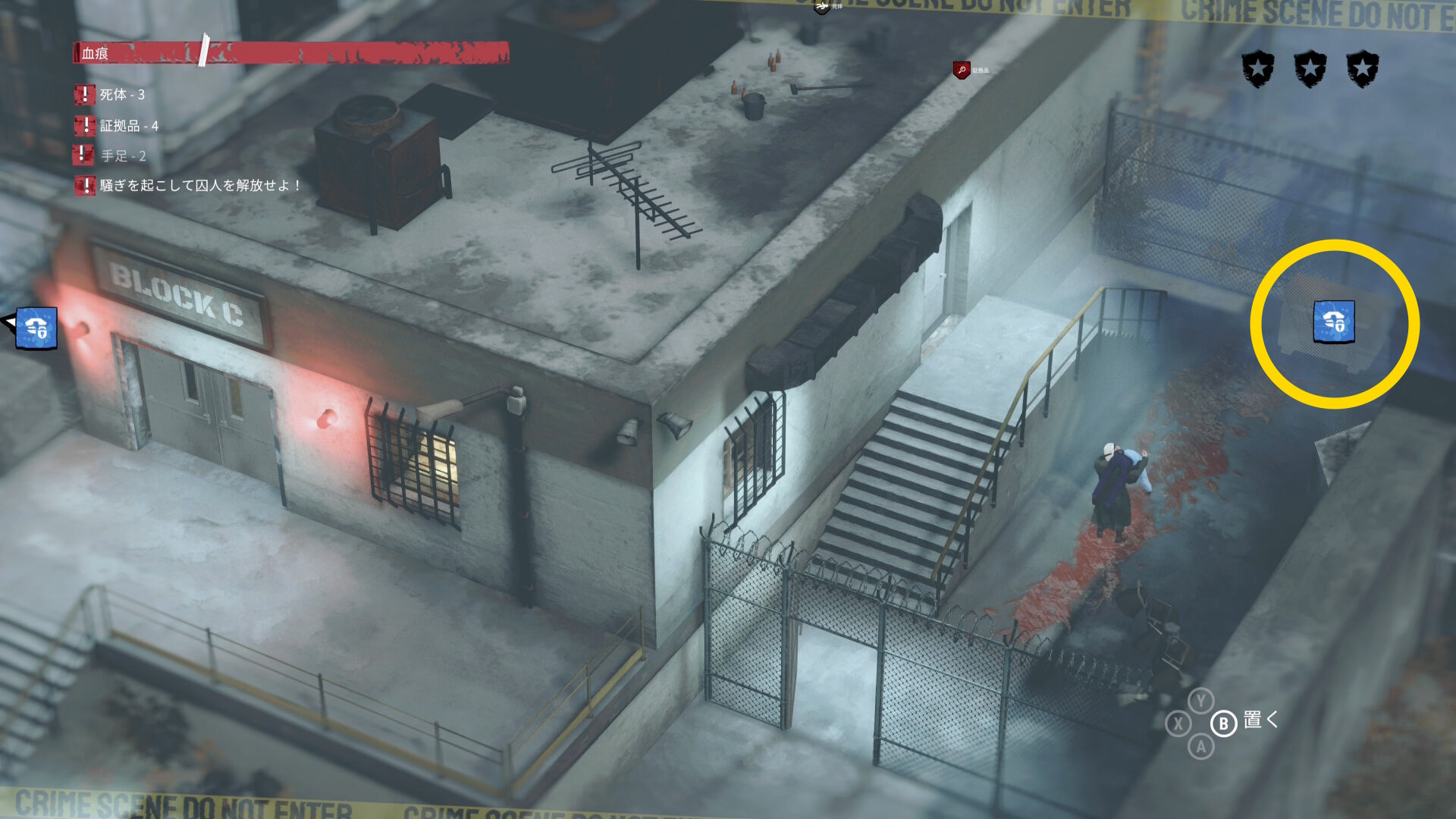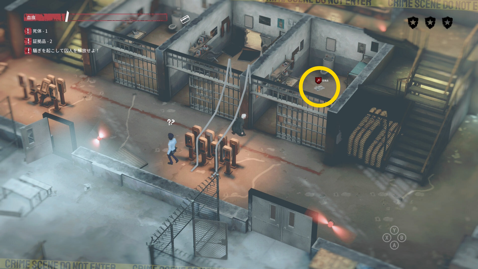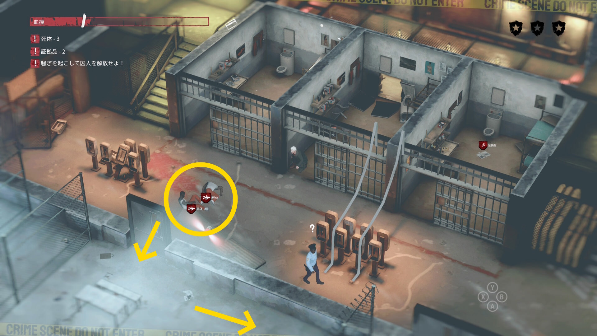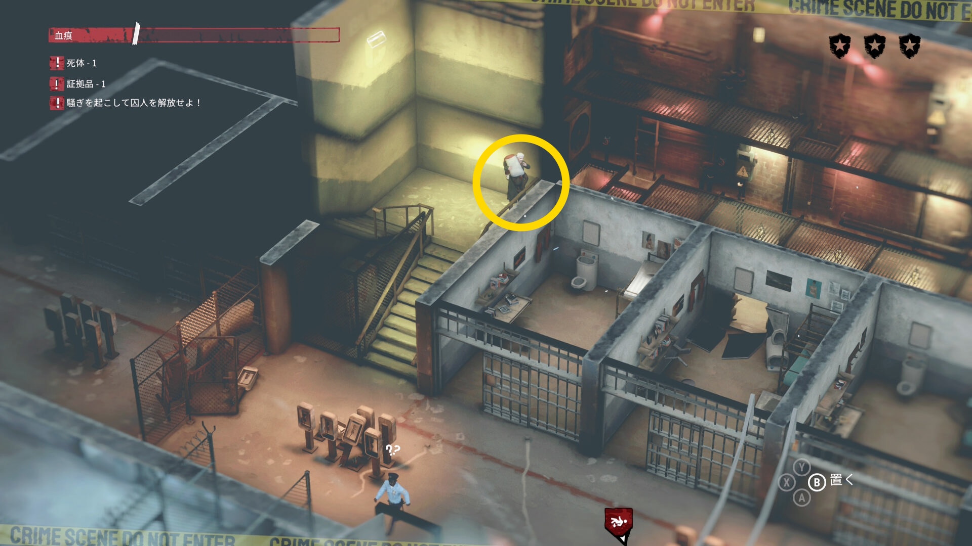 - 証拠品を回収後、”シゴト完了” になるが、しゃがみで牢屋に入って血痕を片付ける(警察官に注意)