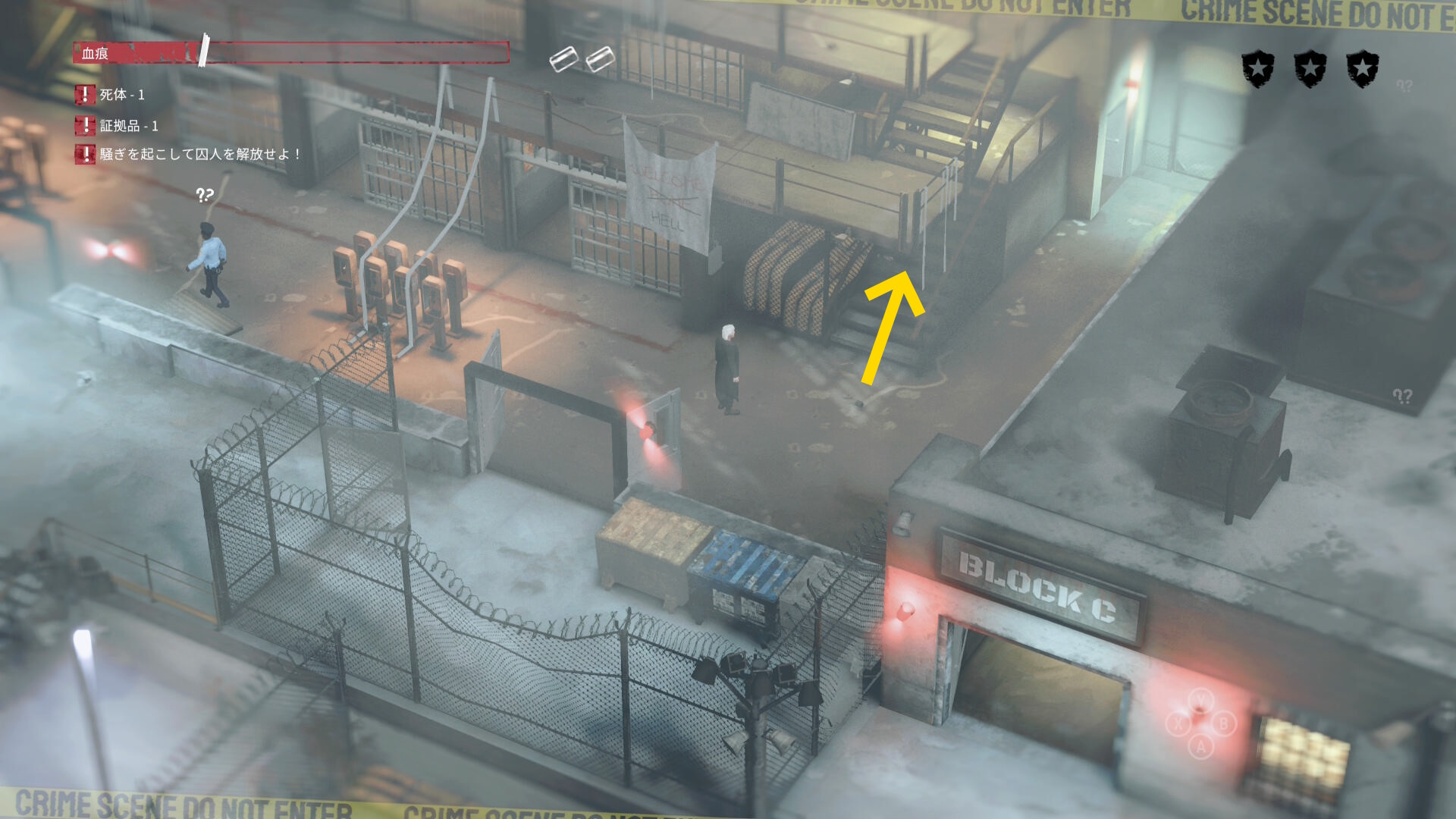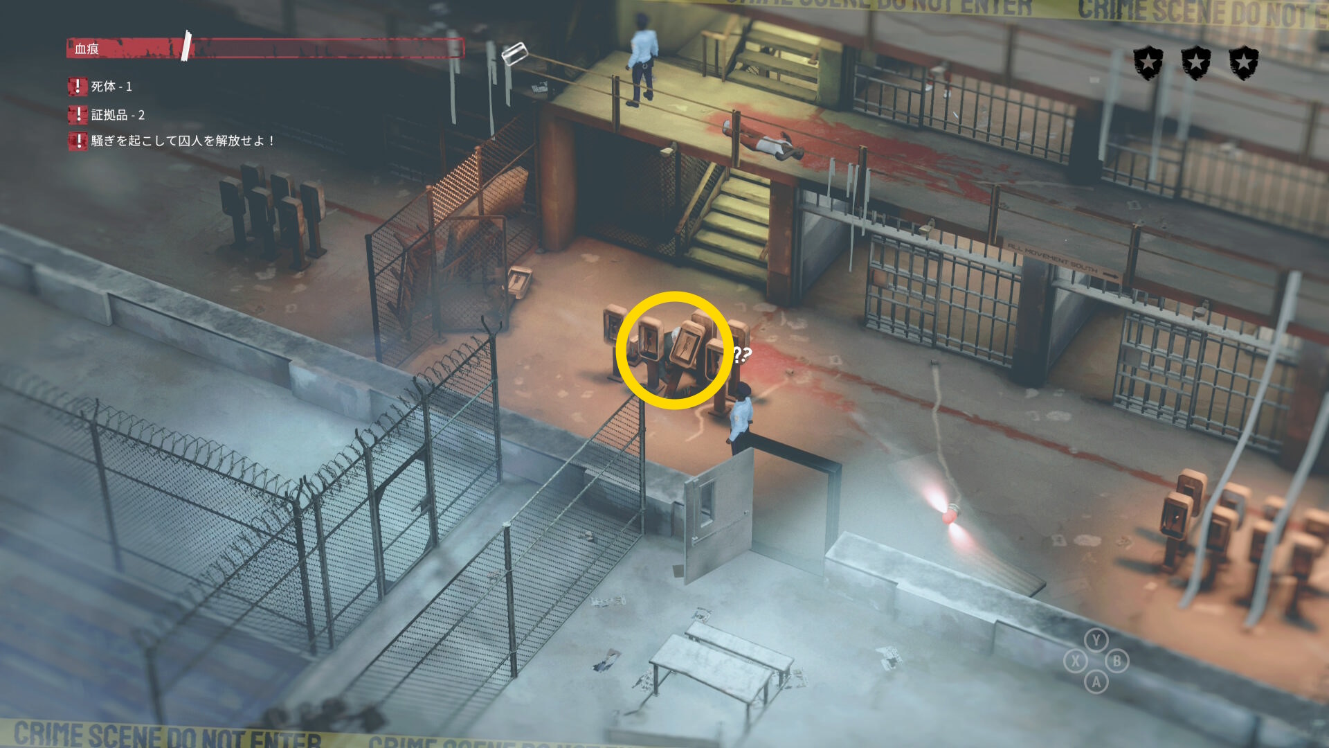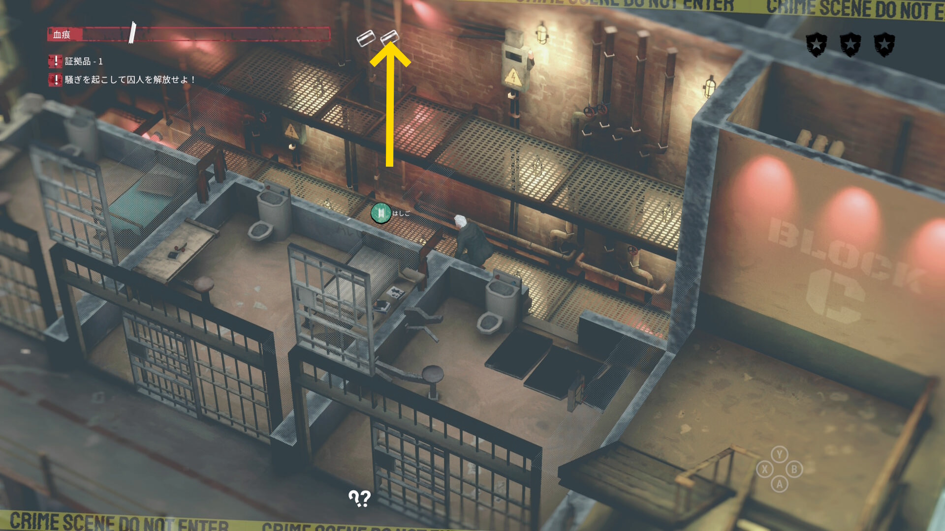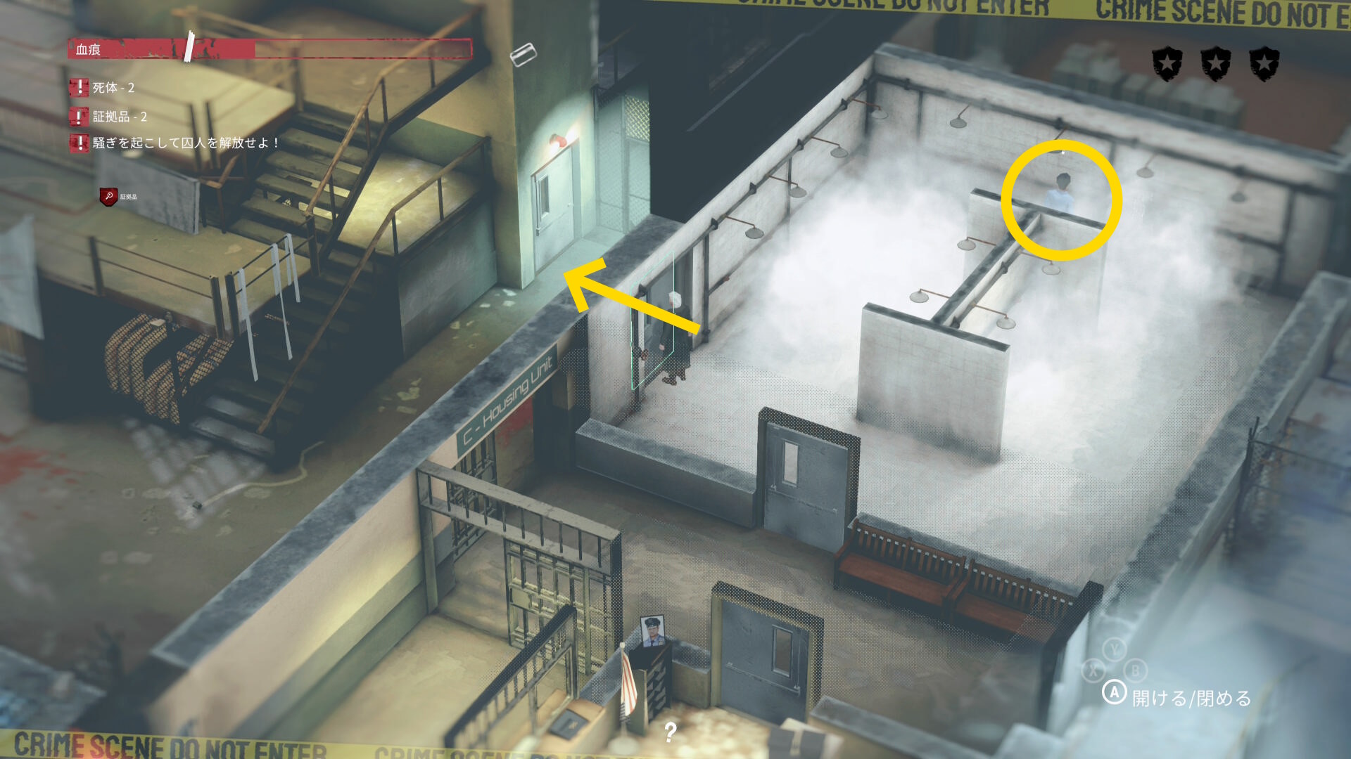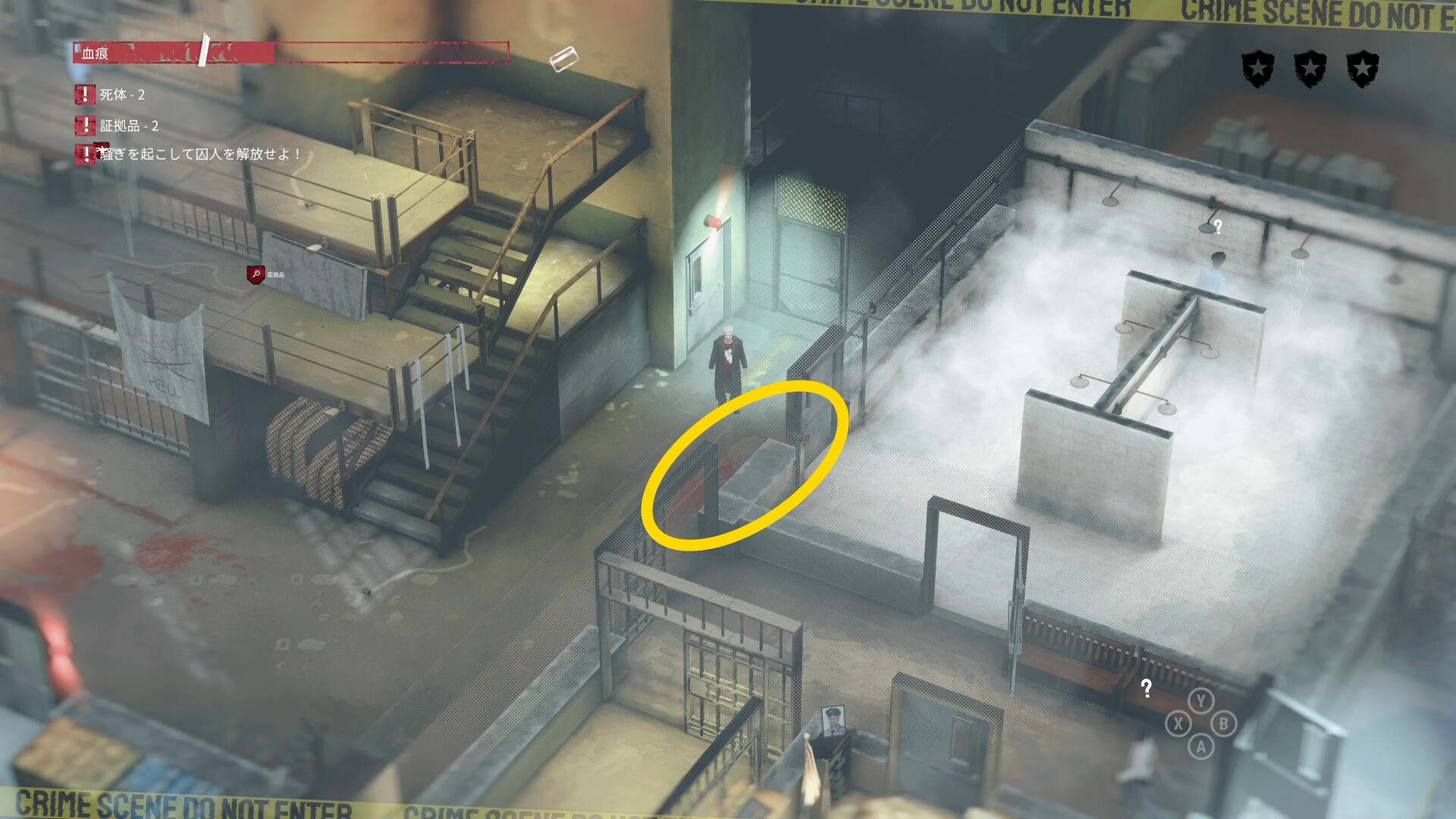 - 証拠品を回収後、”シゴト完了” になるが、しゃがみで牢屋に入って血痕を片付ける(警察官に注意)
