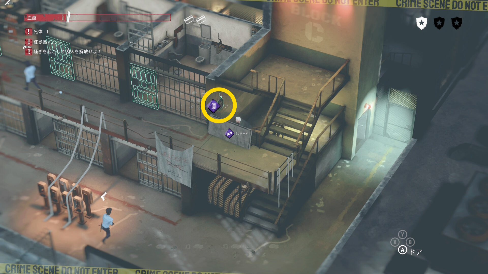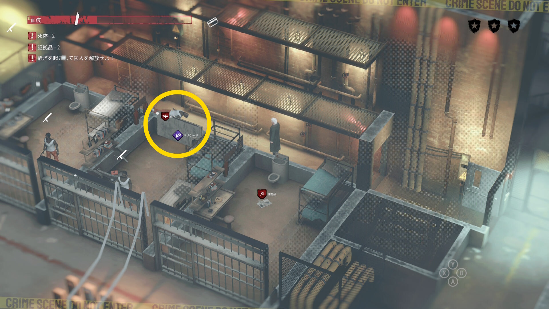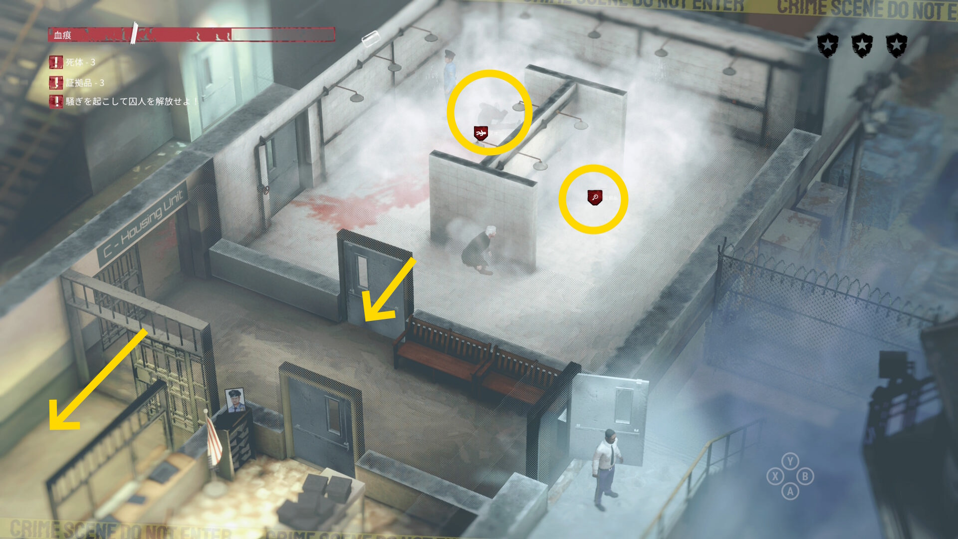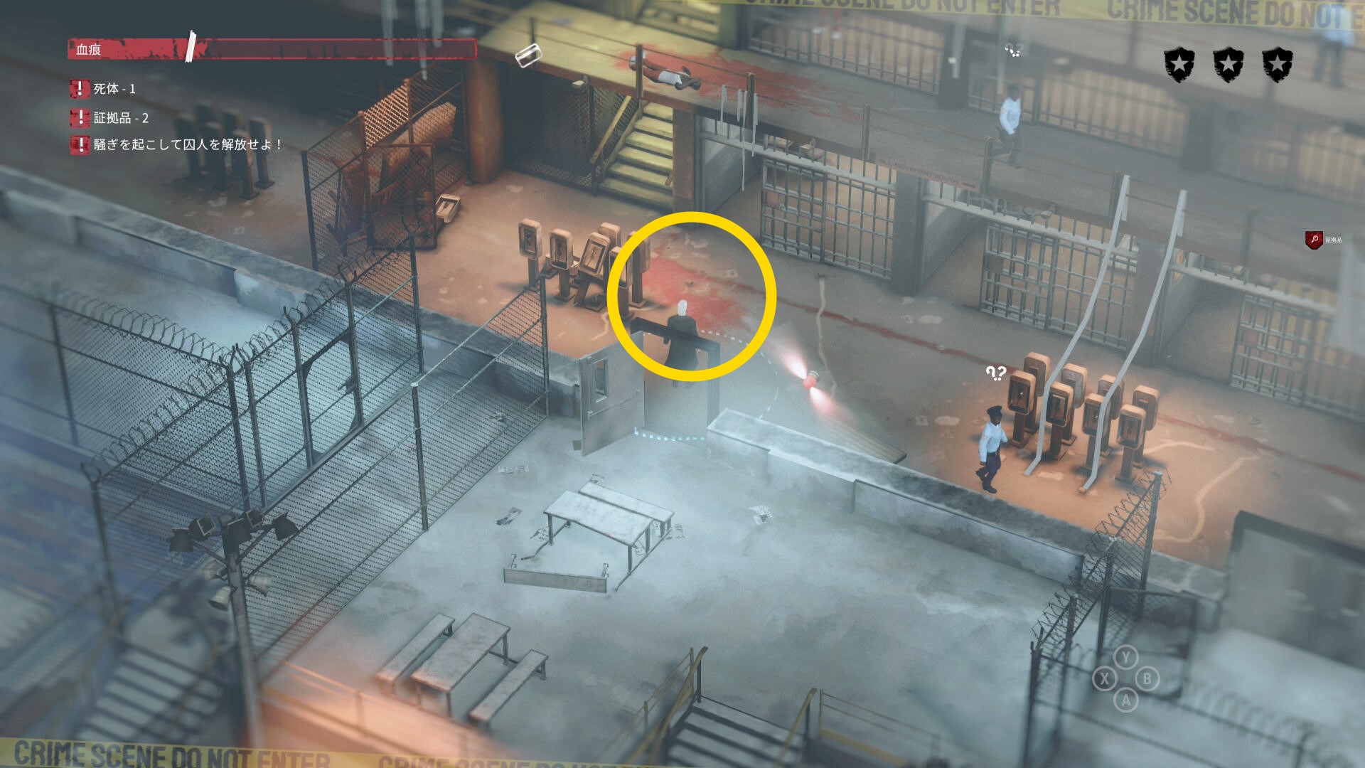- 証拠品を回収後、”シゴト完了” になるが、しゃがみで牢屋に入って血痕を片付ける(警察官に注意)