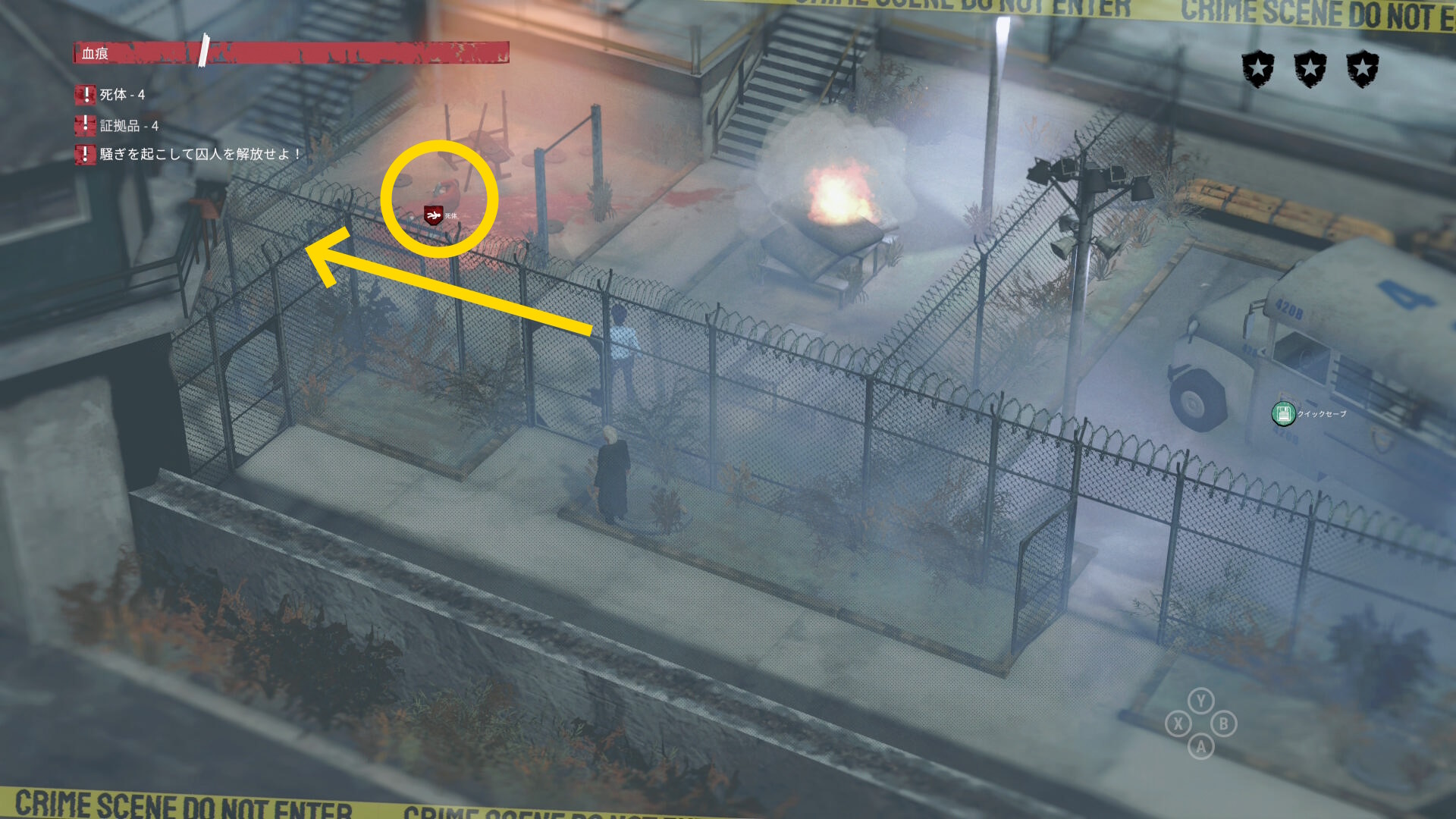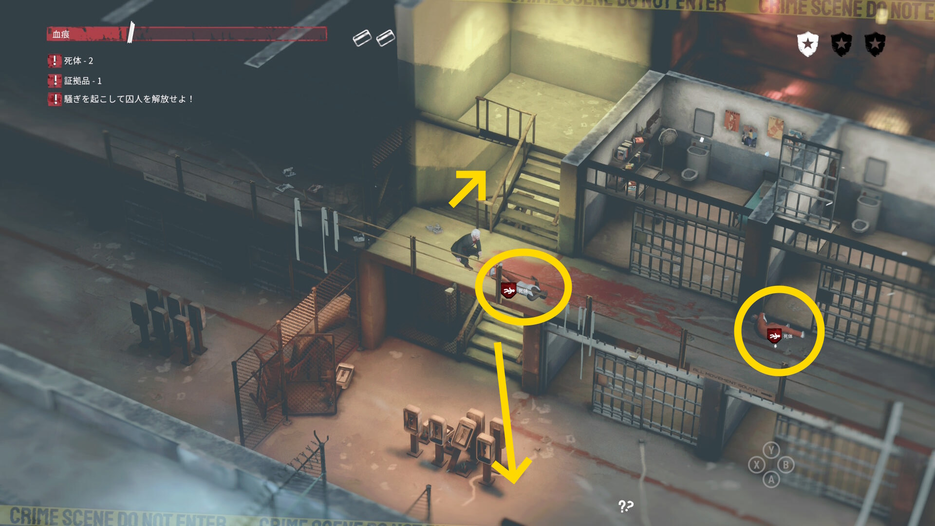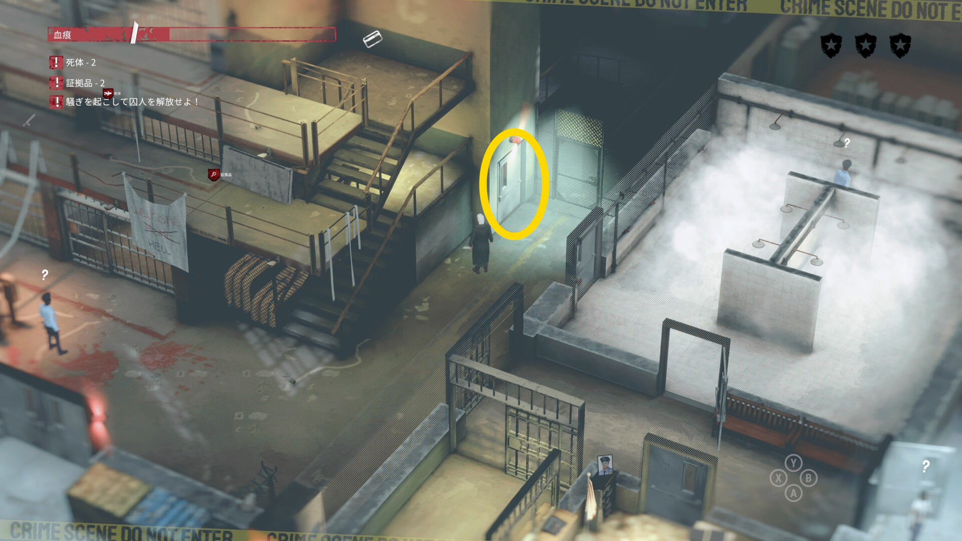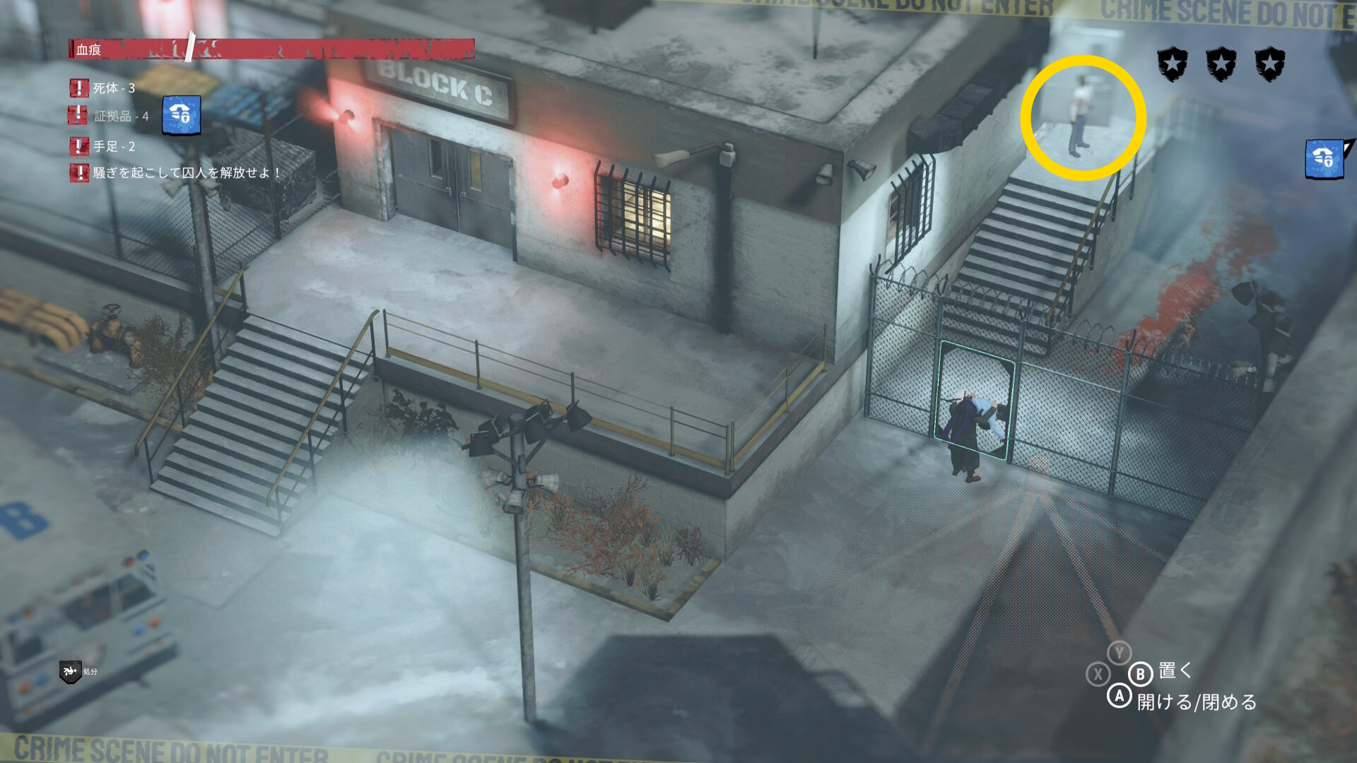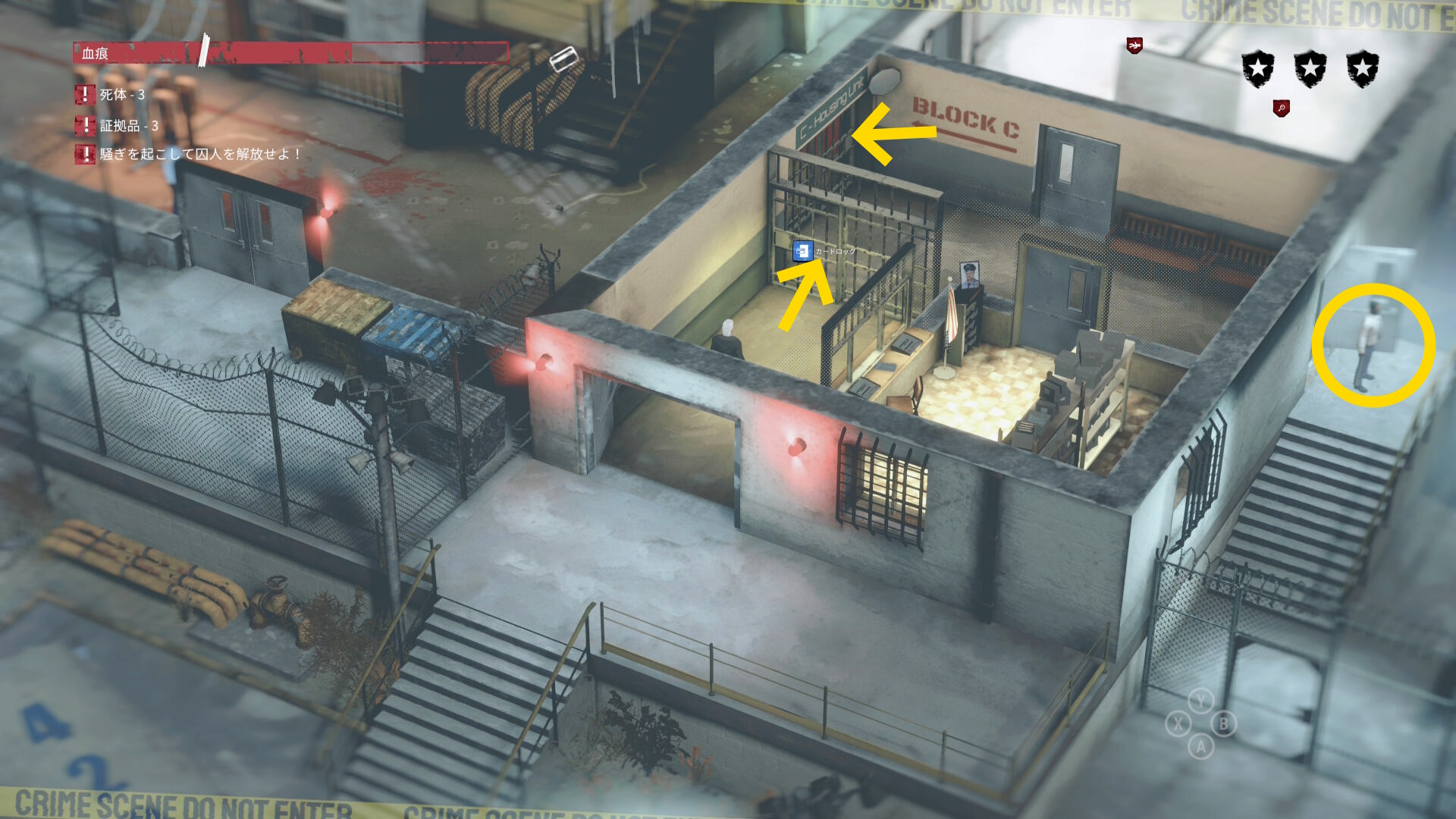 - 証拠品を回収後、”シゴト完了” になるが、しゃがみで牢屋に入って血痕を片付ける(警察官に注意)