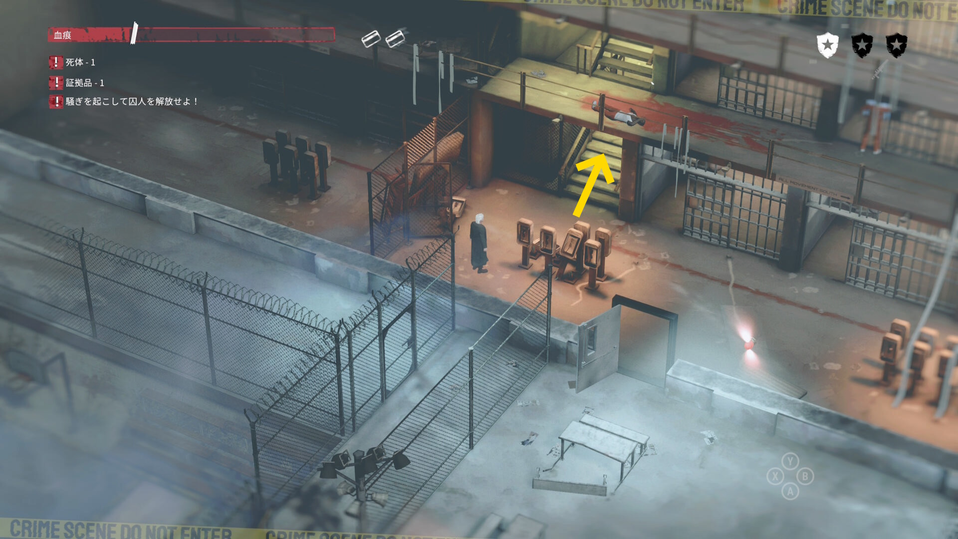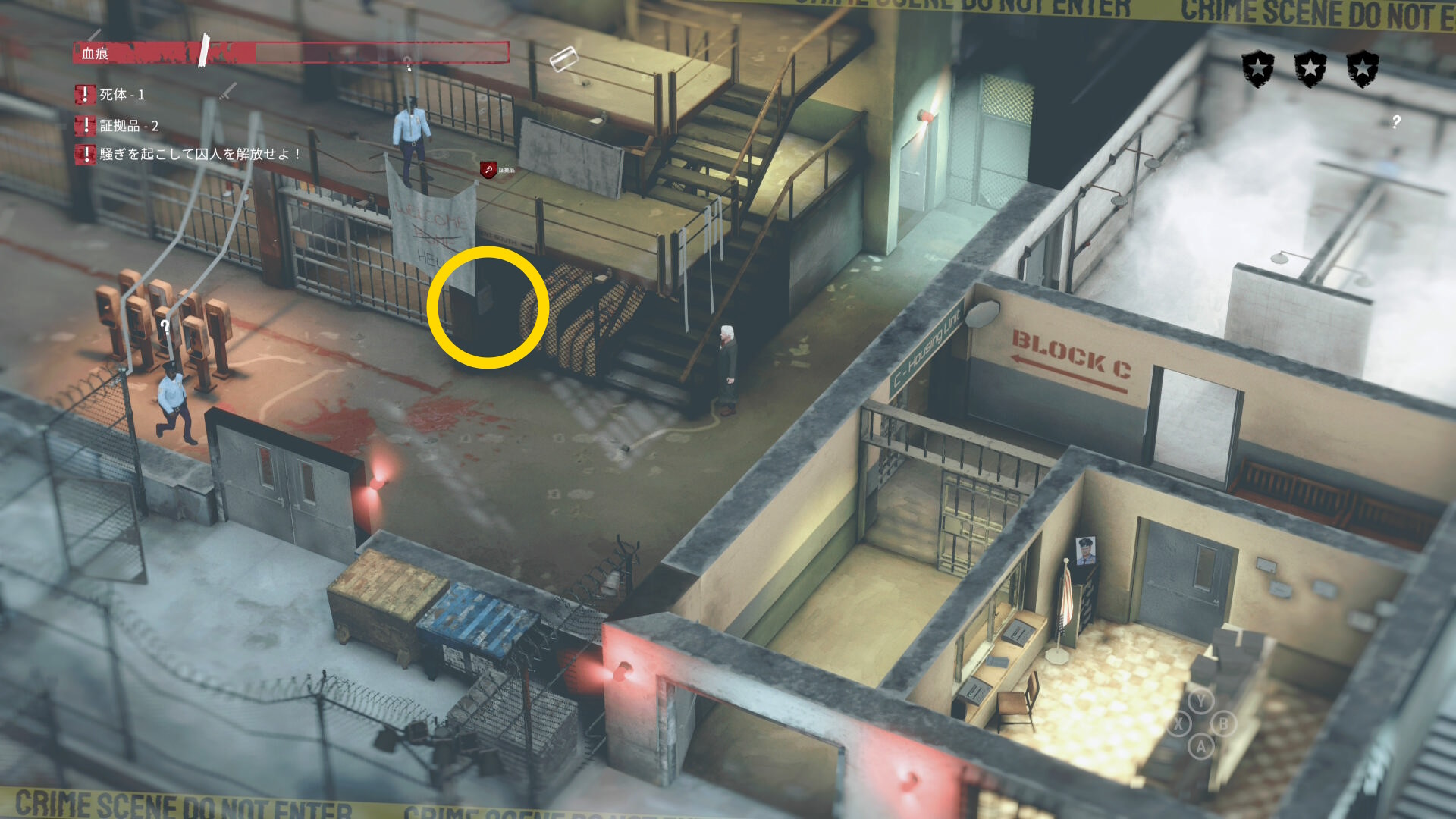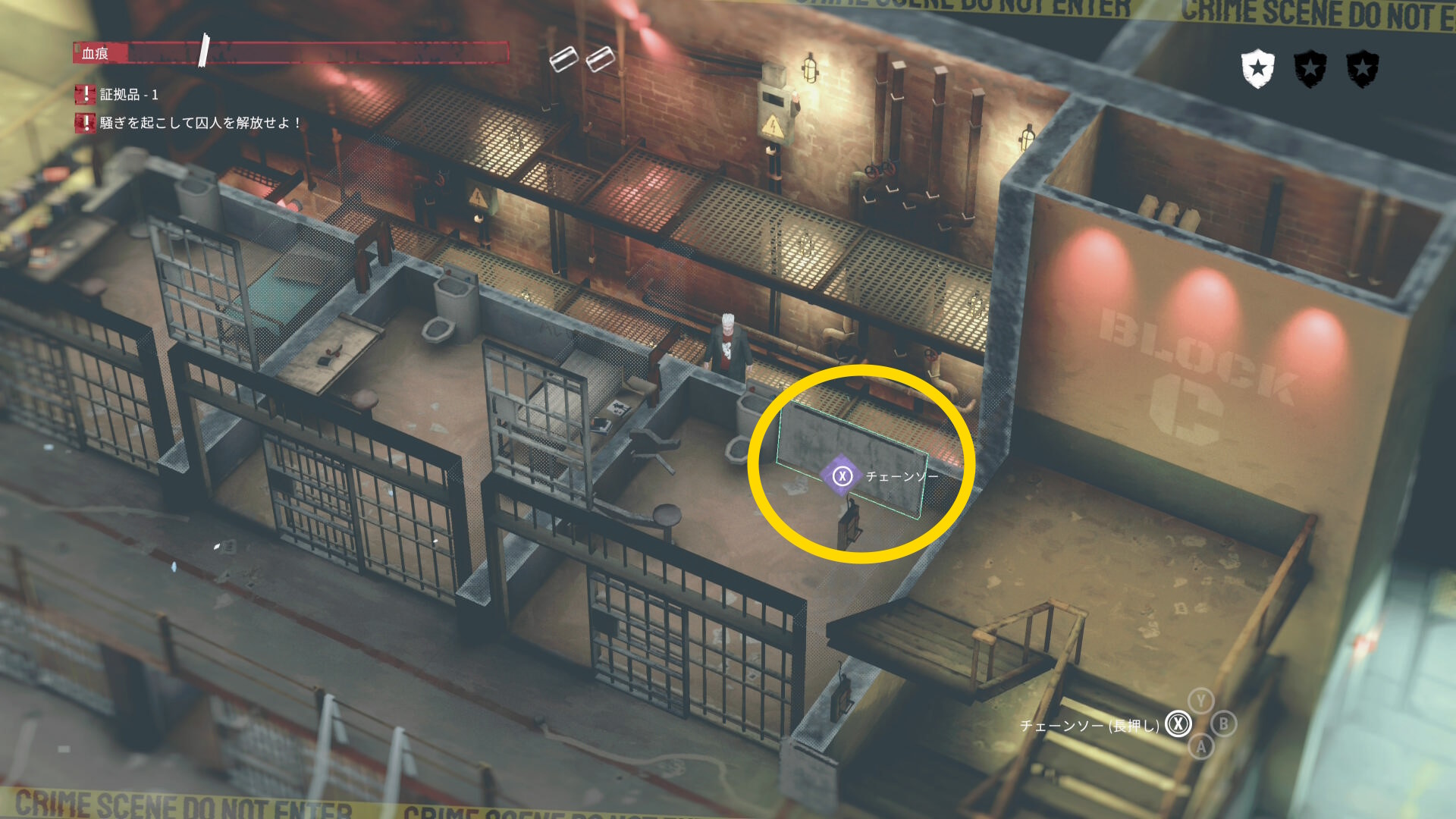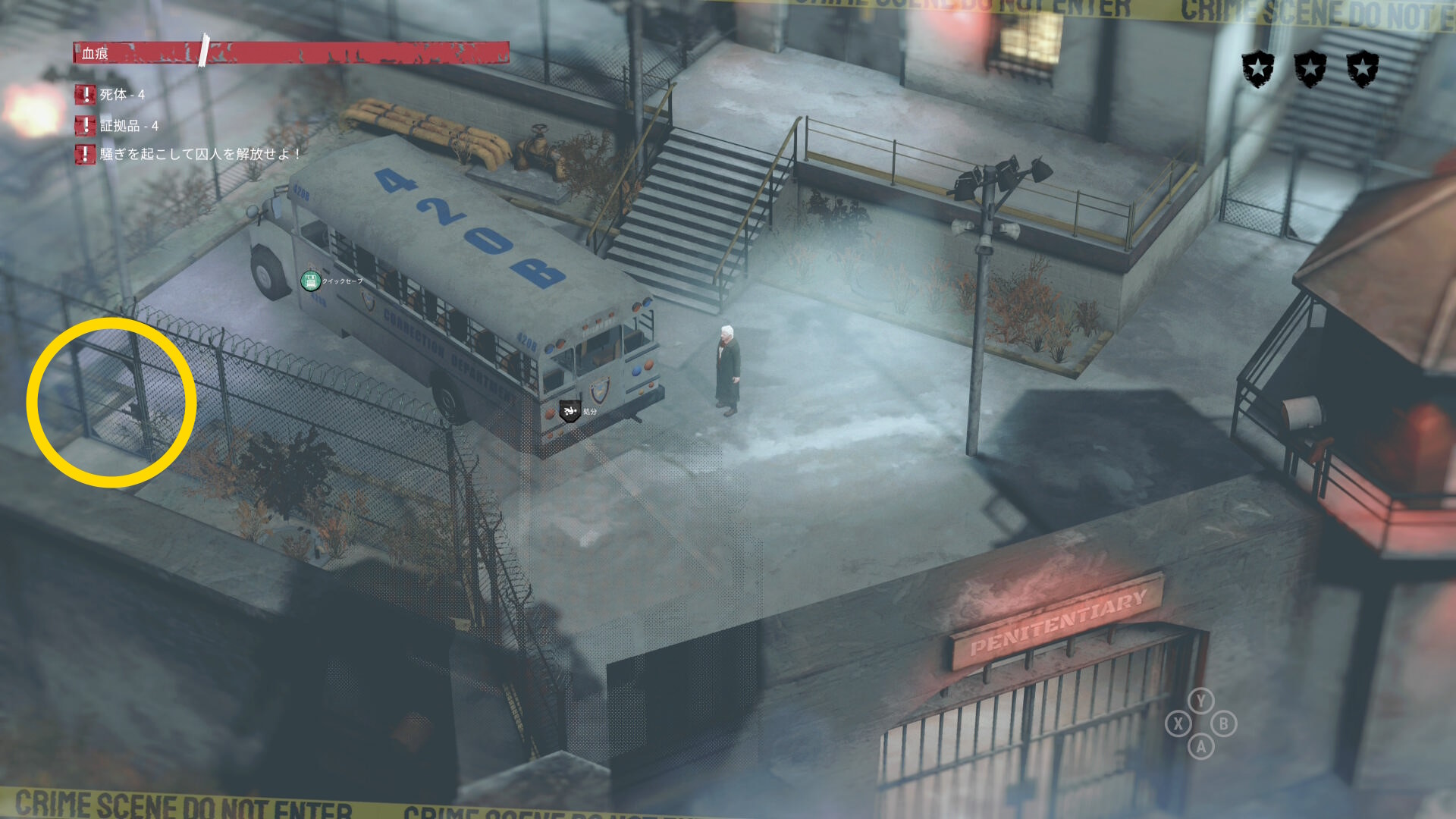 - 証拠品を回収後、”シゴト完了” になるが、しゃがみで牢屋に入って血痕を片付ける(警察官に注意)