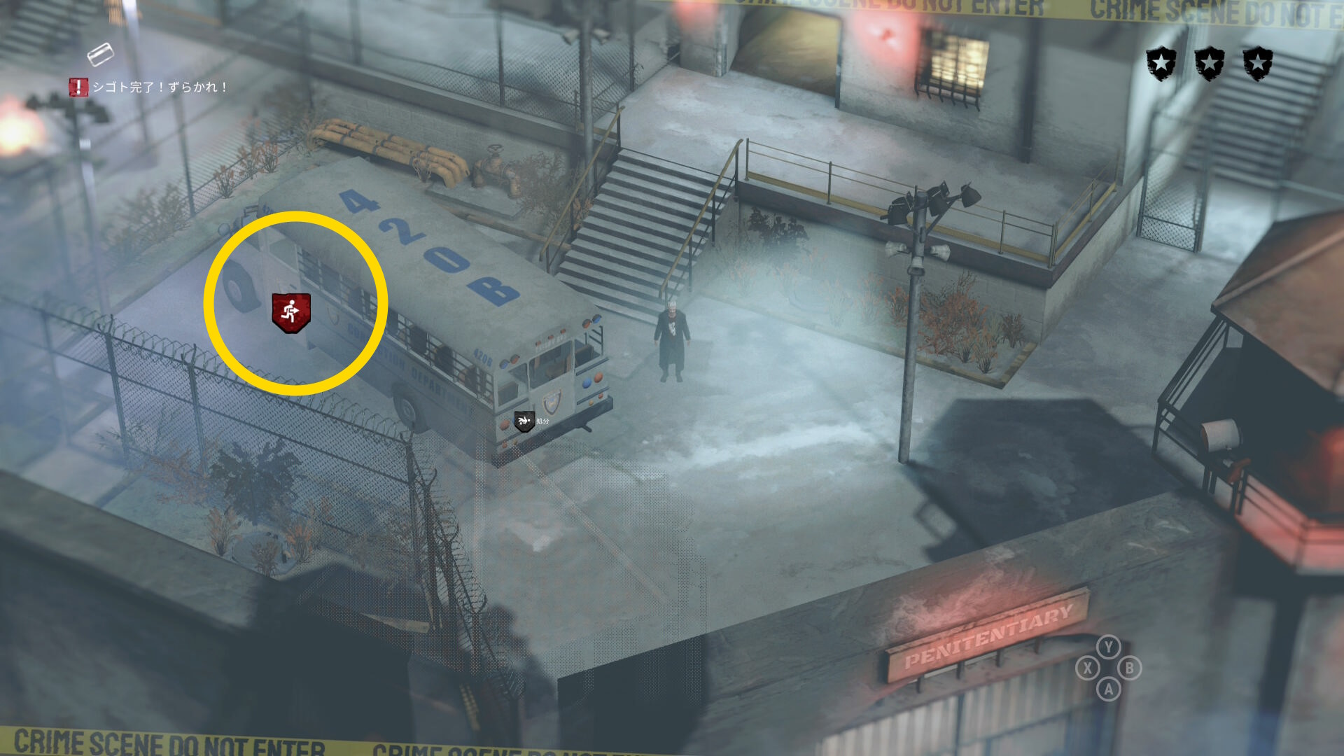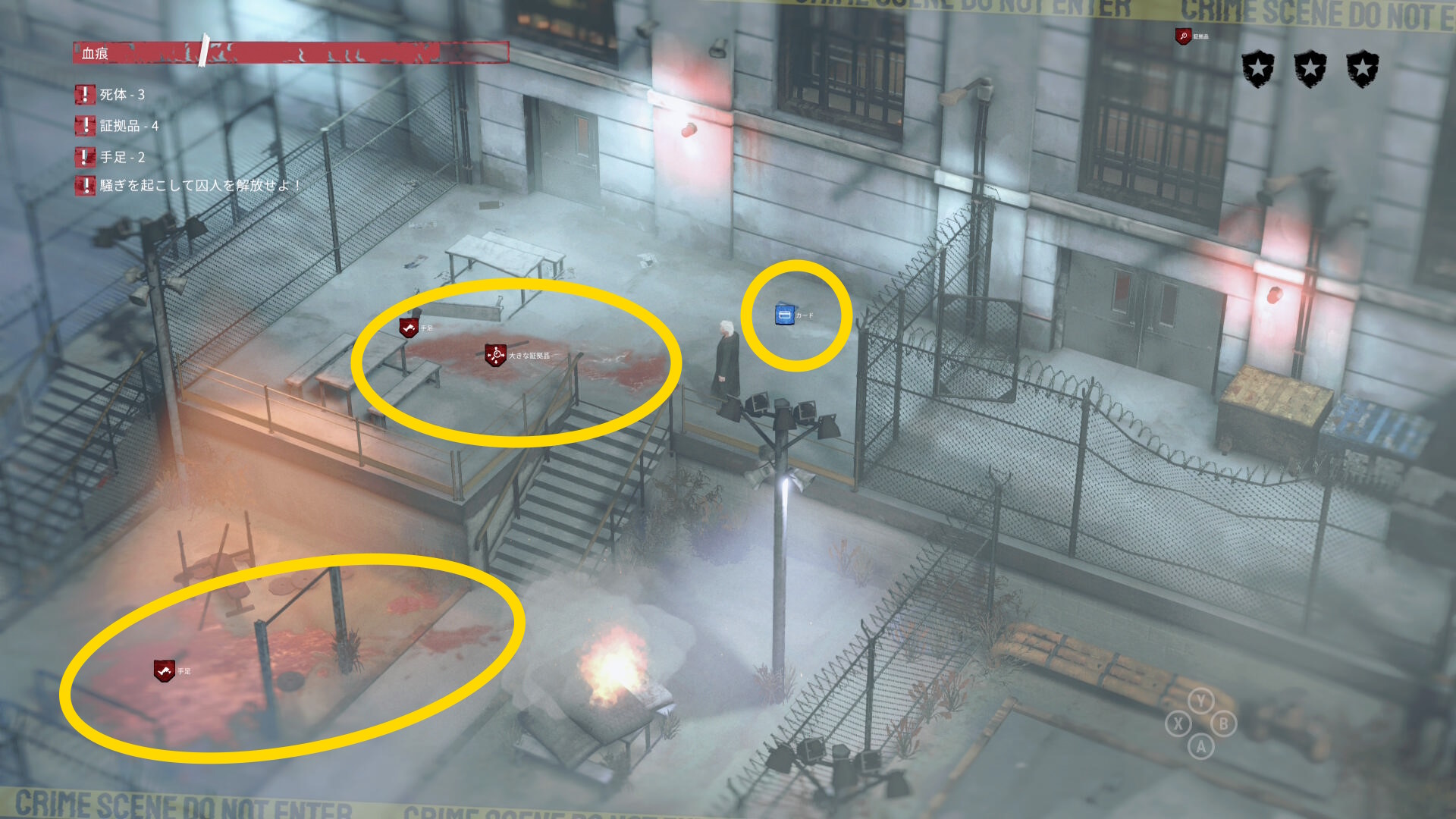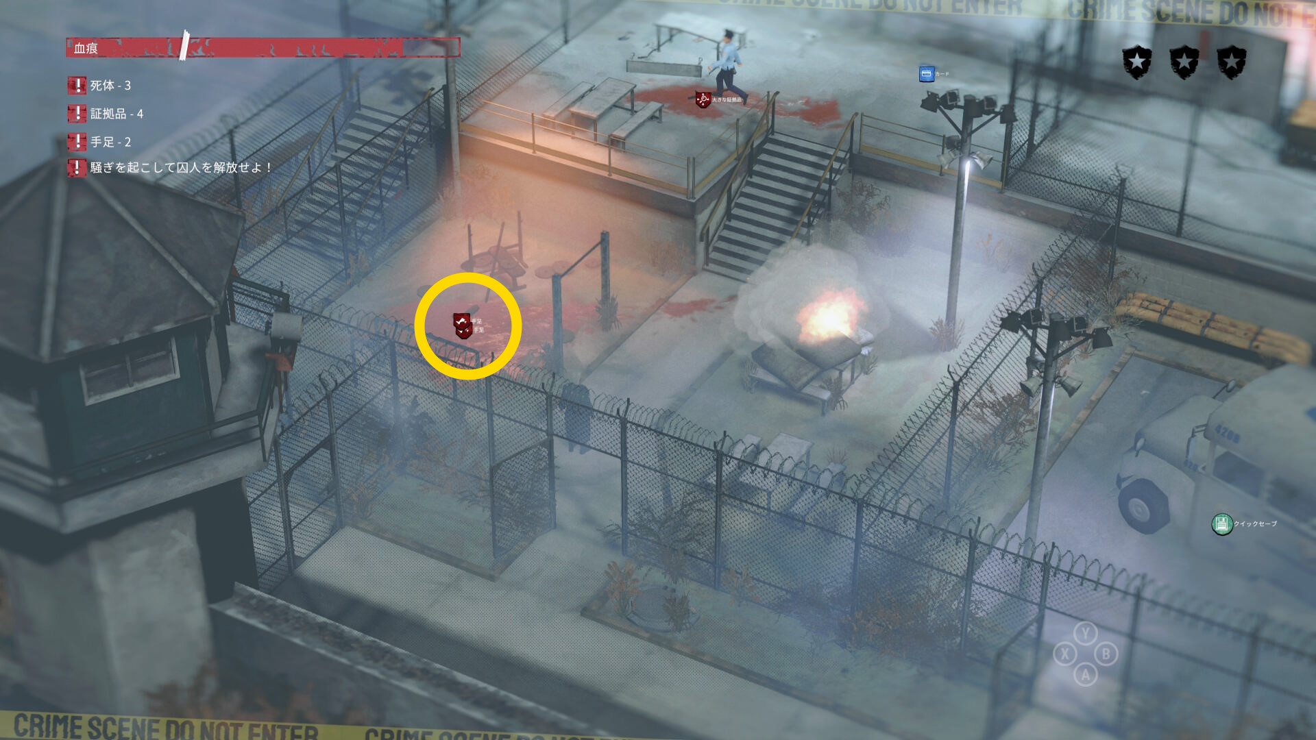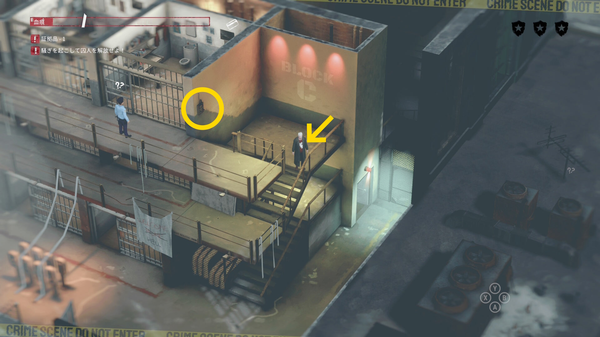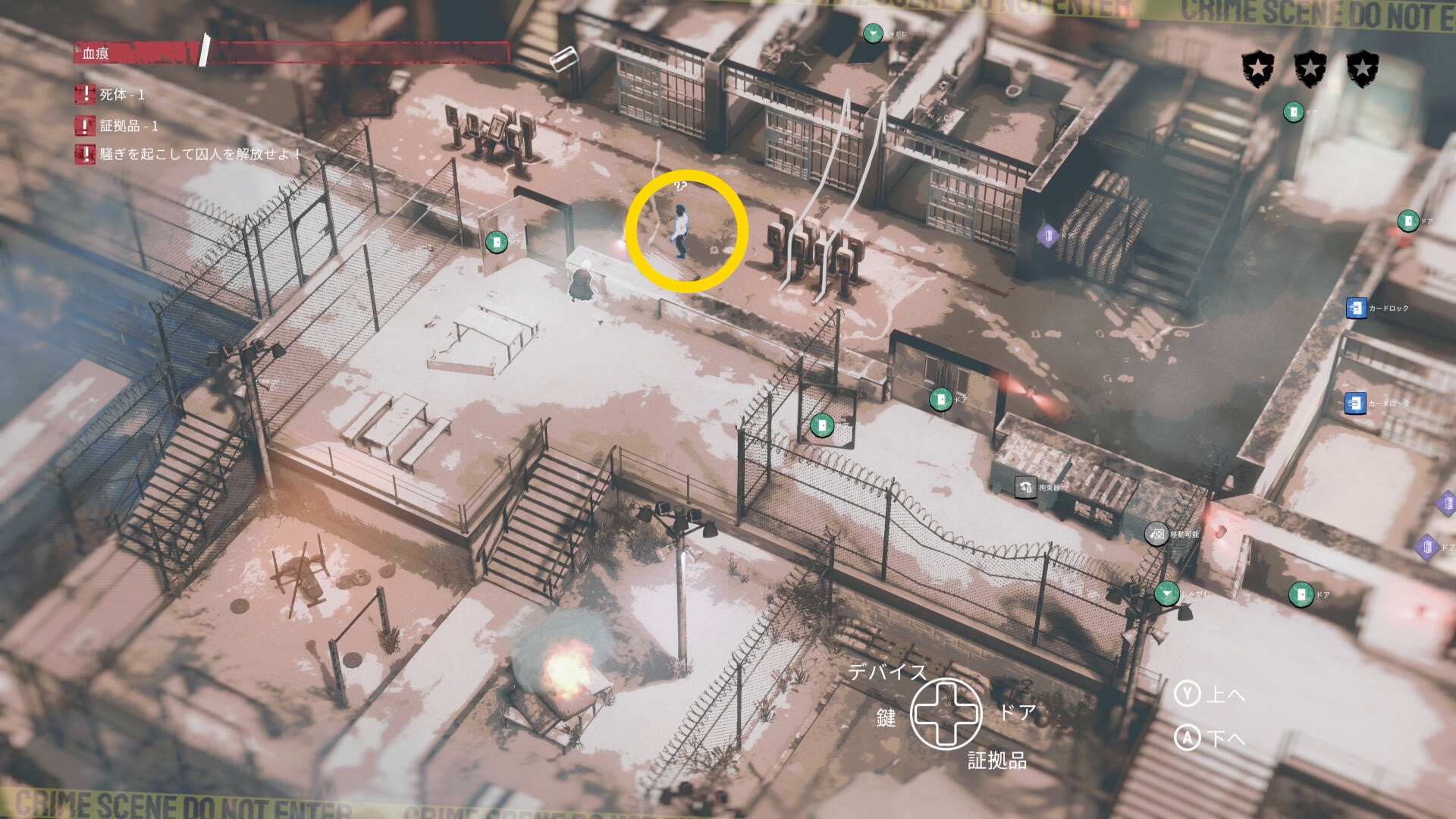 - 証拠品を回収後、”シゴト完了” になるが、しゃがみで牢屋に入って血痕を片付ける(警察官に注意)