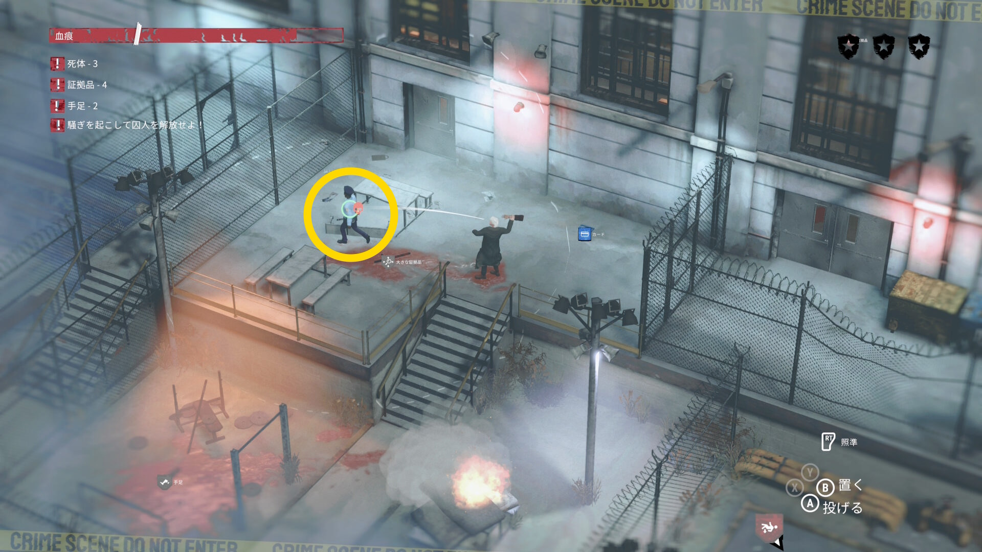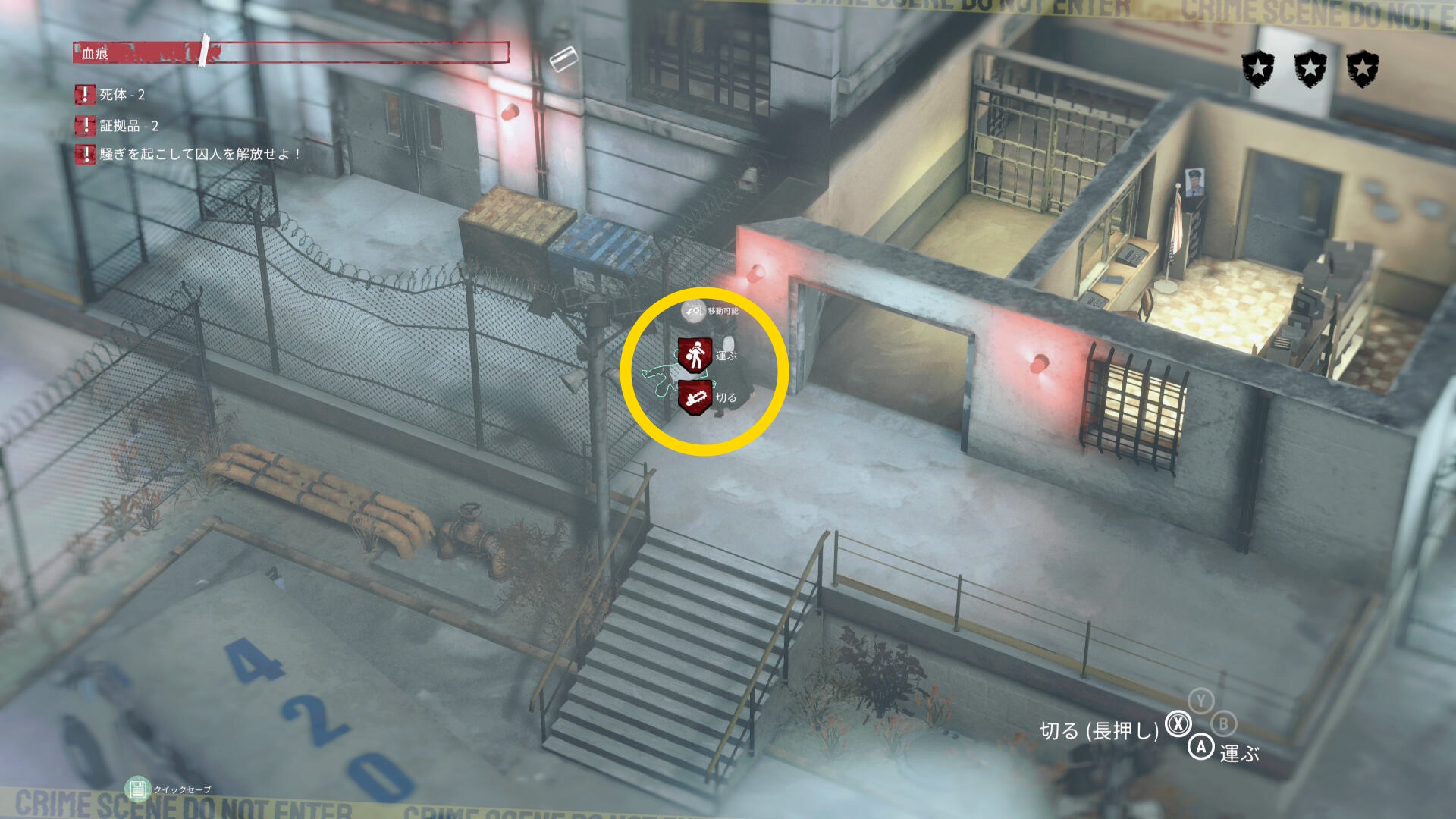 - 死体を離した位置によっては運べないこともあり、そのときはフェンスの穴ギリギリのところまで行ってからしゃがむと良いでしょう