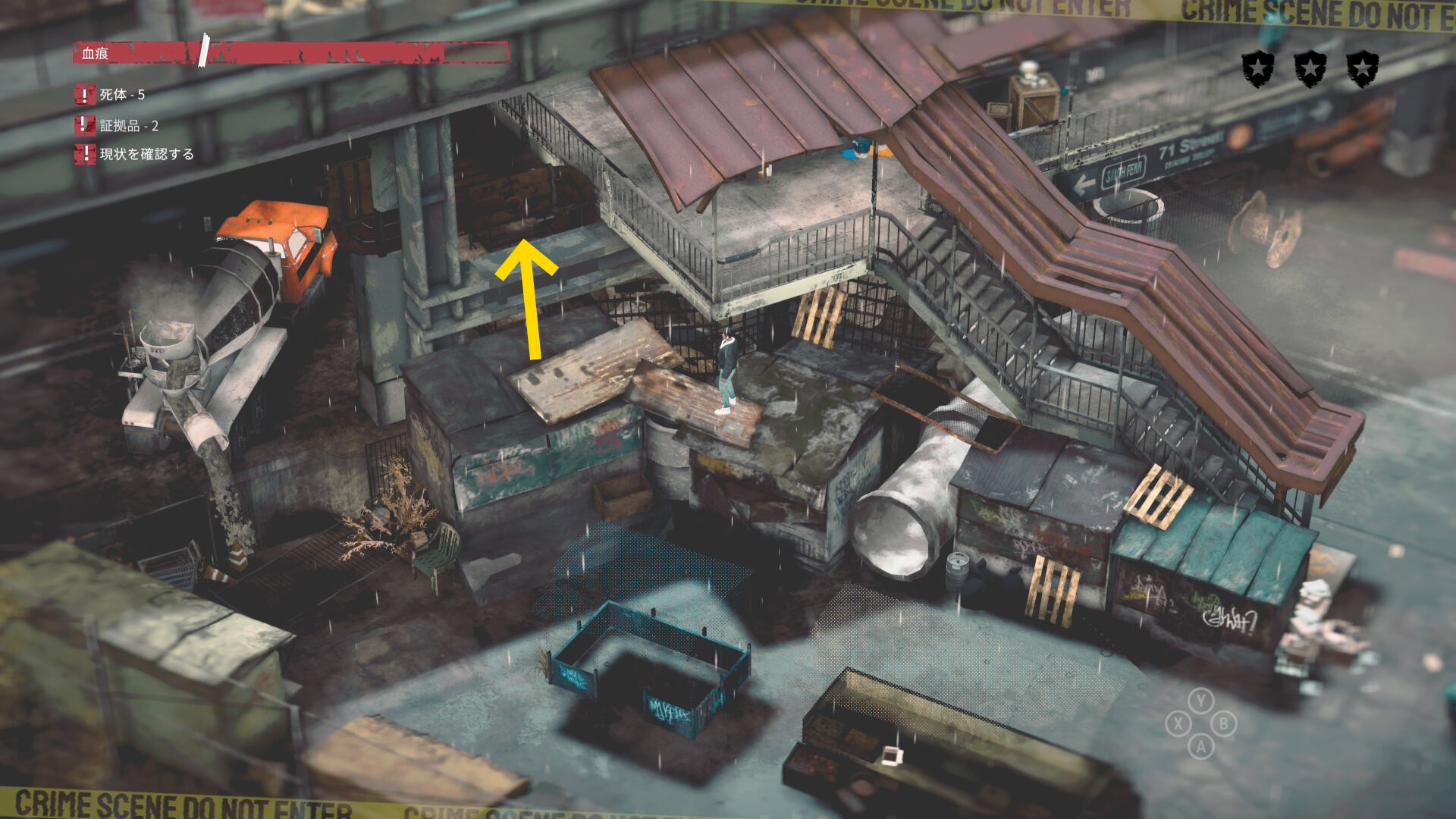 - 血痕の片付けが終わったら、階段脇のバラックの屋根をよじ登る