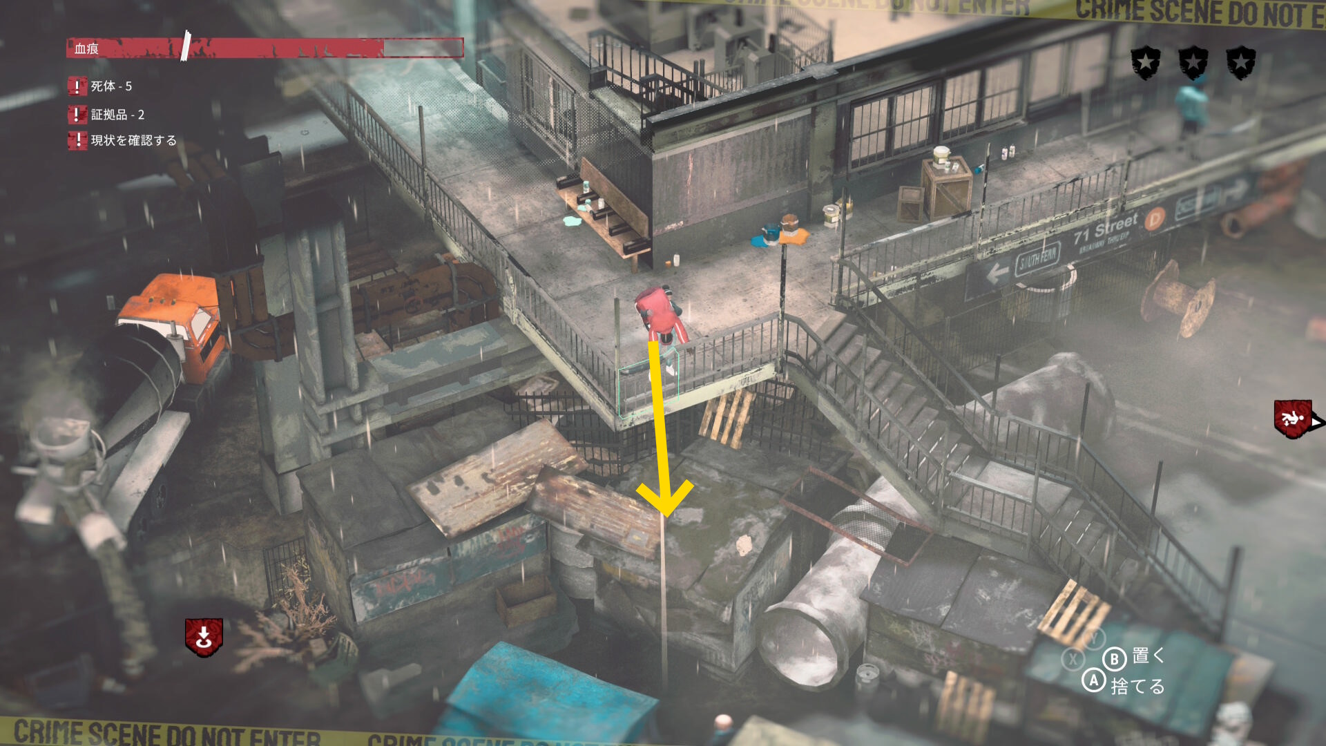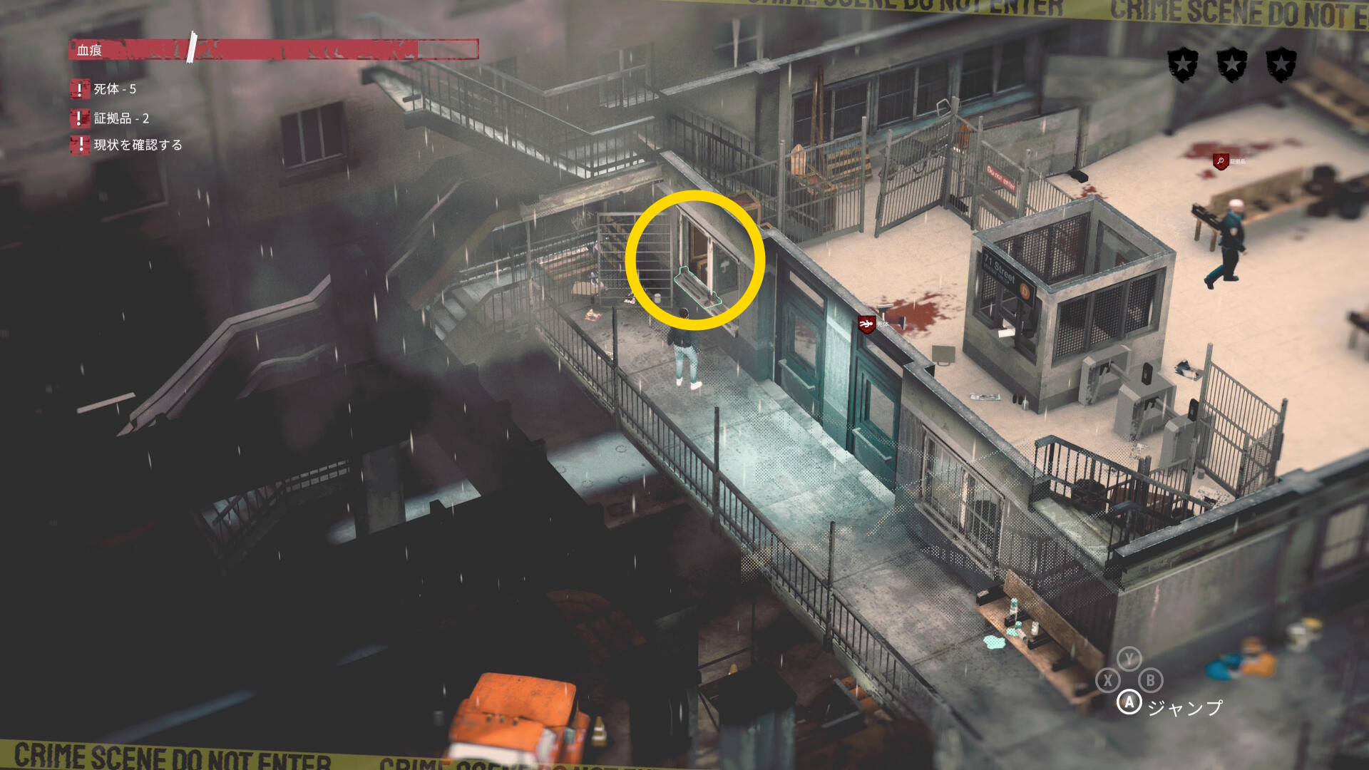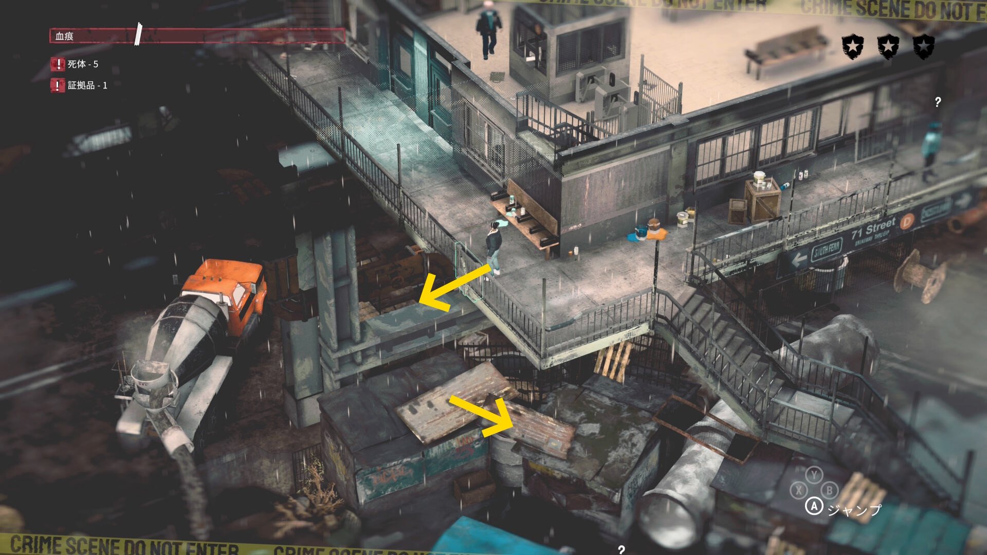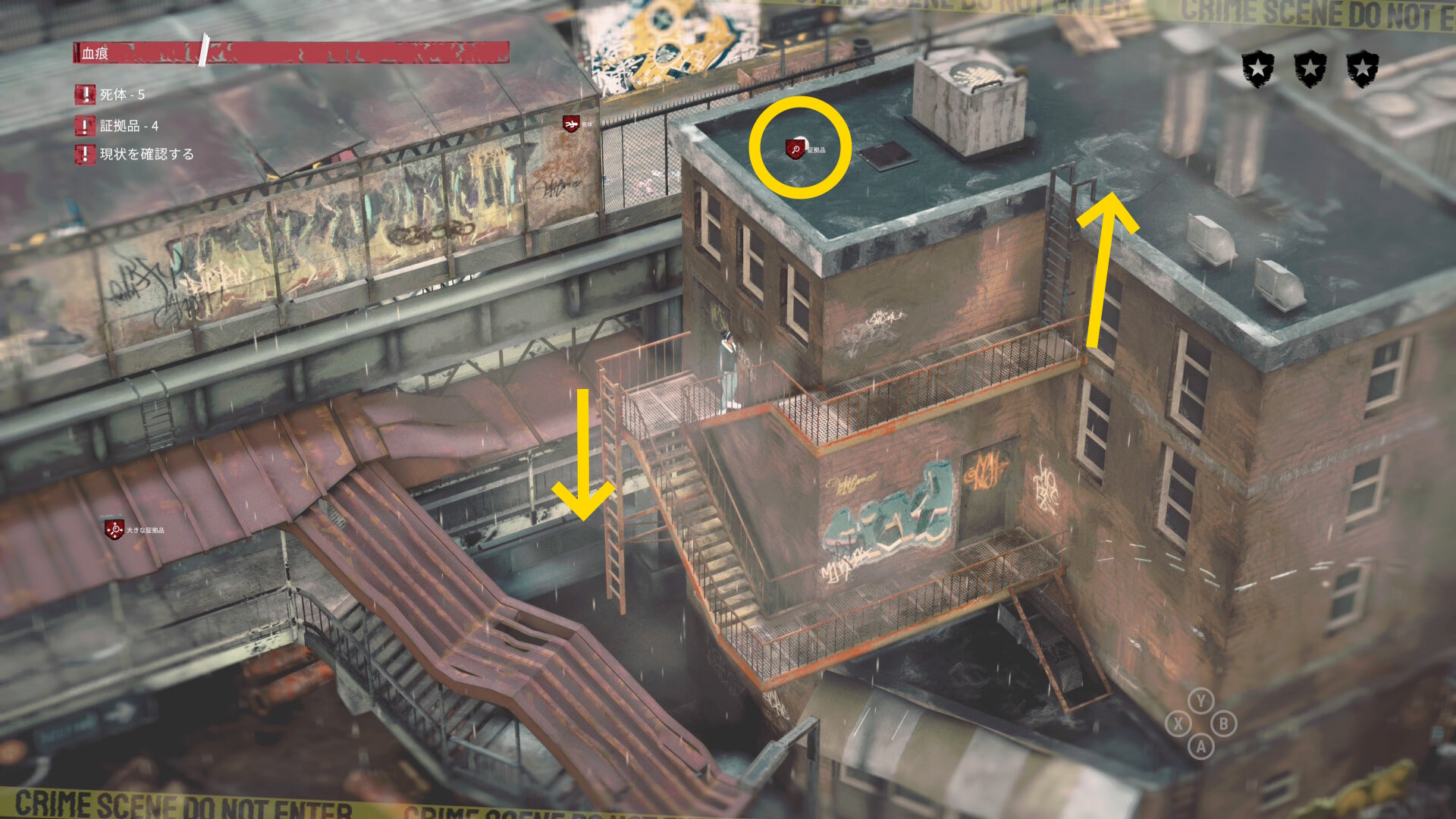 - 左のはしごを下ろすことで地上におりられるようになり、右のはしごを登ると屋上で 証拠品 を回収できる