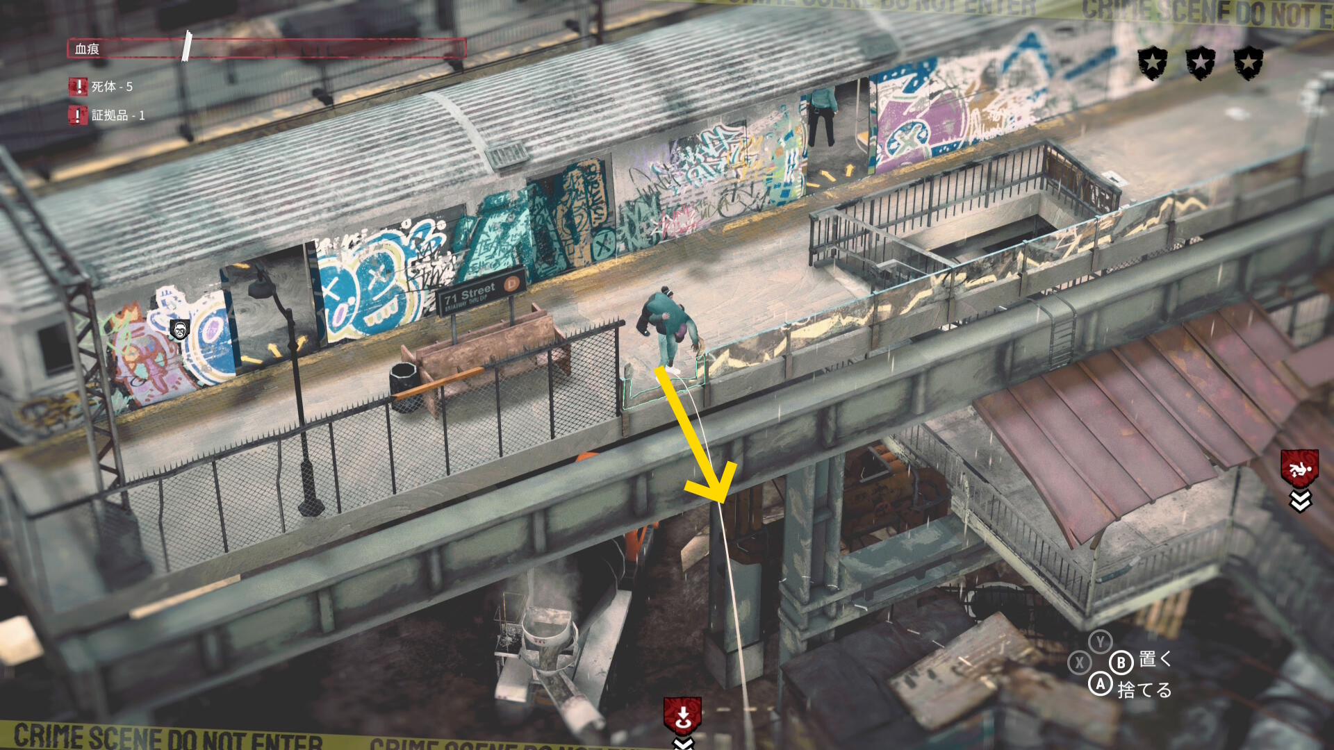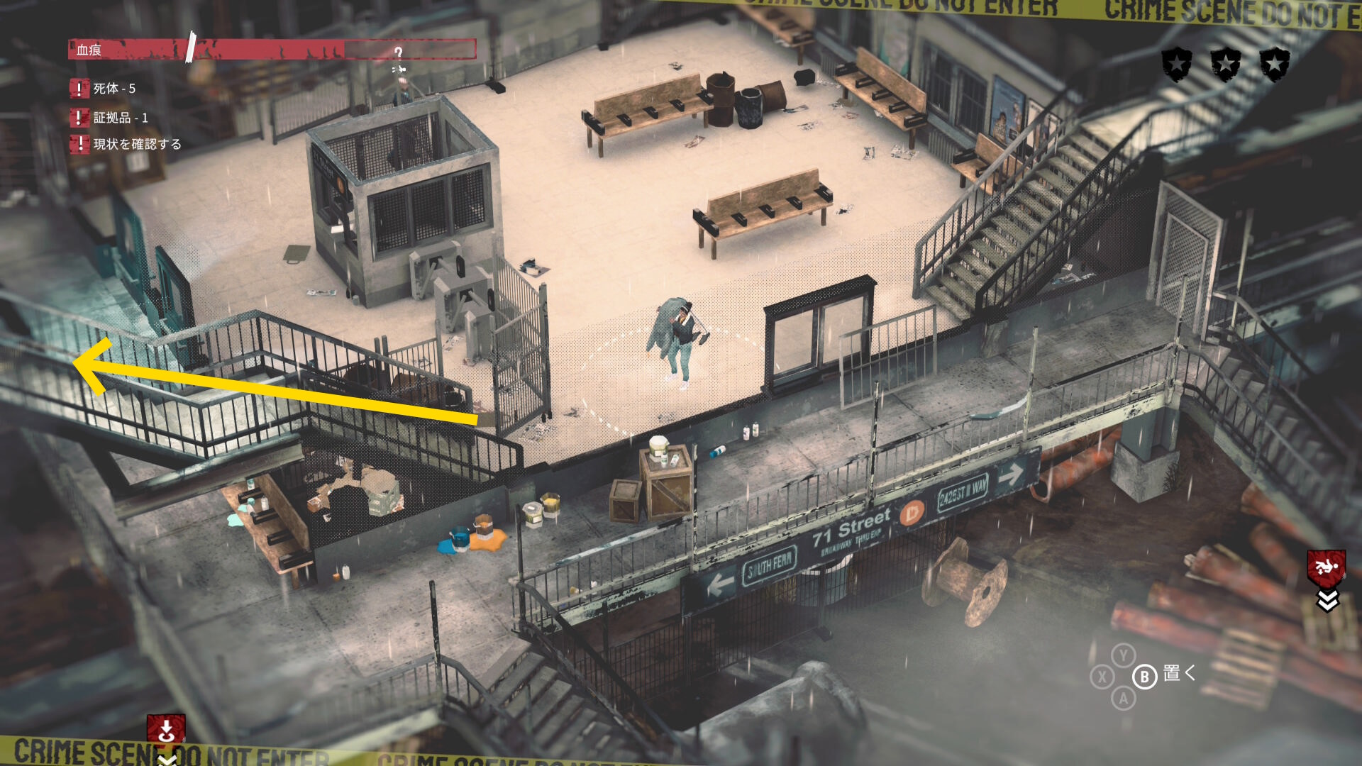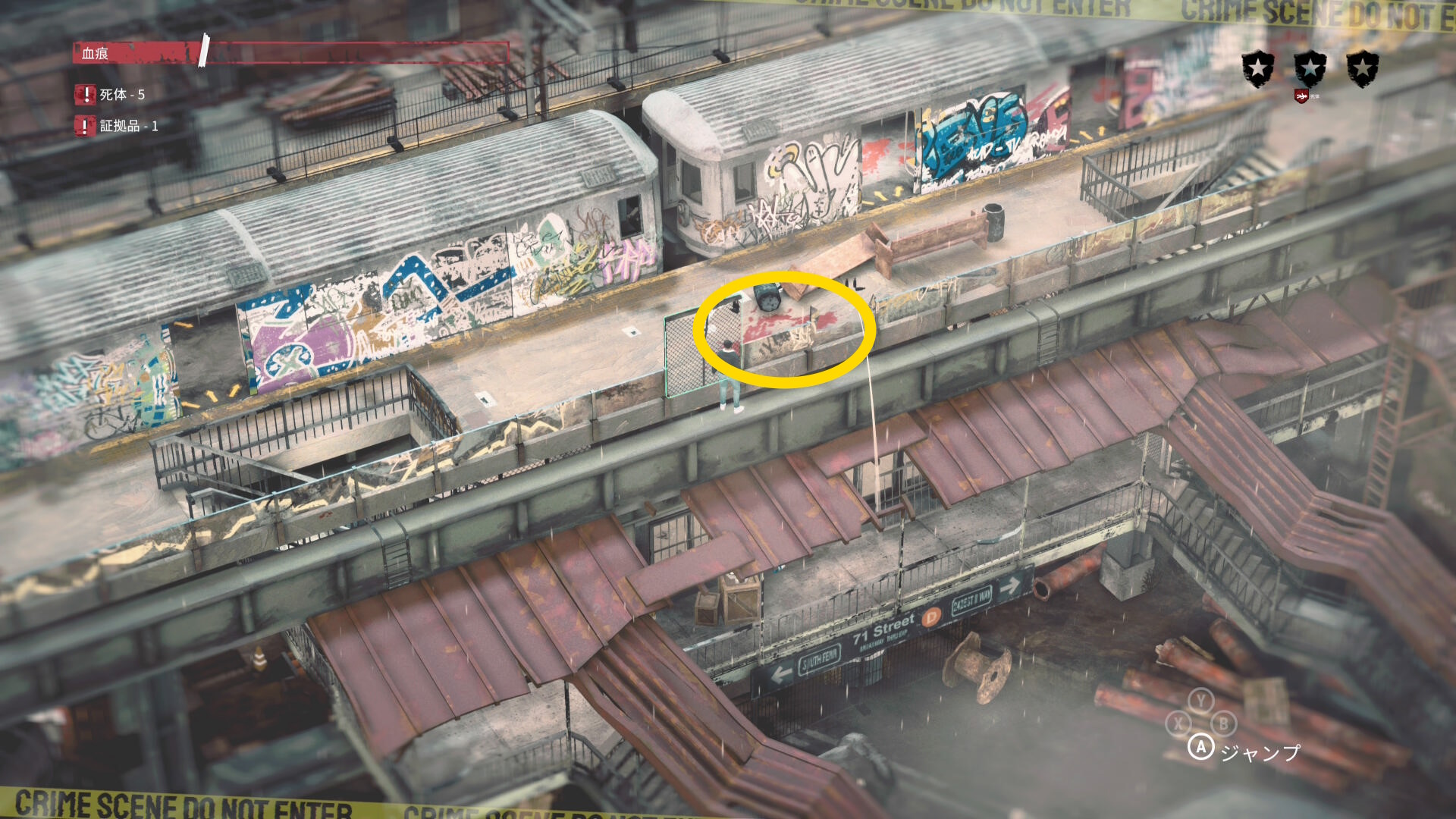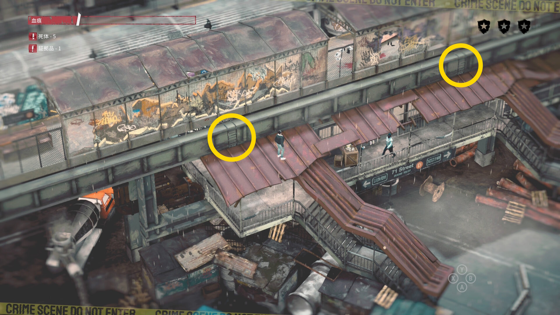 - 左のはしごを下ろすことで地上におりられるようになり、右のはしごを登ると屋上で 証拠品 を回収できる