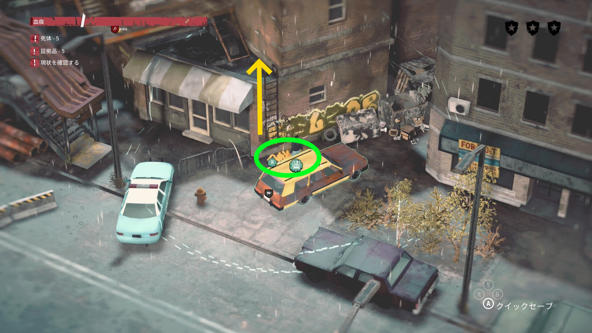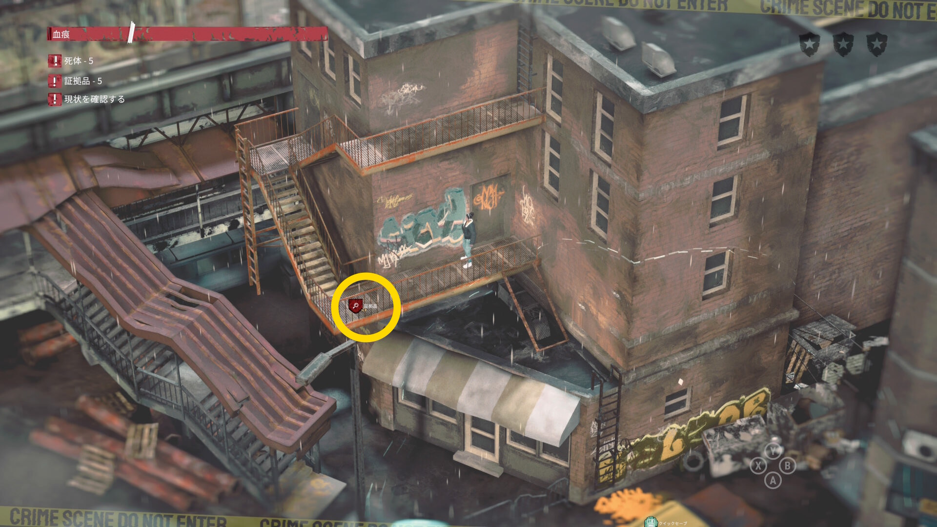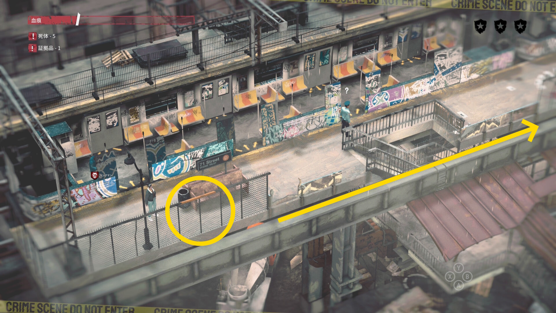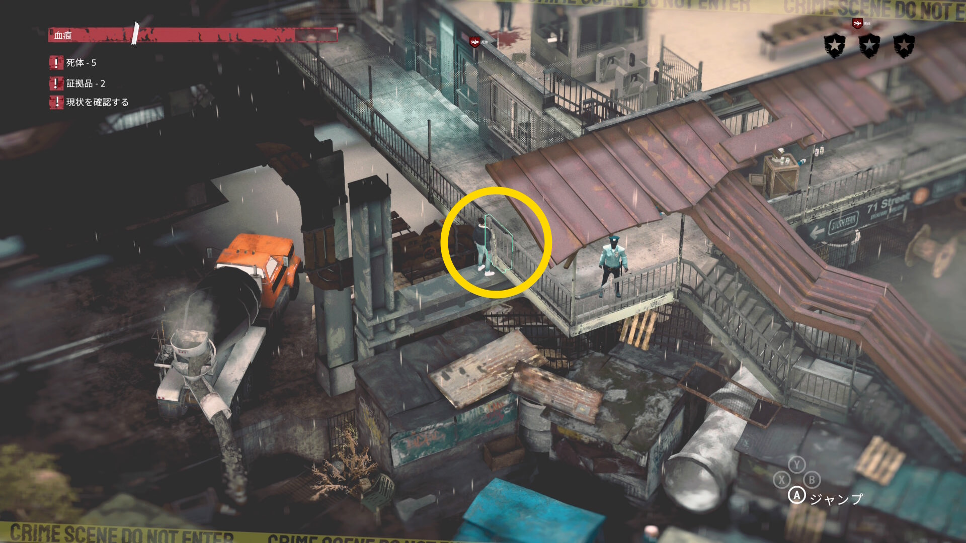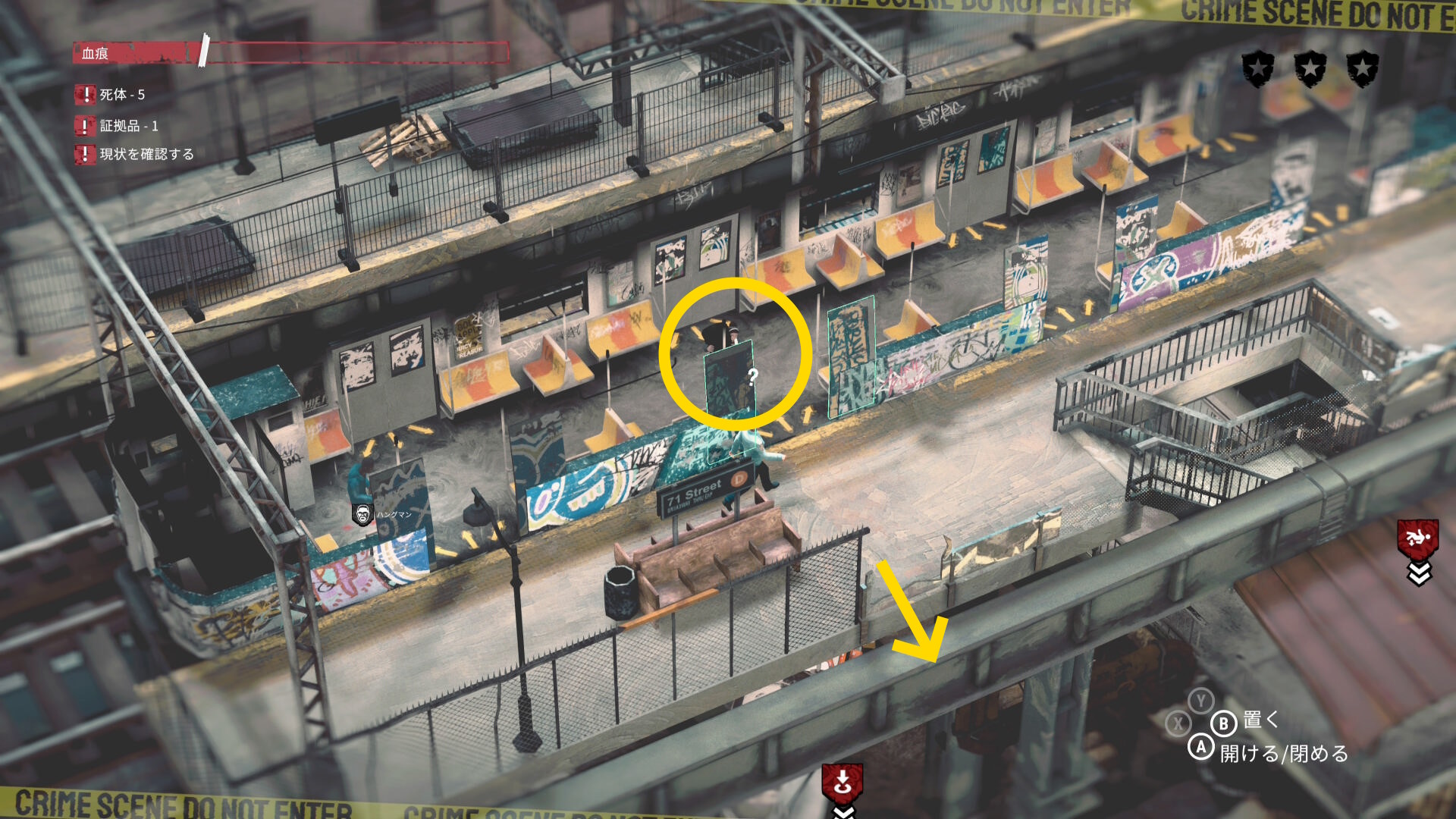 - 左のはしごを下ろすことで地上におりられるようになり、右のはしごを登ると屋上で 証拠品 を回収できる
