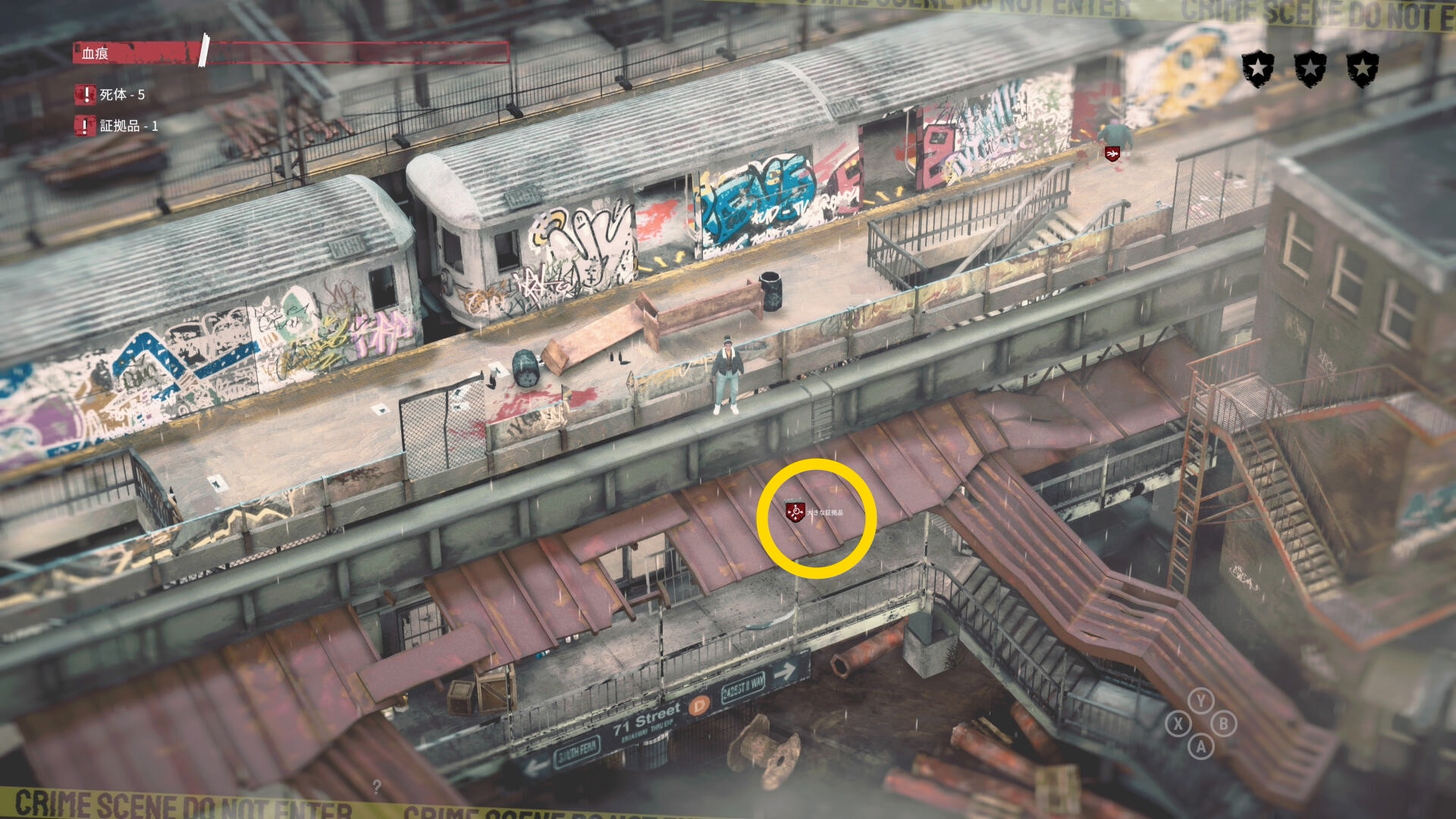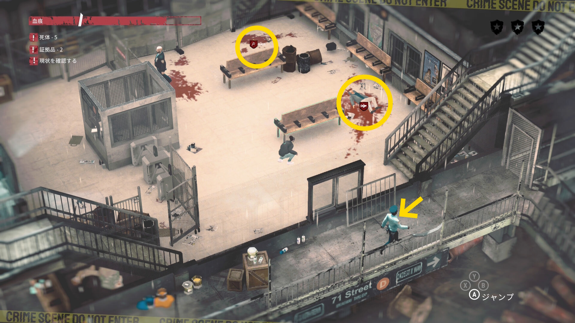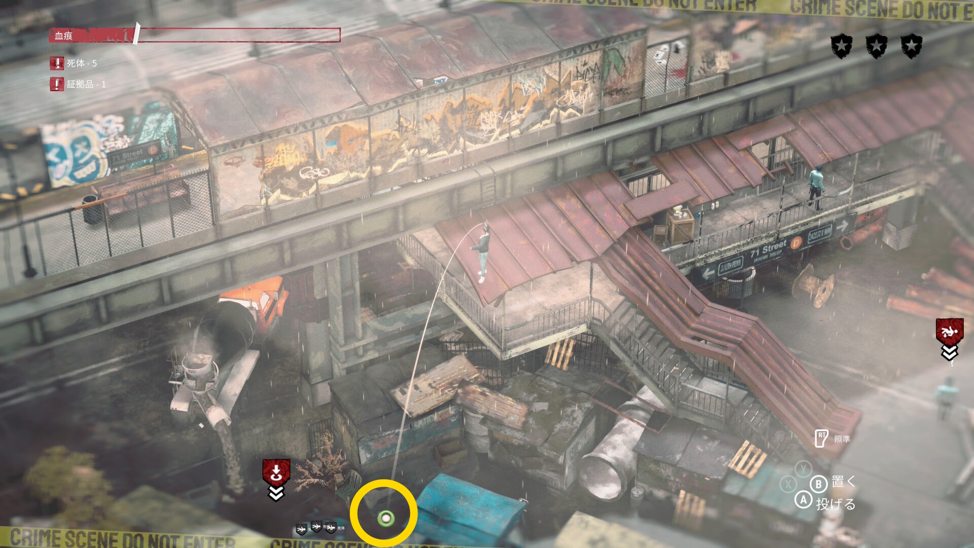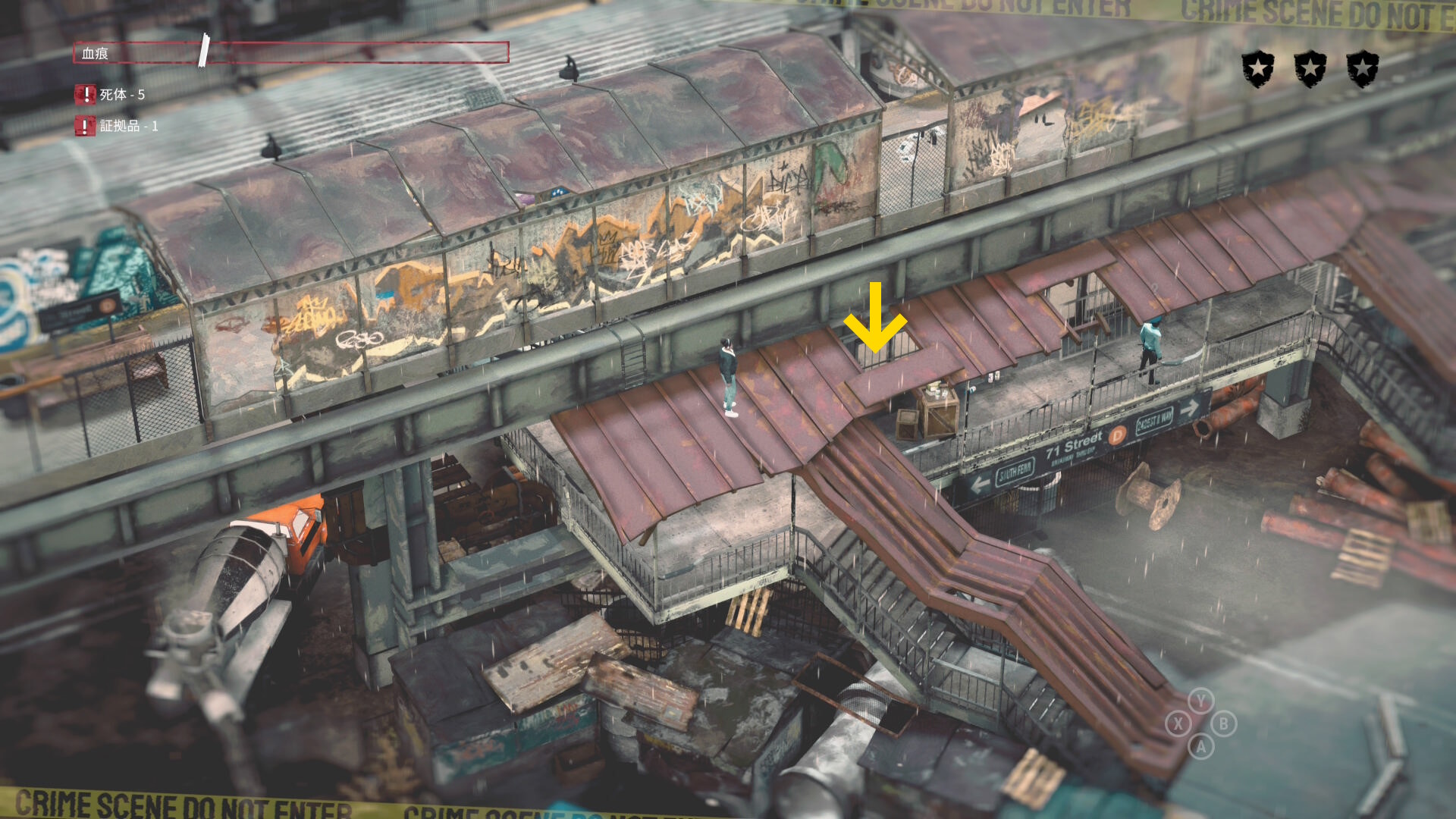 - 左のはしごを下ろすことで地上におりられるようになり、右のはしごを登ると屋上で 証拠品 を回収できる
