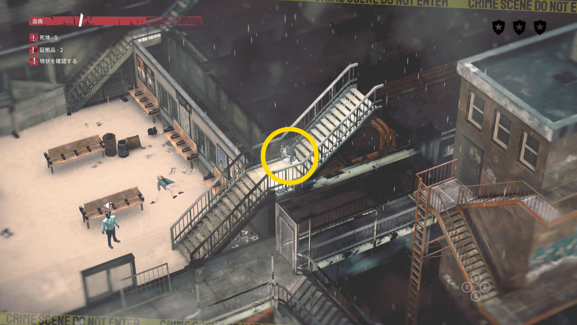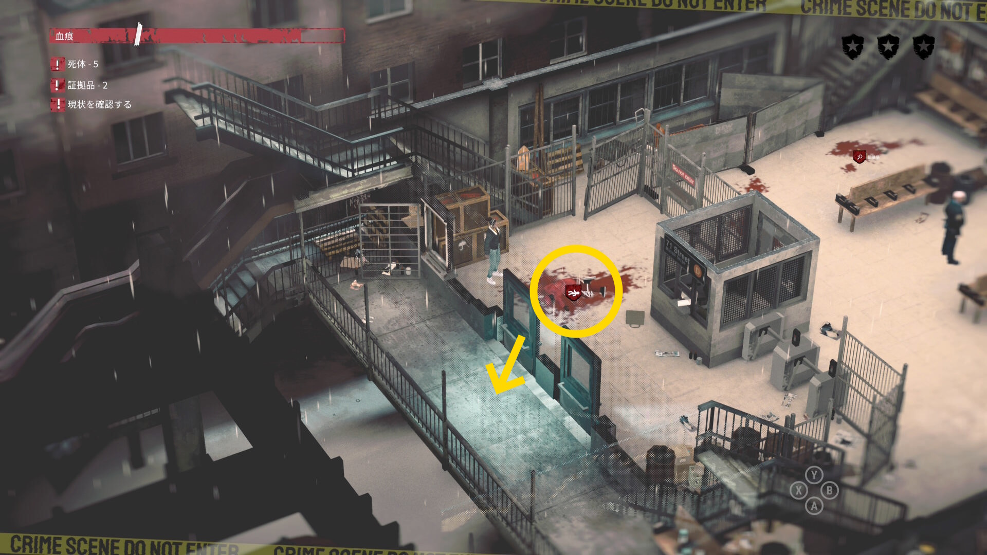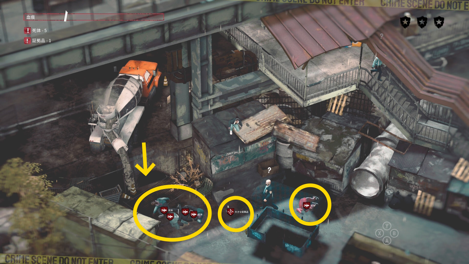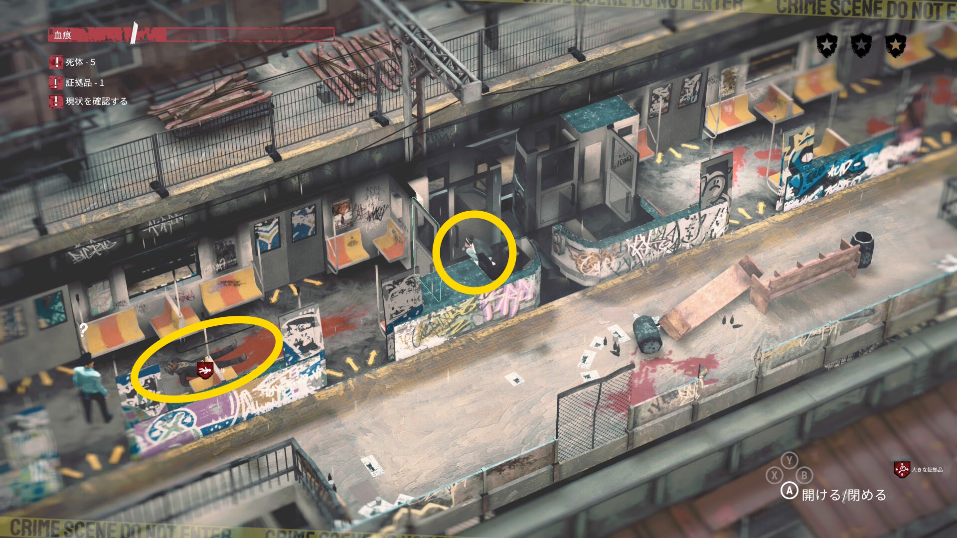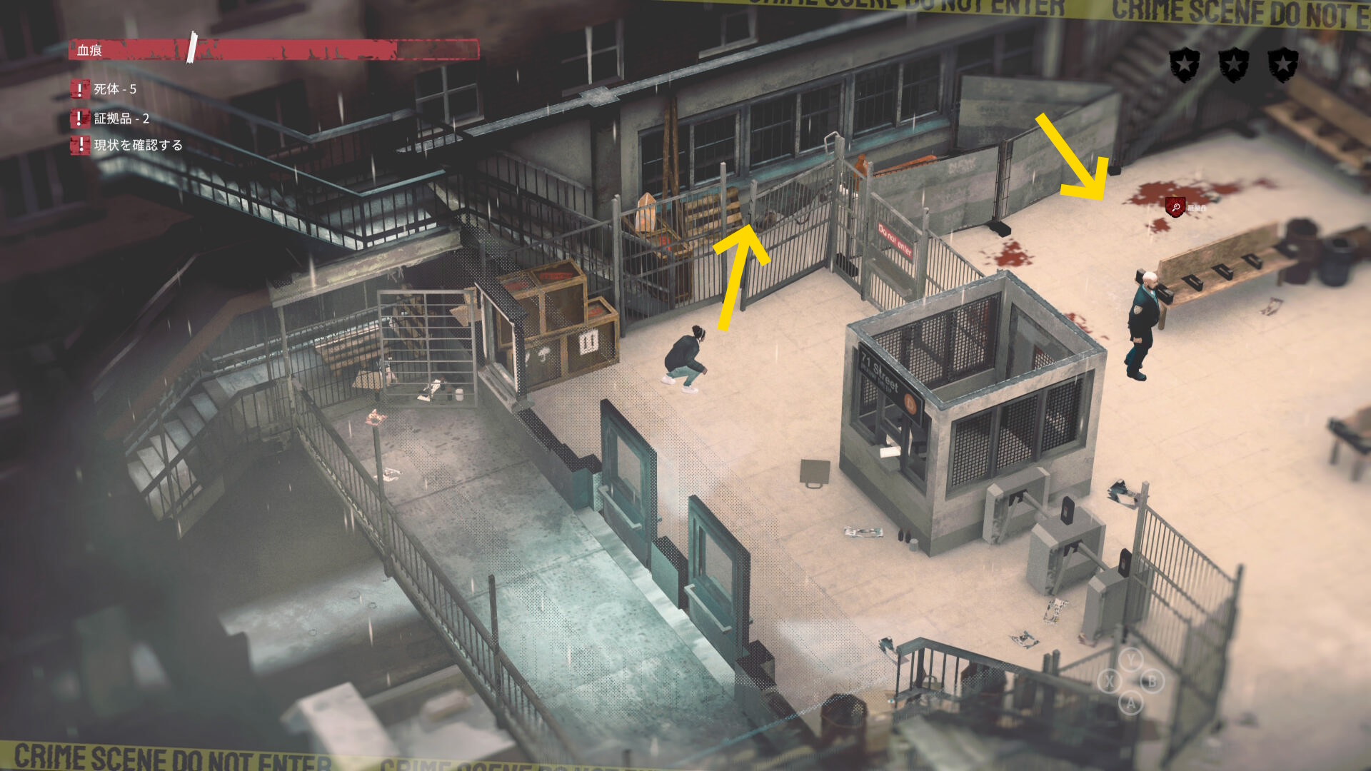 - 警察官が時計回りに巡回するので、その動きに合わせて血痕を片付けていく(バリケードにしゃがんで視認させないようにすることも必要)