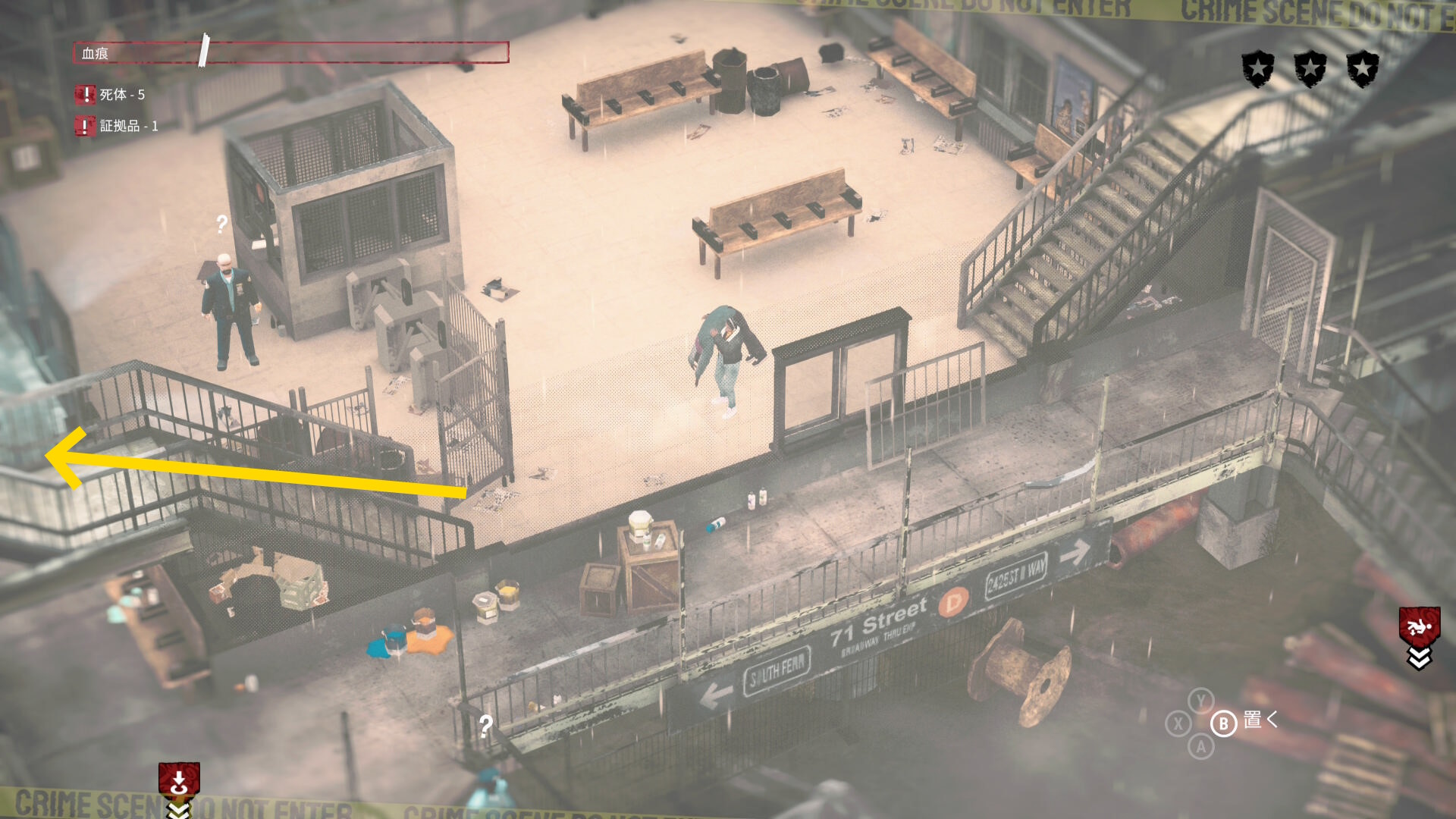- 死体周辺の血痕を片づける際、外の通路を巡回する警察官(下画像矢印)に音が聞こえてしまうので注意。※待合室まで入ってくる