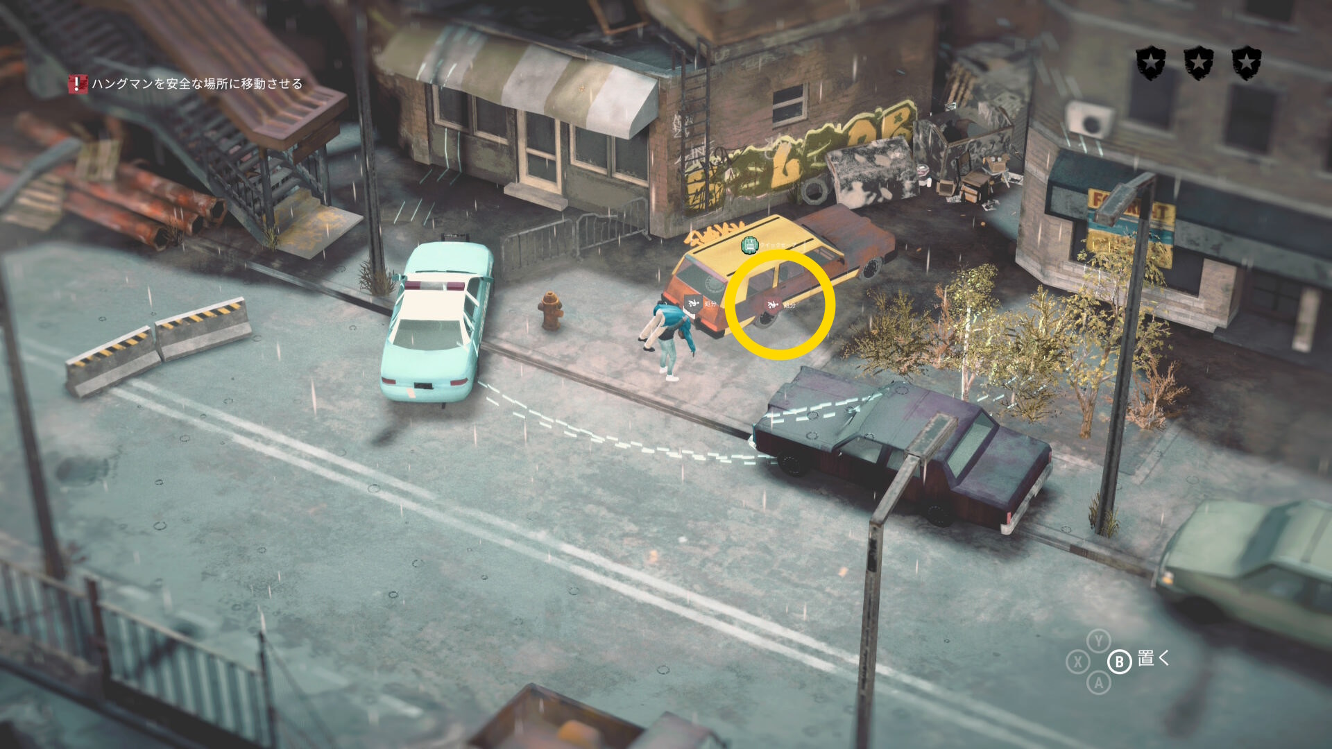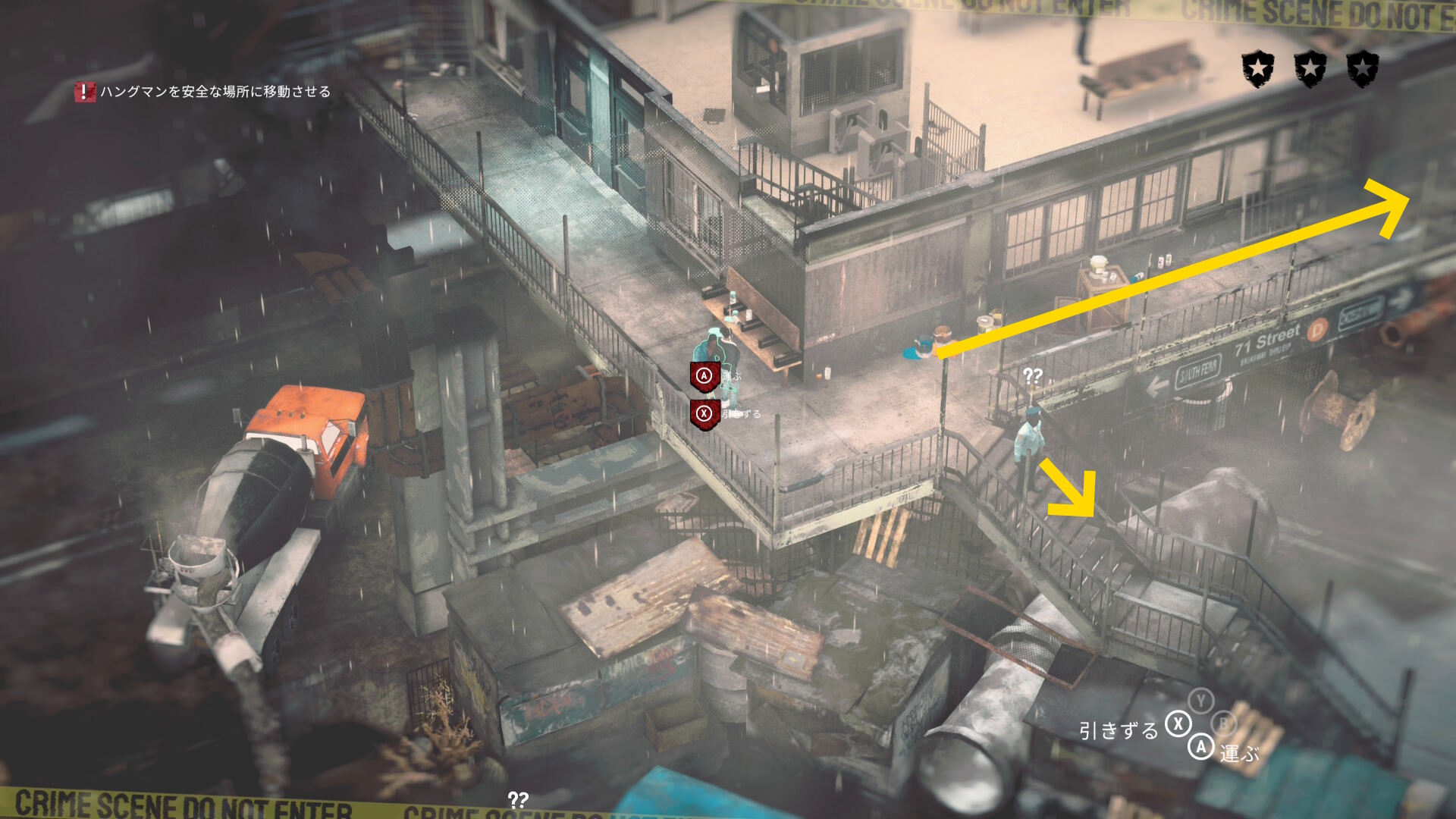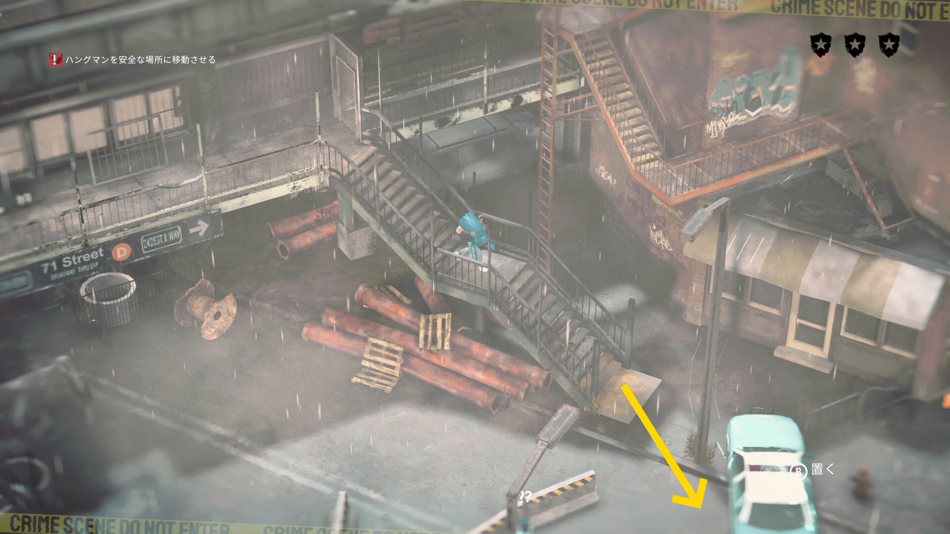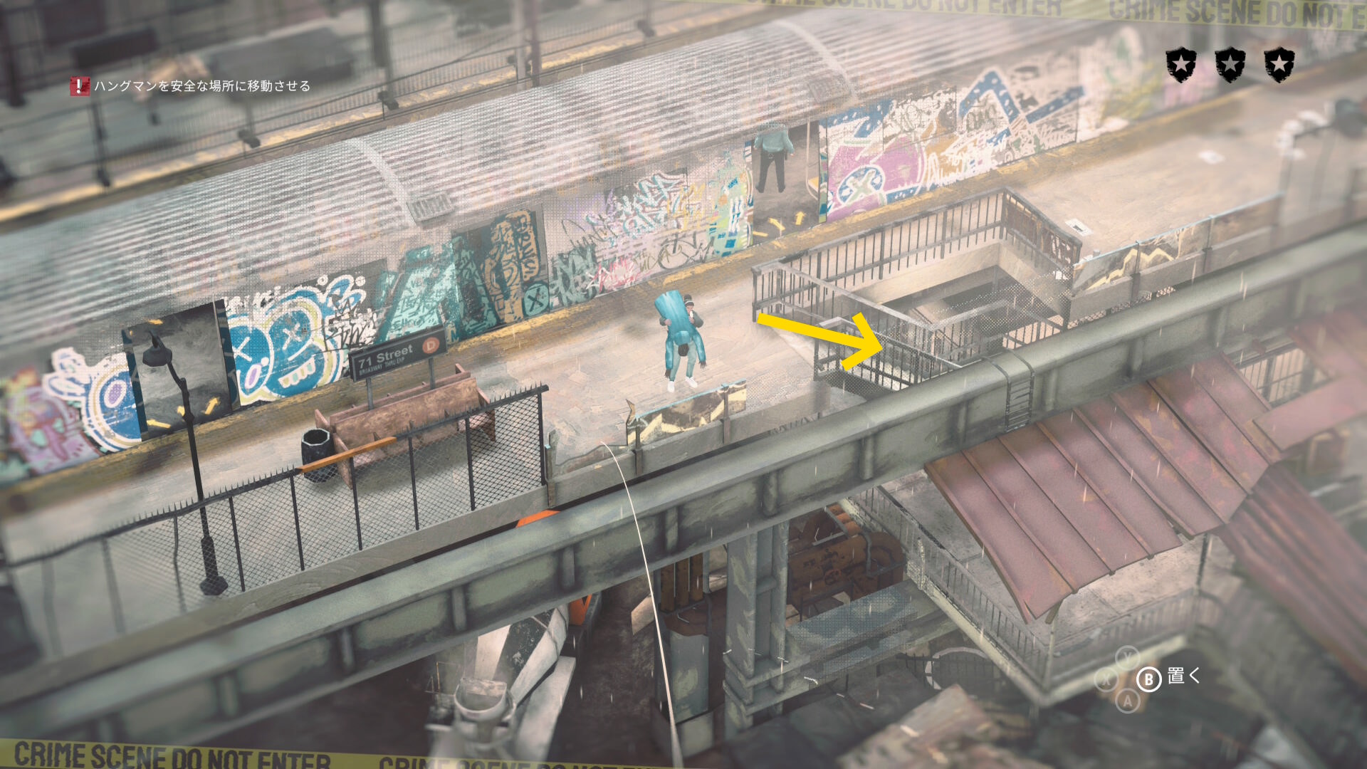 - 運ぶ途中、警察官がいるときは B で離して下ろすことができる(ハングマンを逮捕することはないが警戒する)