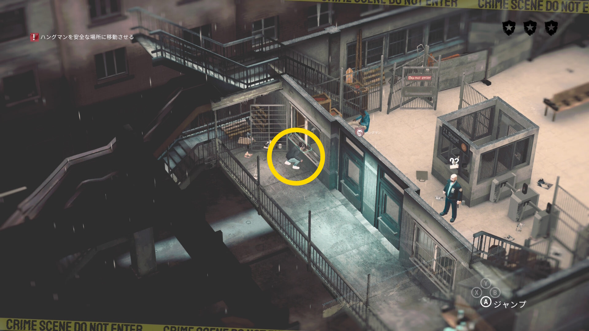 - 一旦ハングマンを下ろし、窓から外に出てしゃがみで待機