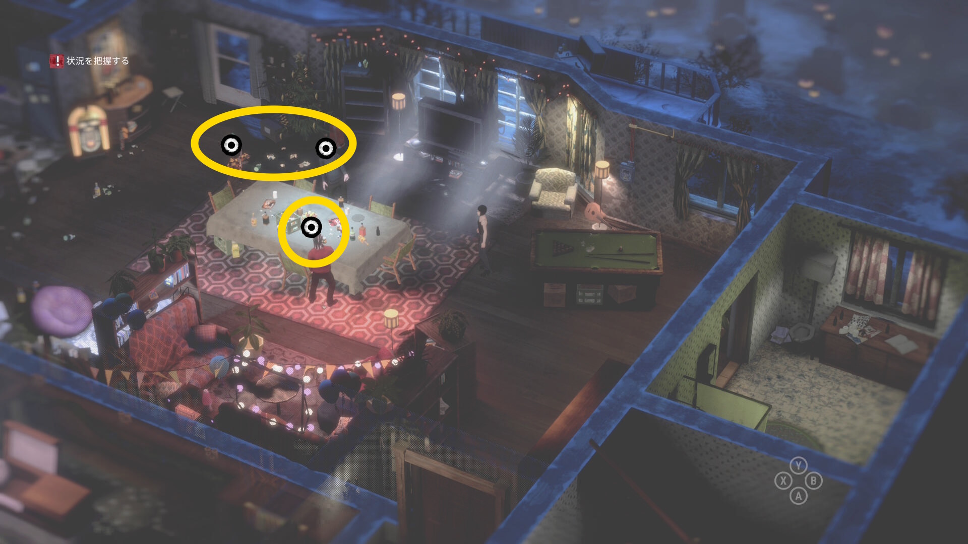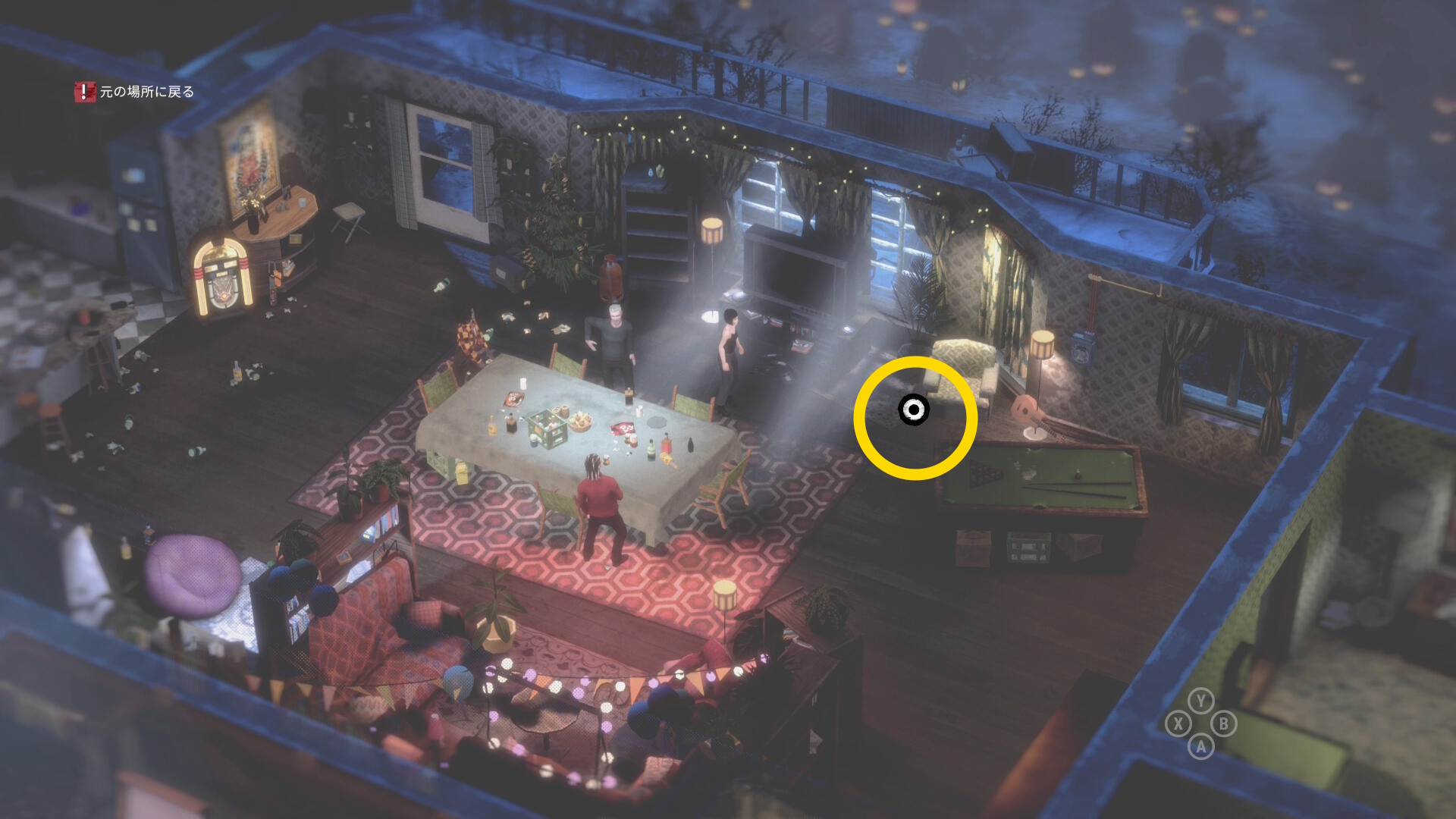 - 3人の状況を把握したらビリヤード台のところに戻る