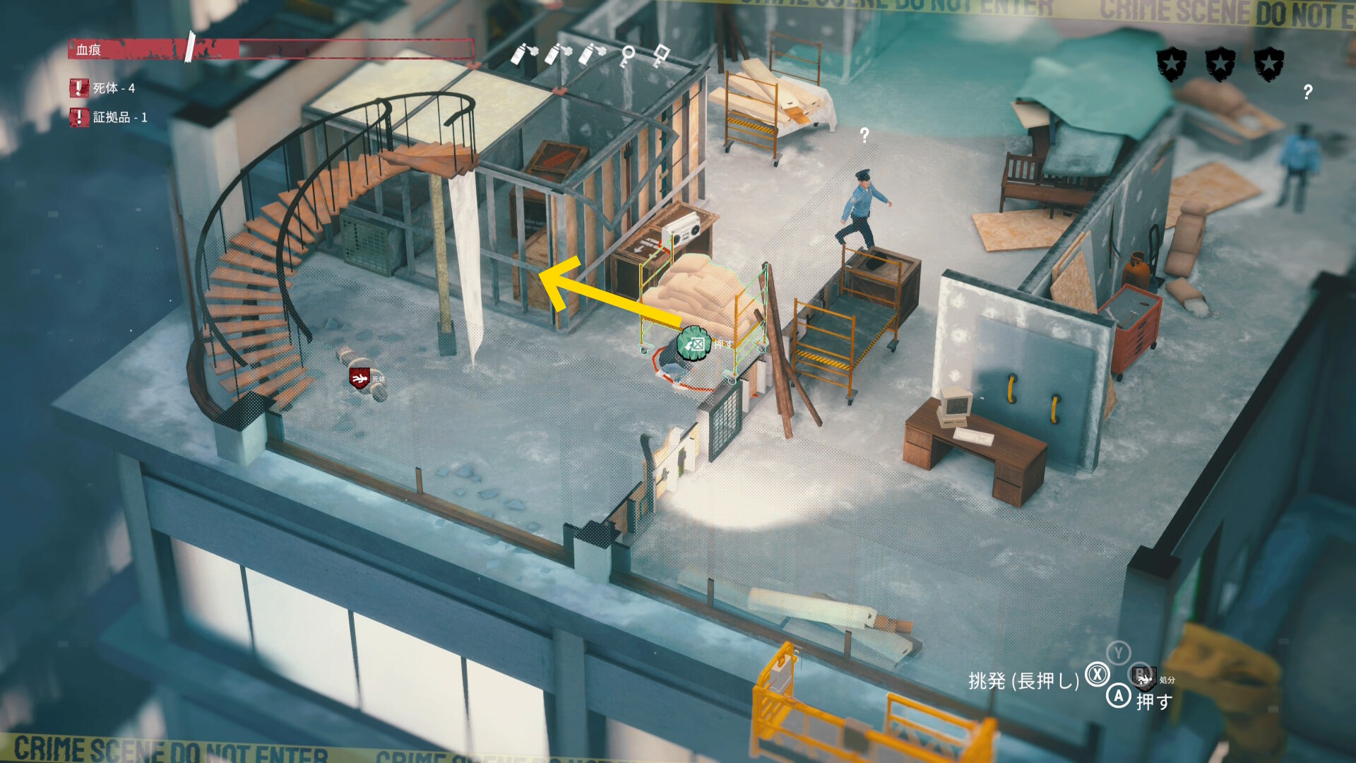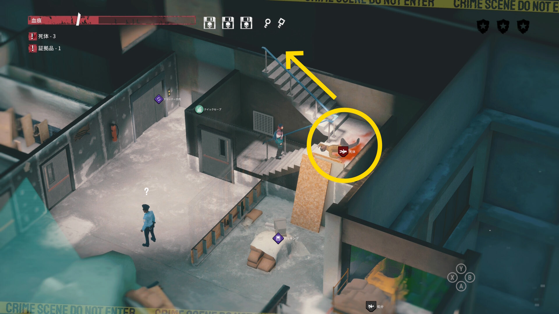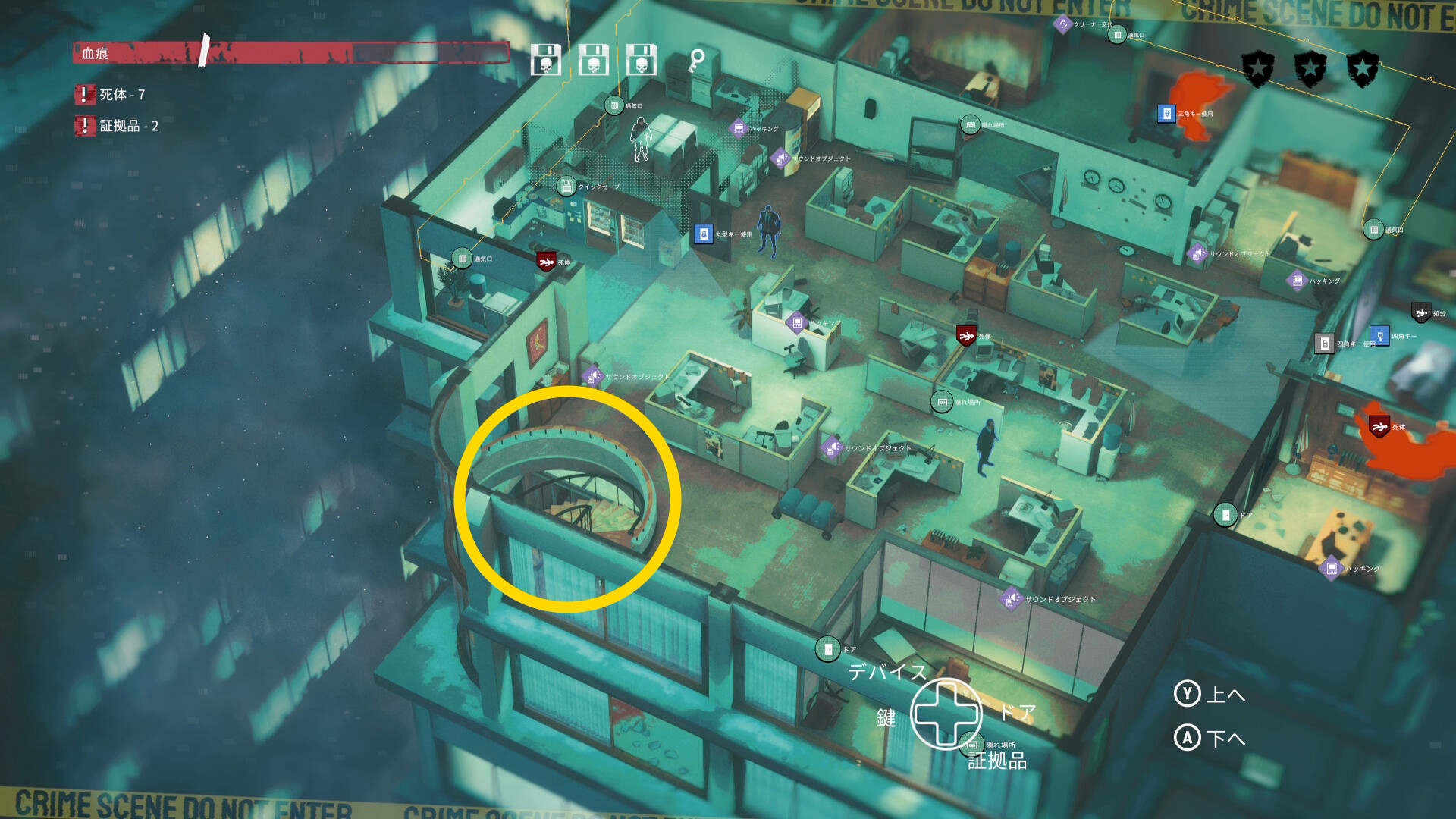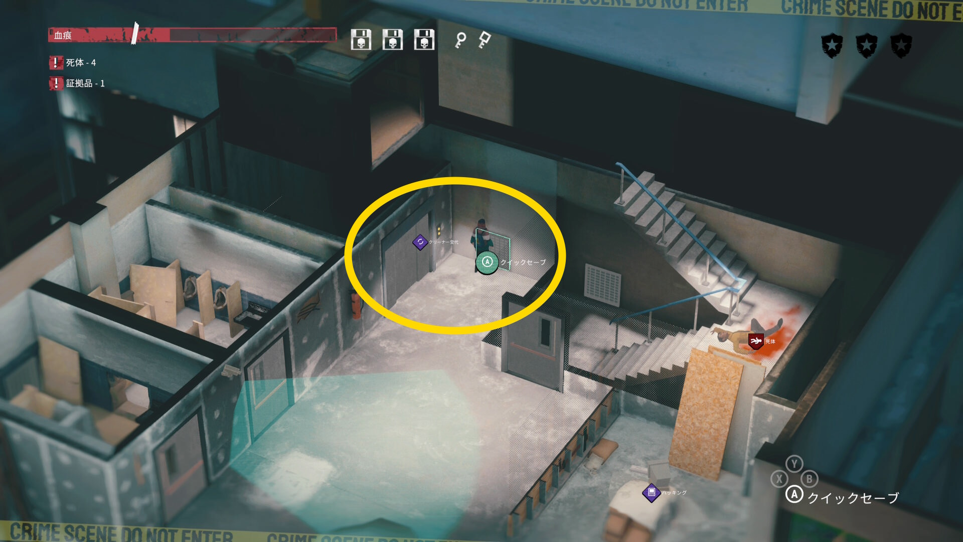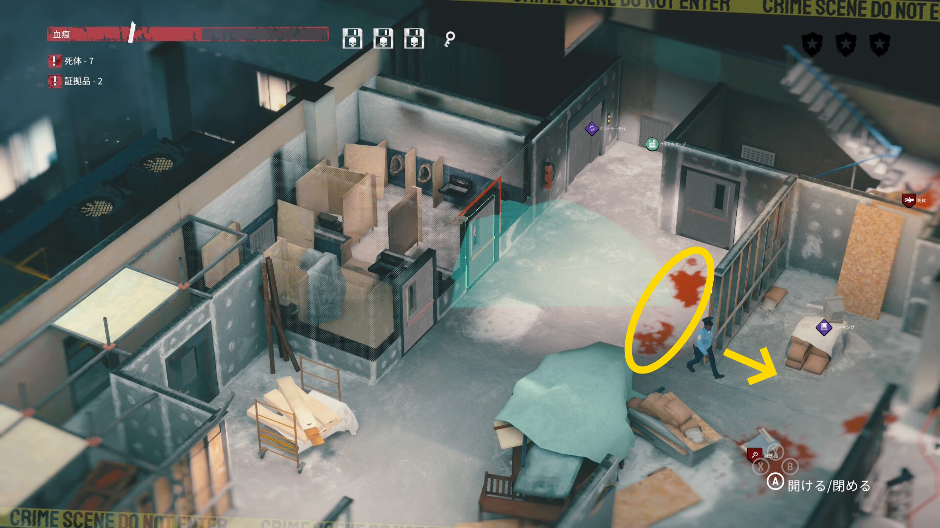 - エリア左側には 6体目の死体 と血痕、証拠品 がある