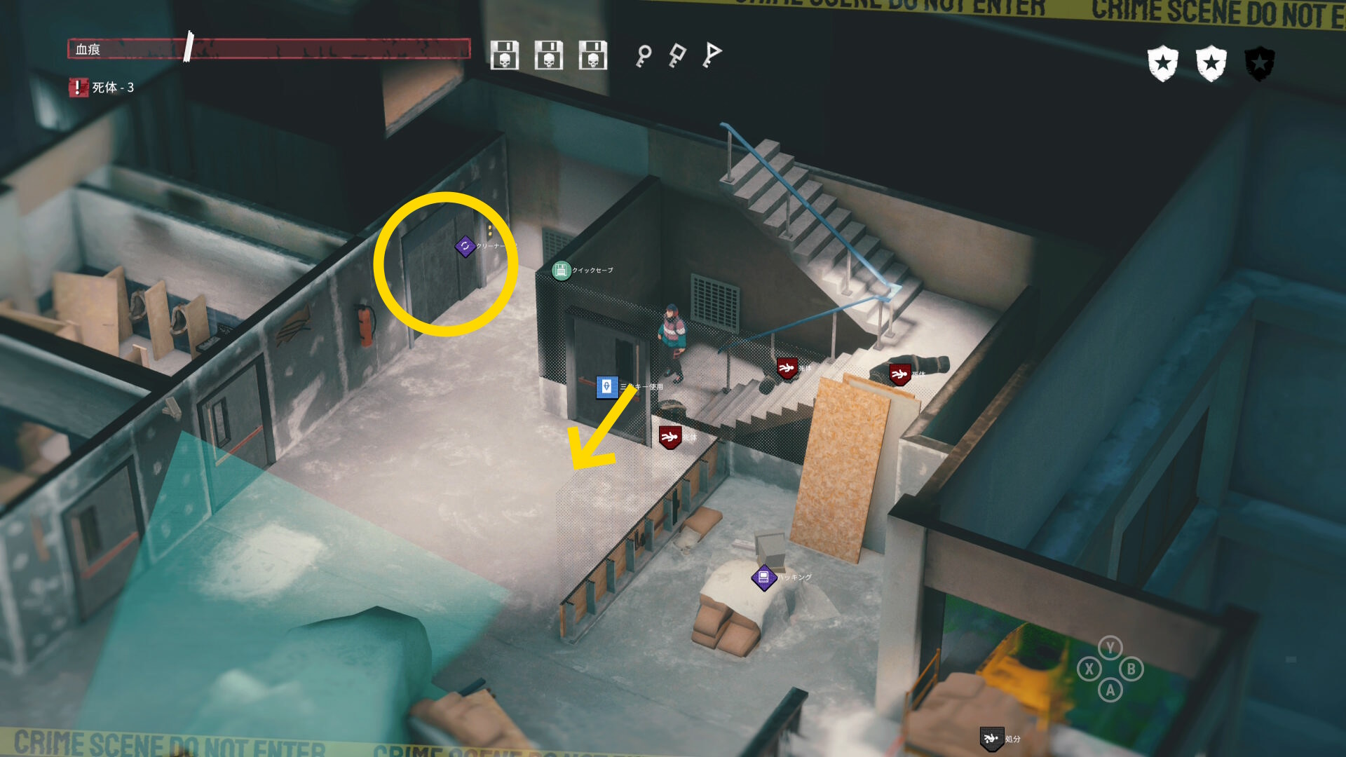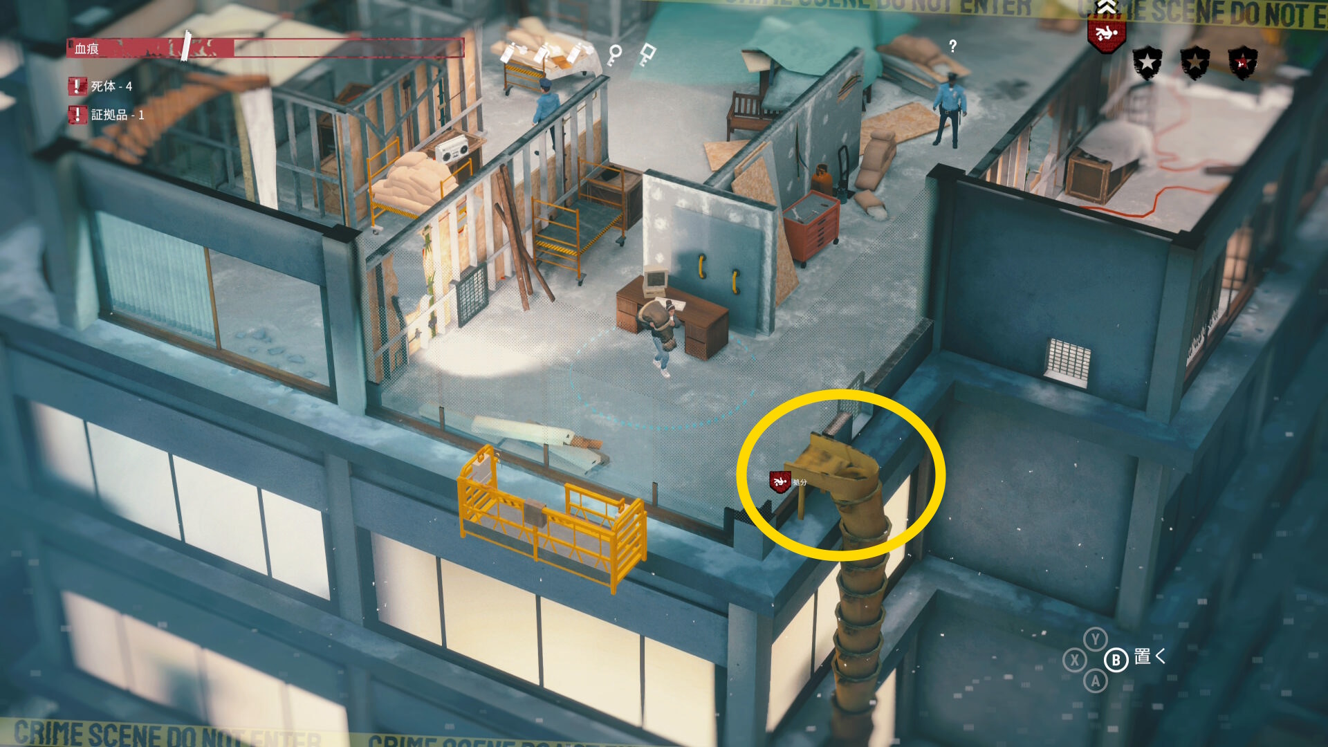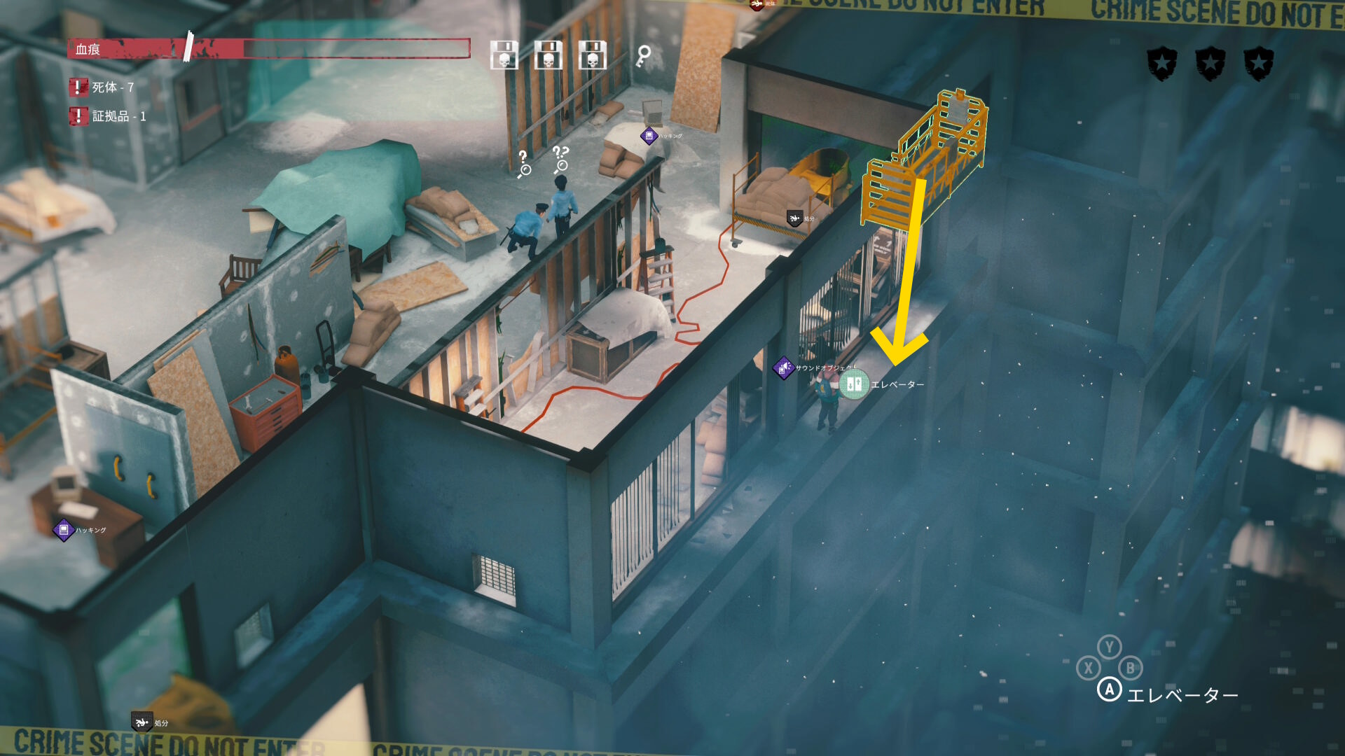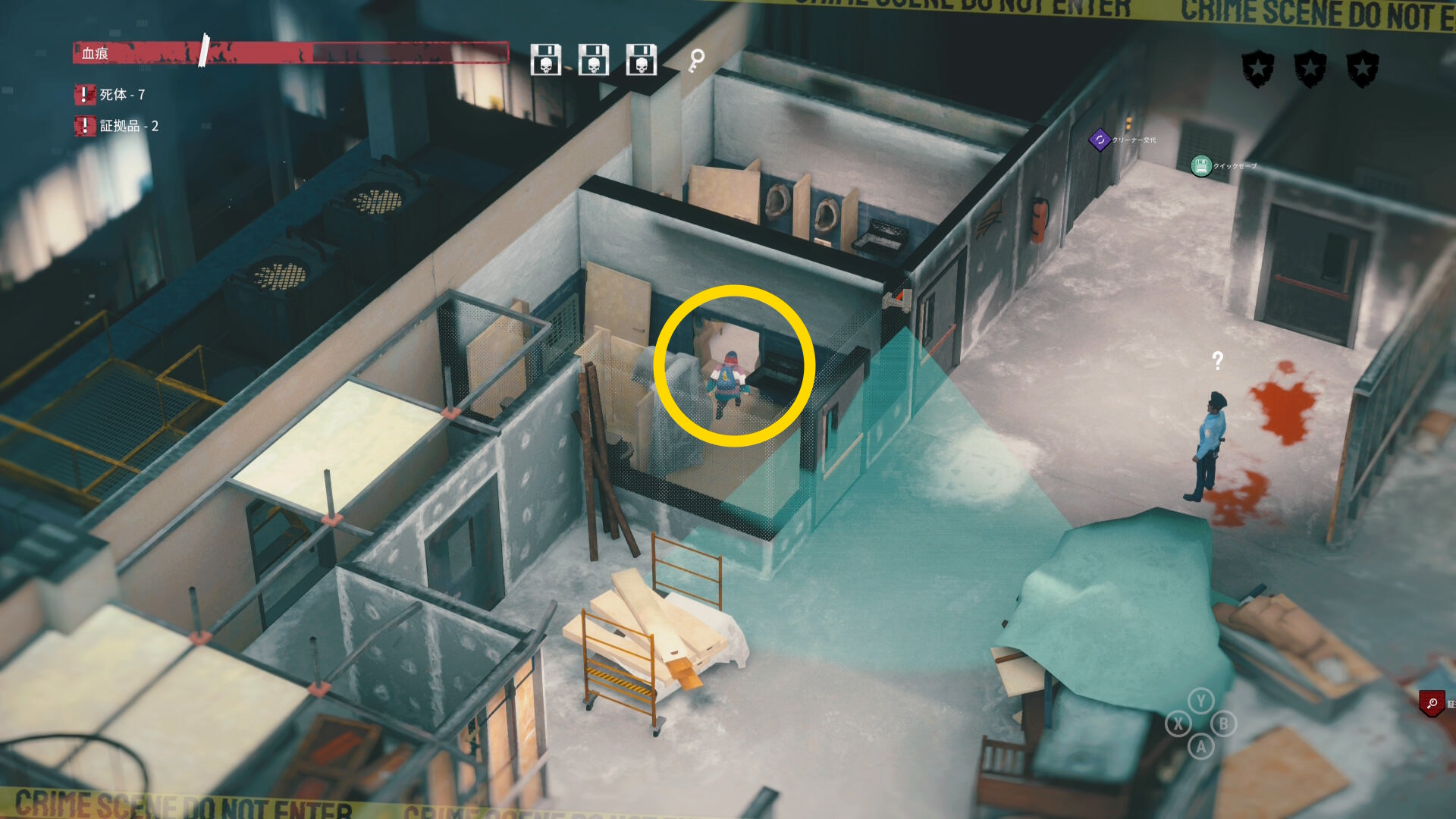 - エリア左側には 6体目の死体 と血痕、証拠品 がある