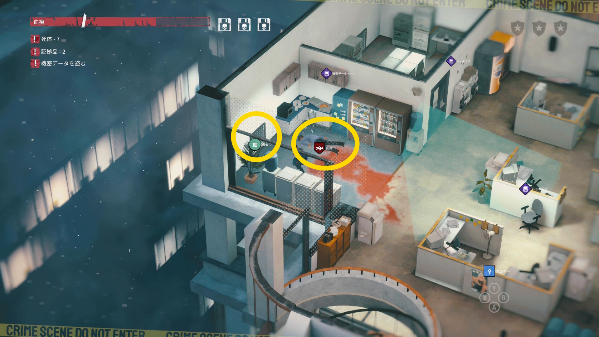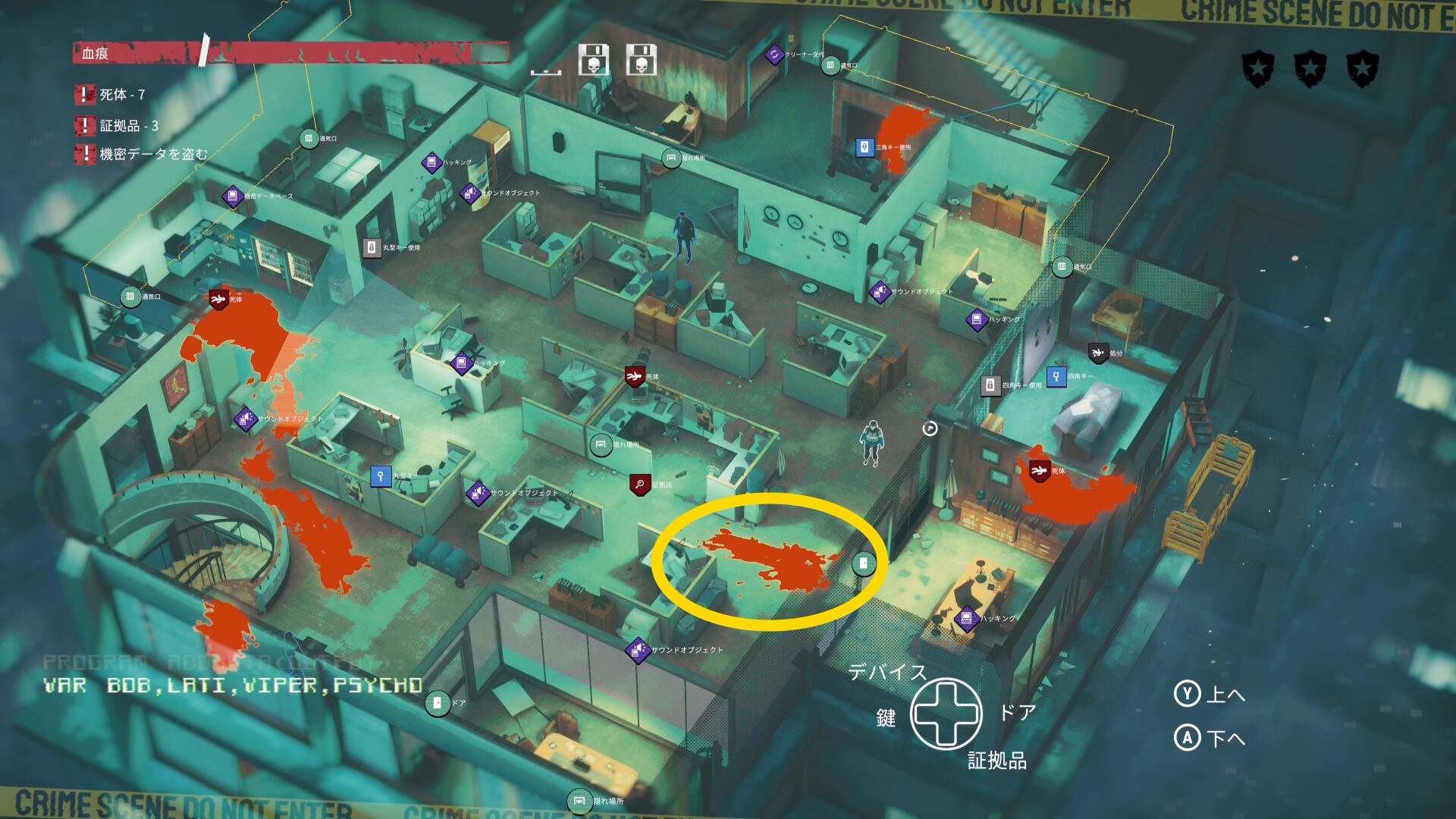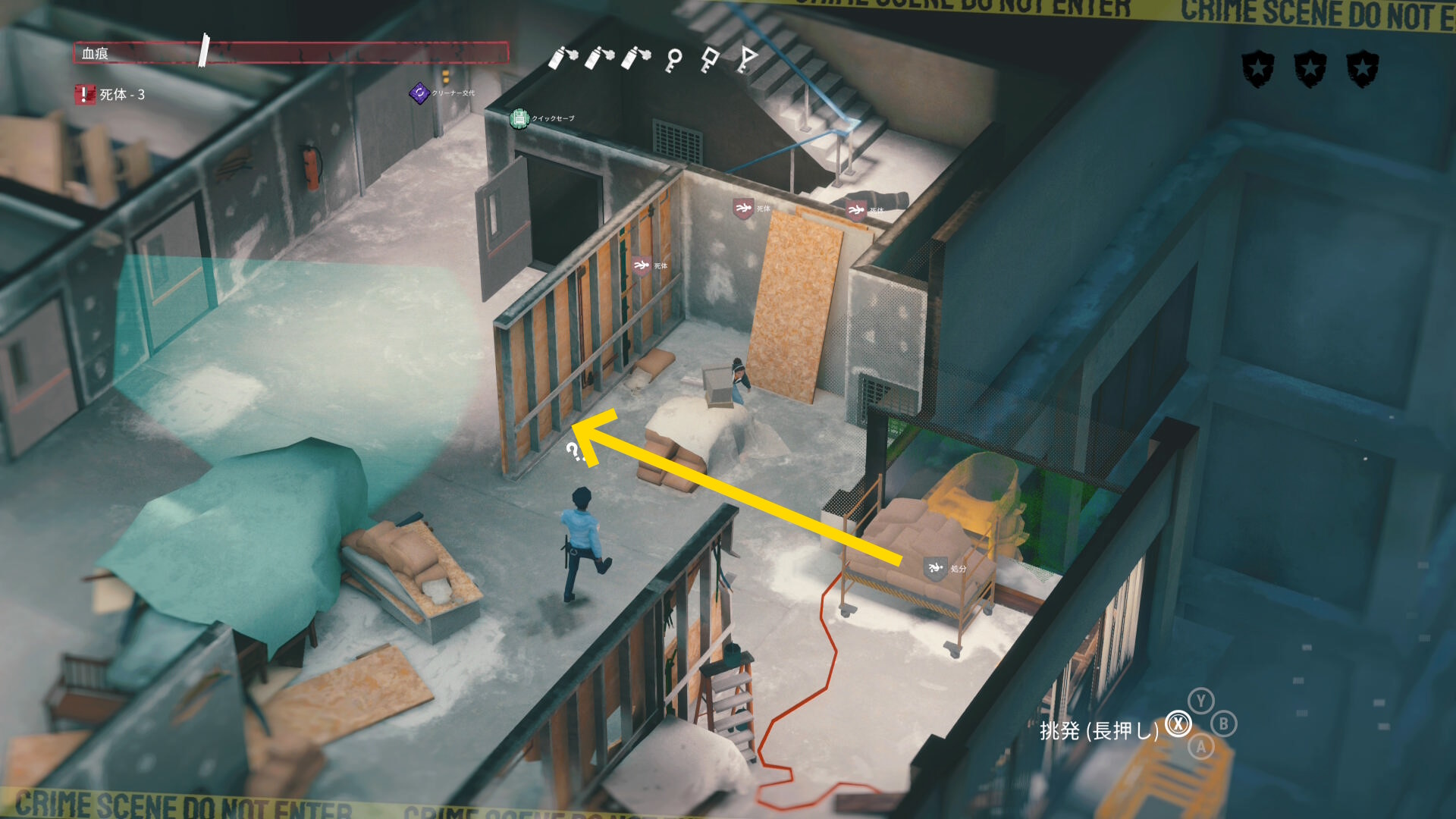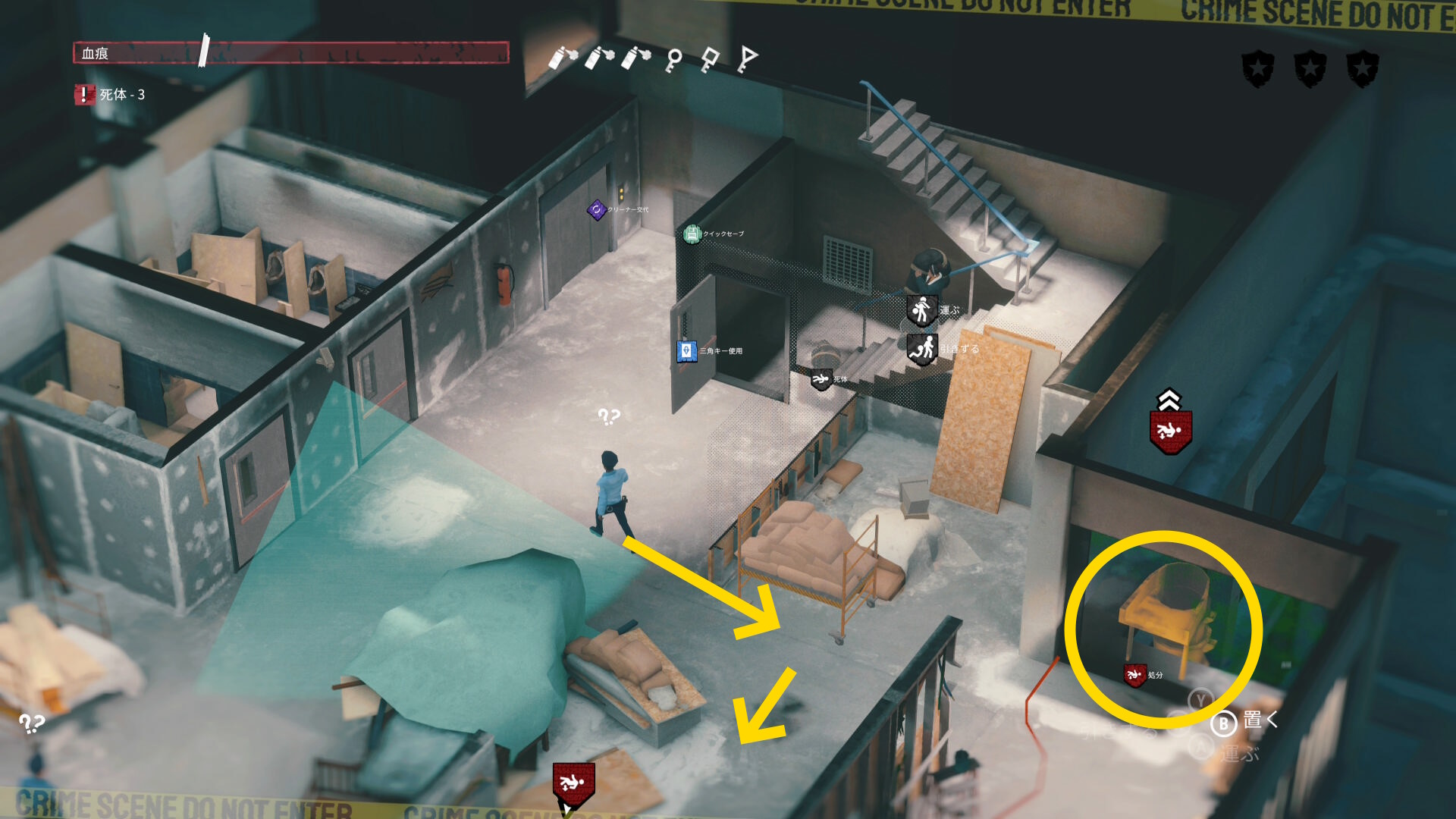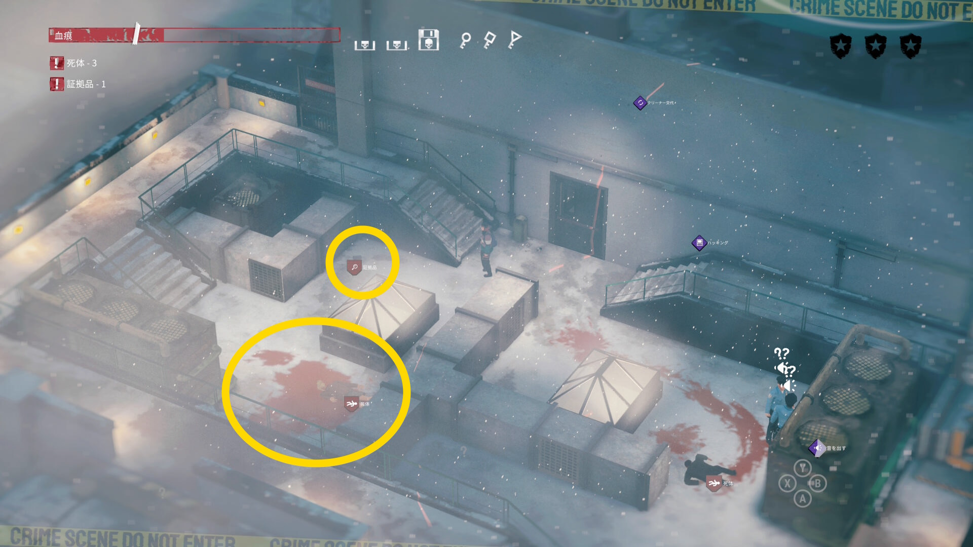 - エリア左側には 6体目の死体 と血痕、証拠品 がある