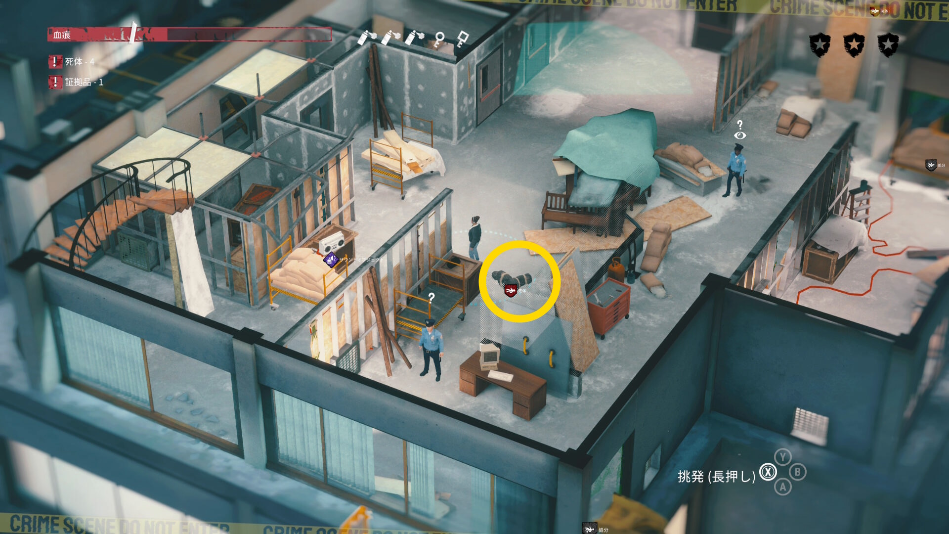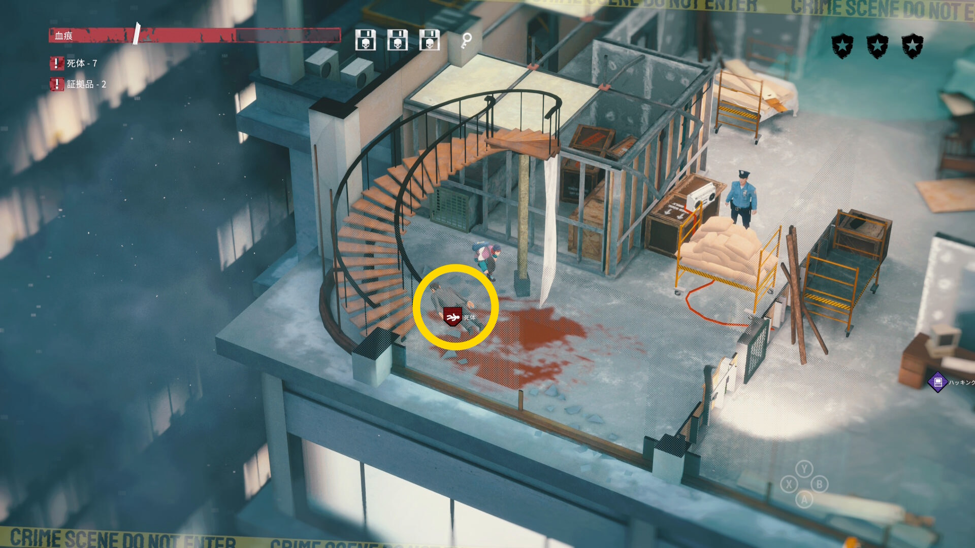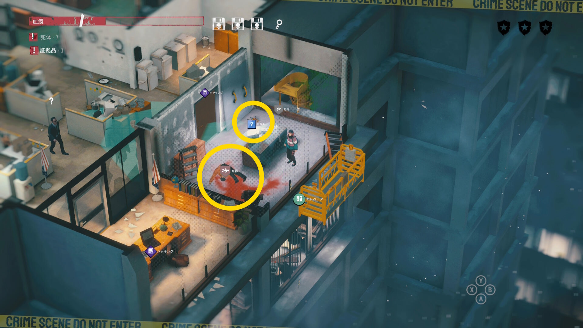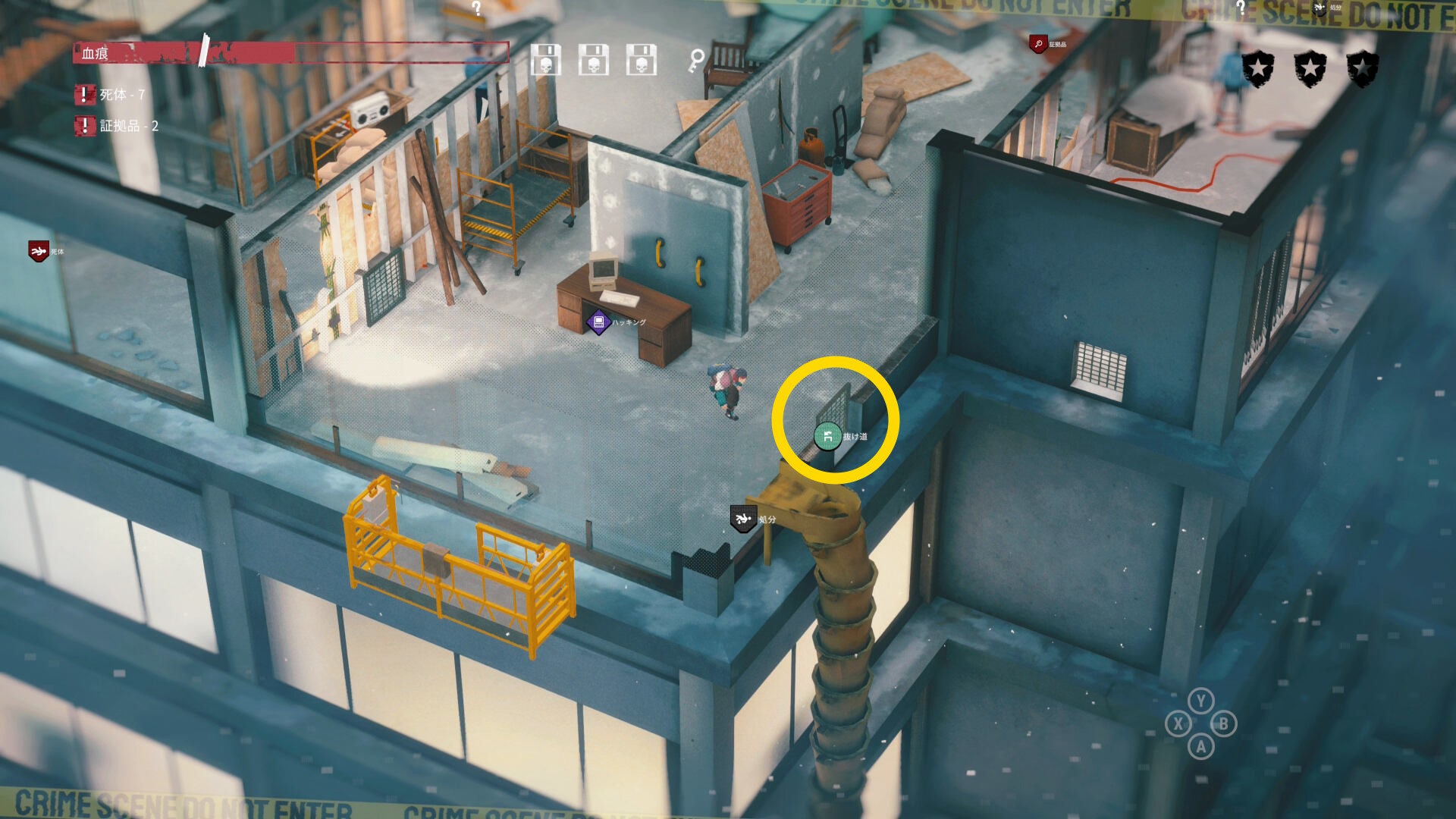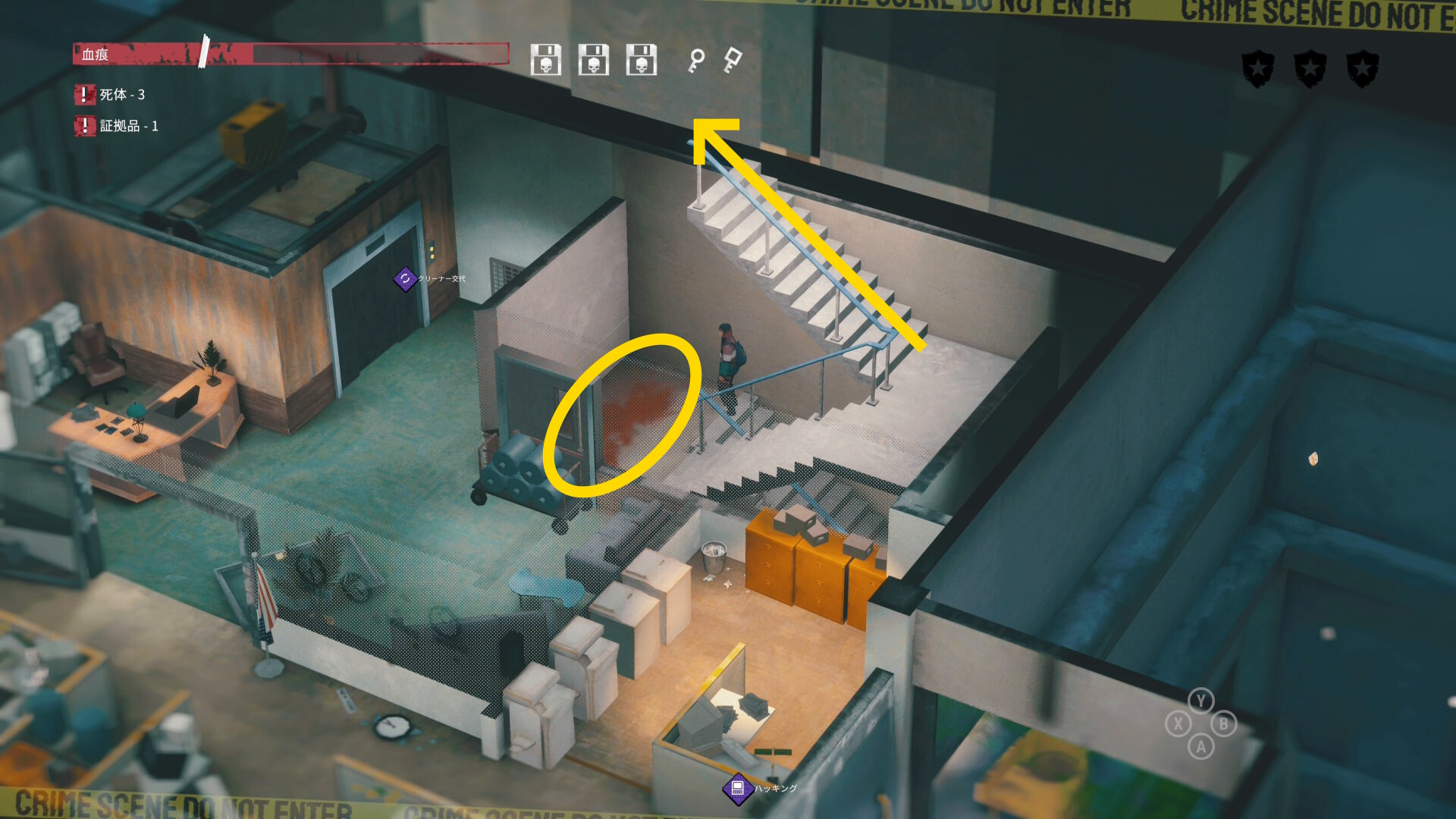 - エリア左側には 6体目の死体 と血痕、証拠品 がある